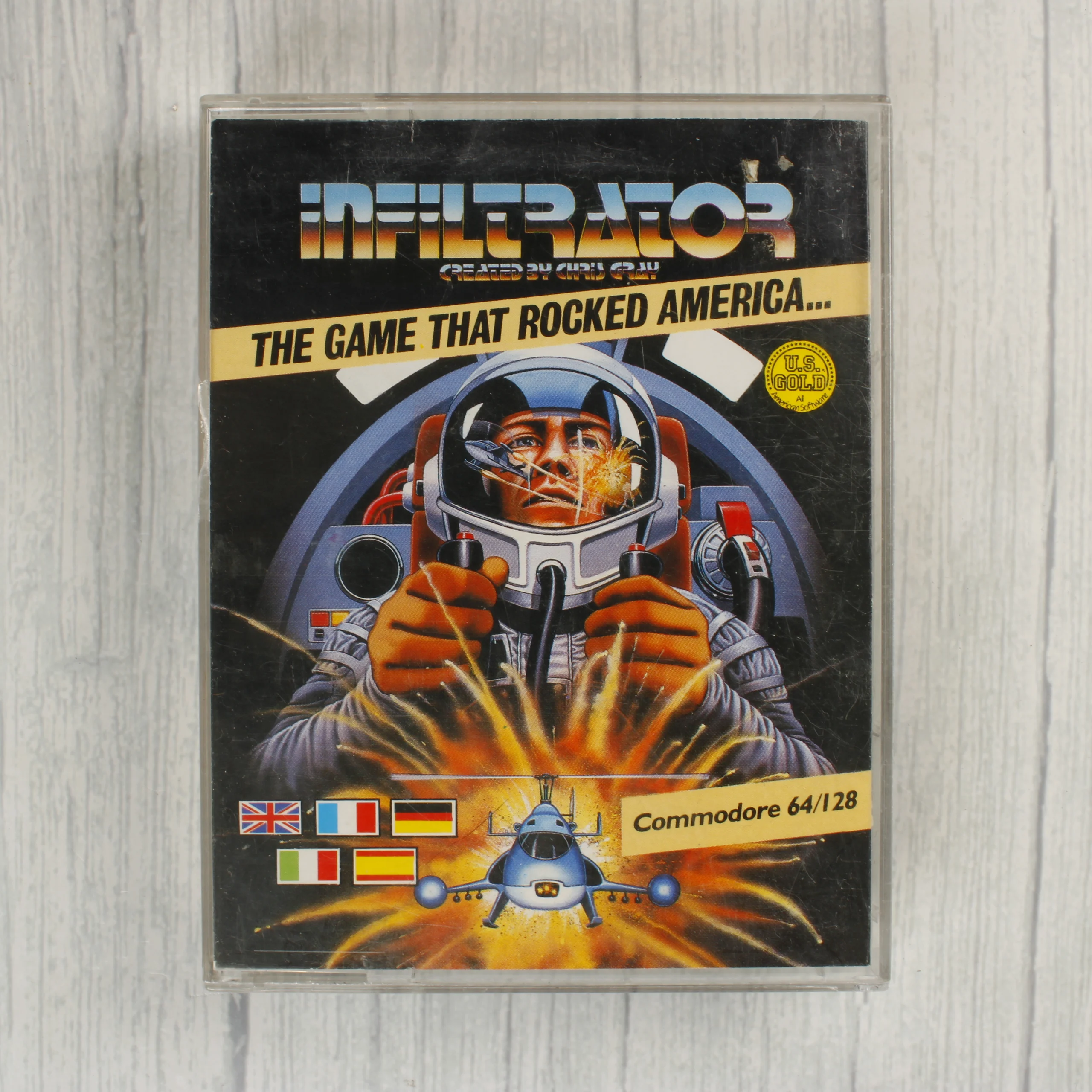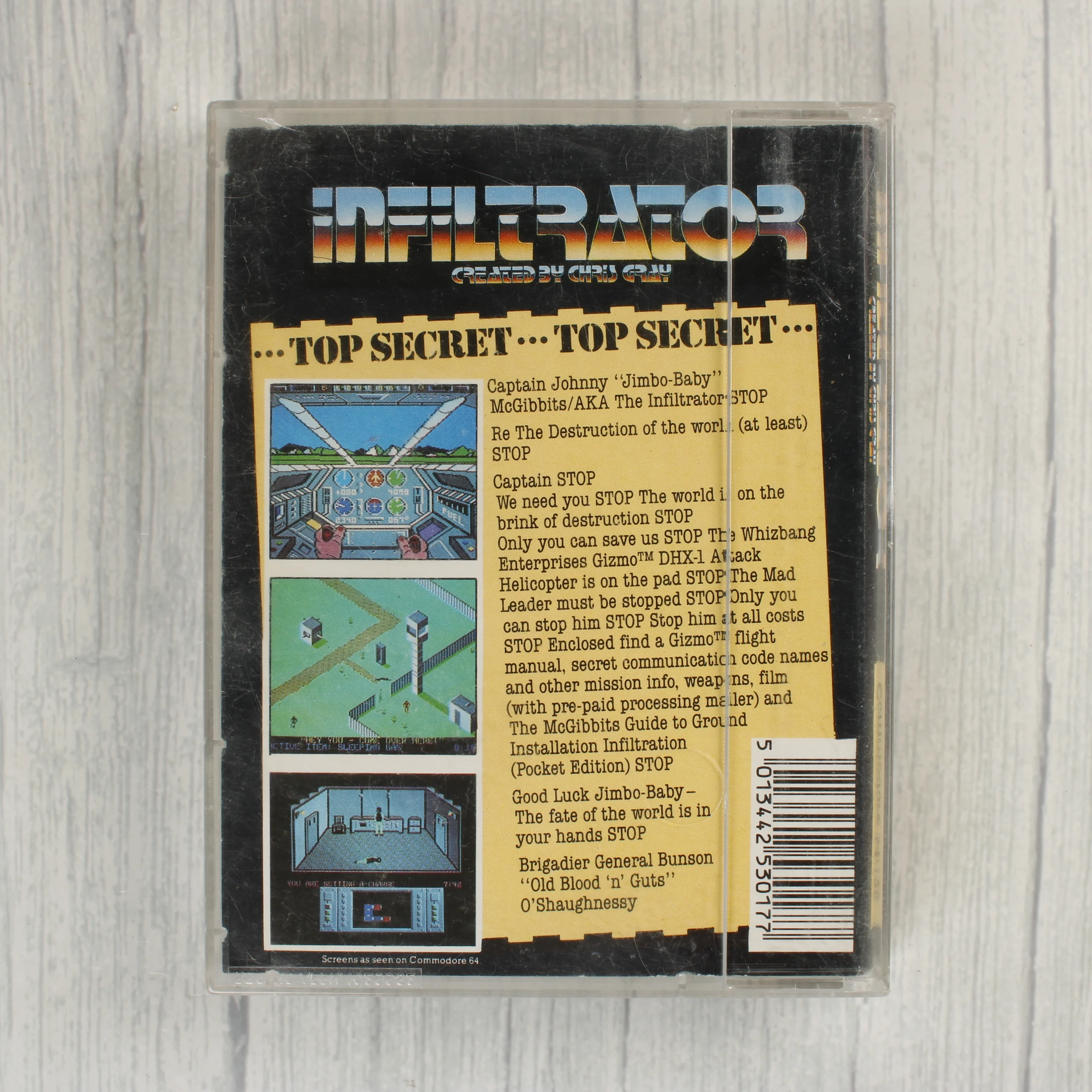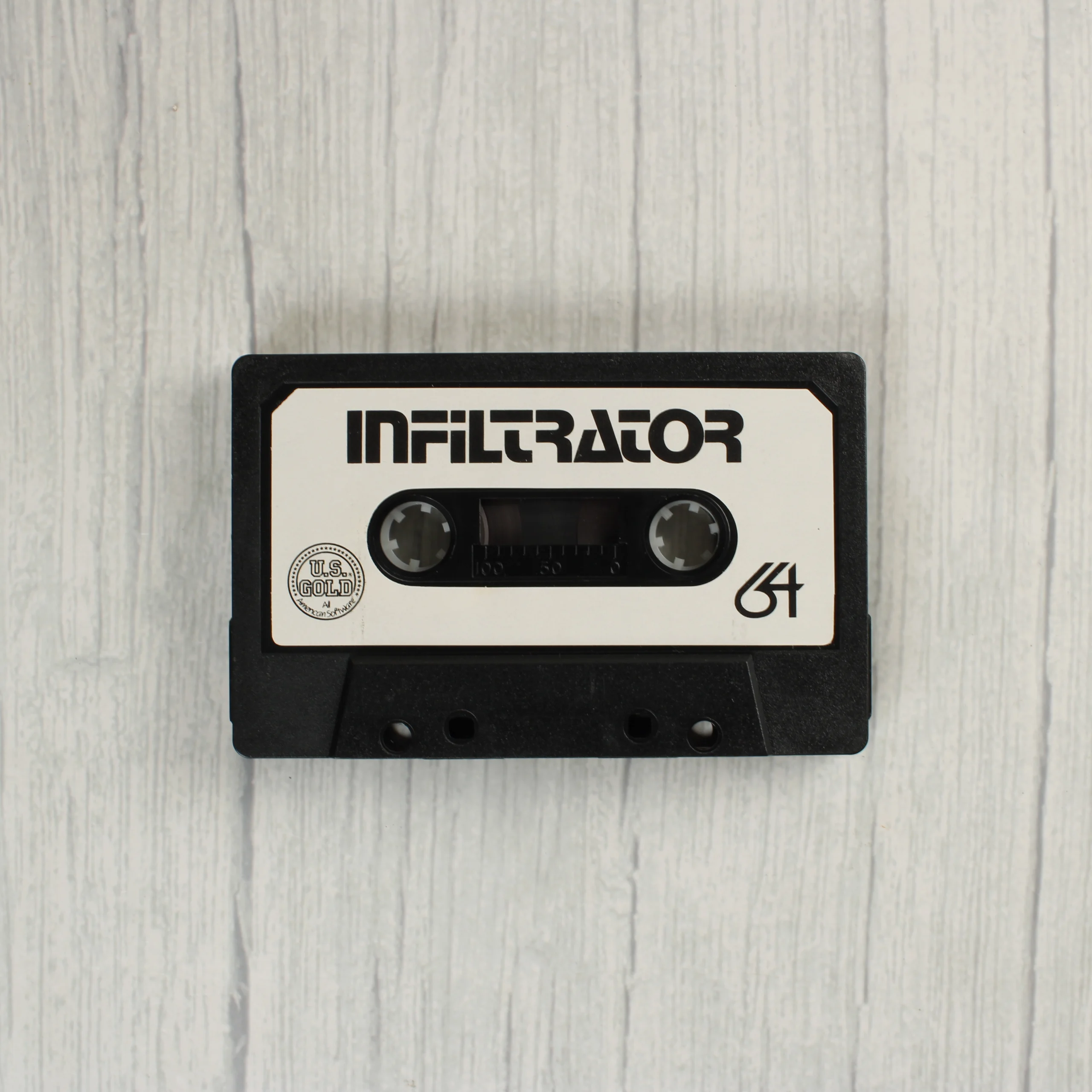 Az Infiltrator egy klasszikus videójáték Commodore 64/128 platformra, amely eredeti műanyag tokban és kazetta formátumban maradt fenn. A borítón egy pilóta látható akció közben, felette a játék címe és a U.S. Gold logója olvasható. A hátoldalon a játékmenetből vett képernyőmentések és egy rövid, távirati stílusban írt történeti leírás található. A fekete színű kazetta fehér címkével rendelkezik, amelyen jól látható a játék címe és a Commodore 64 logója. A csomagolás és a hordozó is korának megfelelő, megkímélt állapotban van, a műanyag tokon apróbb felületi karcok és használati nyomok fedezhetők fel. A borító színei élénkek, a szövegek tisztán olvashatók.