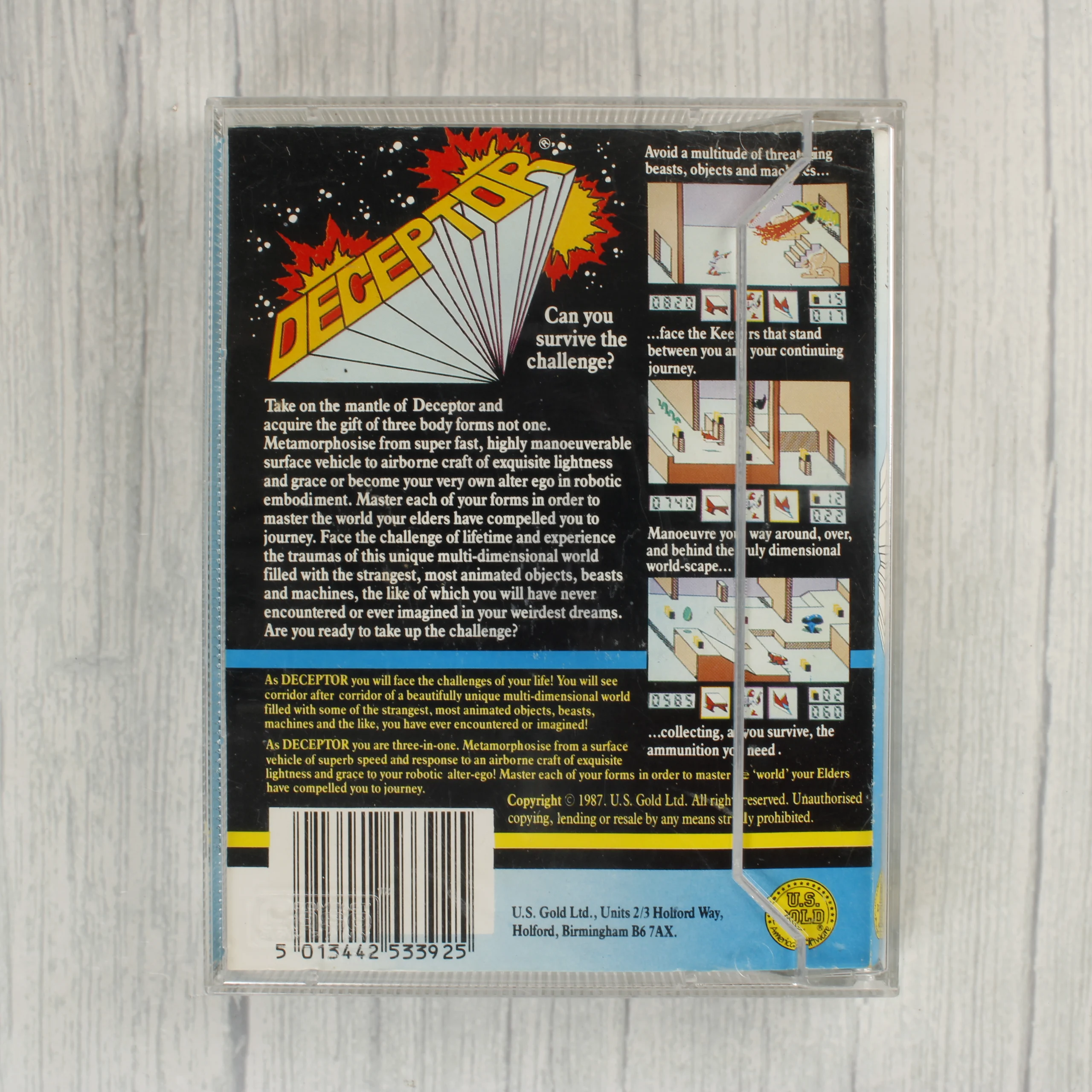 A Deceptor egy 1987-es kiadású videójáték Commodore 64 és 128 rendszerekre, amelyet az U.S. Gold jelentetett meg. A csomag egy átlátszó műanyag tokot tartalmaz, amelyben a színes borító és a fekete színű adathordozó kazetta található. A borító előlapján futurisztikus grafika látható, amely egy robotot és különböző alakváltó formákat ábrázol robbanások kíséretében. A hátoldalon angol nyelvű játékleírás és négy darab színes képernyőkép mutatja be a játékmenetet. A kazetta fehér címkéjén fekete feliratok jelzik a címet és a kompatibilis platformot. A termék fizikai állapota korának megfelelő, a műanyag tokon és a papírborítón kisebb kopások és használati nyomok láthatóak. A kazetta címkéje enyhén elszíneződött a széleken, de a feliratok tisztán olvashatóak maradnak.