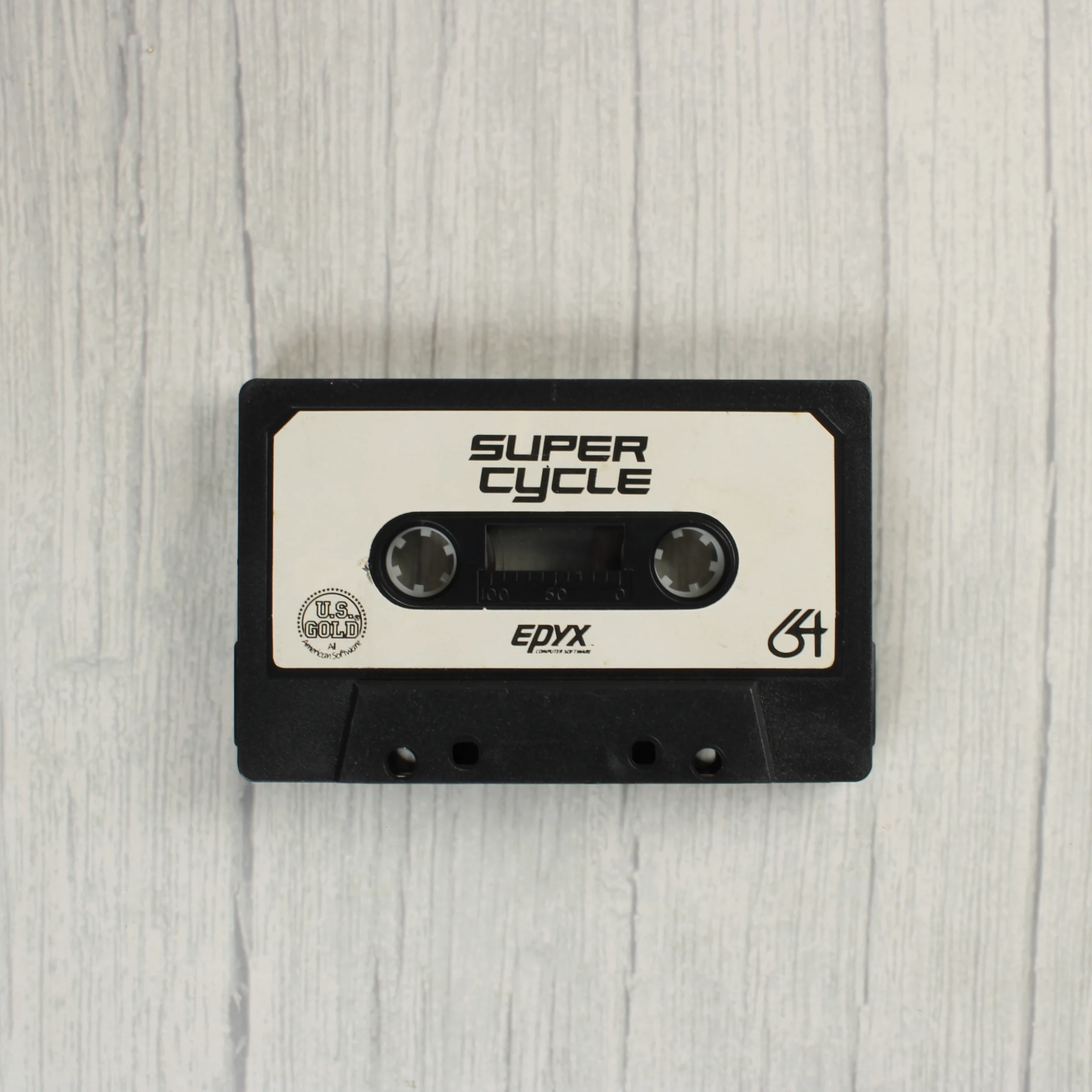 A Super Cycle című videójáték Commodore 64 platformra készült kiadása. A csomag tartalmazza az eredeti műanyag tokot, a színes borítót és a fekete színű mágnesszalagos kazettát. A borító elején egy dinamikus motorversenyt ábrázoló grafika látható, míg a hátoldalon angol nyelvű leírás és két képernyőkép mutatja be a játékmenetet. A kazettán fehér címke található a játék címével, valamint az Epyx és az U.S. Gold logóival. A termék fizikai adathordozója és csomagolása korának megfelelő állapotban van, a műanyag tokon és a papírborítón enyhe sárgulás és használati nyomok figyelhetők meg. A kazetta mechanikailag épnek tűnik, a szalag sértetlen.