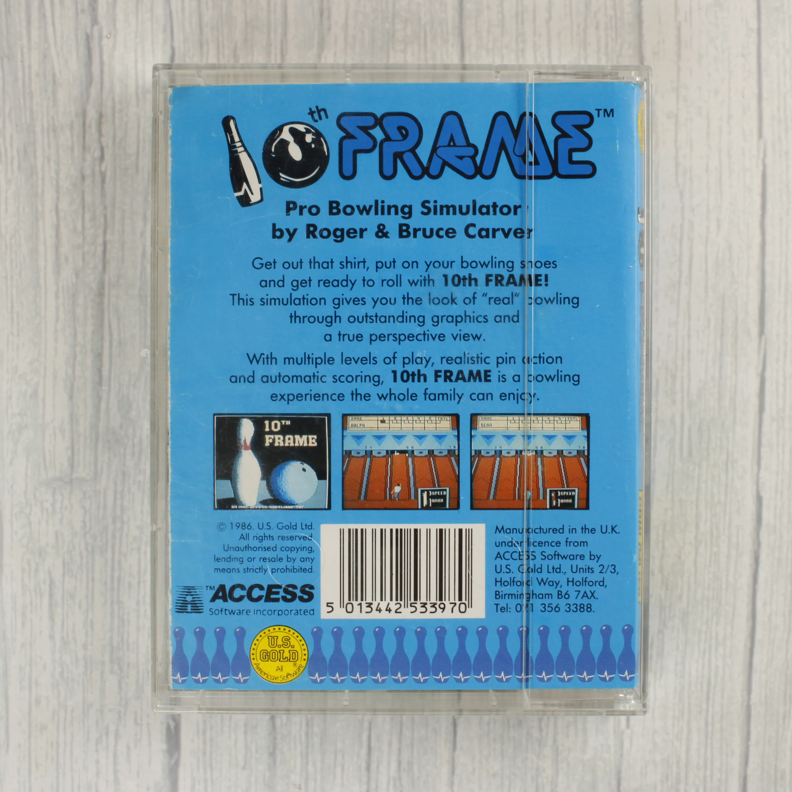 A 10th Frame egy bowling szimulátor videójáték Commodore 64 és 128 rendszerekhez. A csomag tartalmaz egy eredeti műanyag tokot, a színes borítót és egy fekete színű mágnesszalagos kazettát. A borítón dinamikus grafika látható, amely bowling bábukat és egy golyót ábrázol, valamint több európai ország zászlaját. A hátoldalon angol nyelvű leírás és képernyőképek találhatók a játékról. A kazetta fehér címkéjén fekete feliratok és az U.S. Gold logója látható. A termék az 1980-as évekből származik, az Access Software fejlesztette és az U.S. Gold adta ki. A fizikai hordozó és a papírborító állapota megkímélt, a tokon minimális használati nyomok fedezhetők fel.