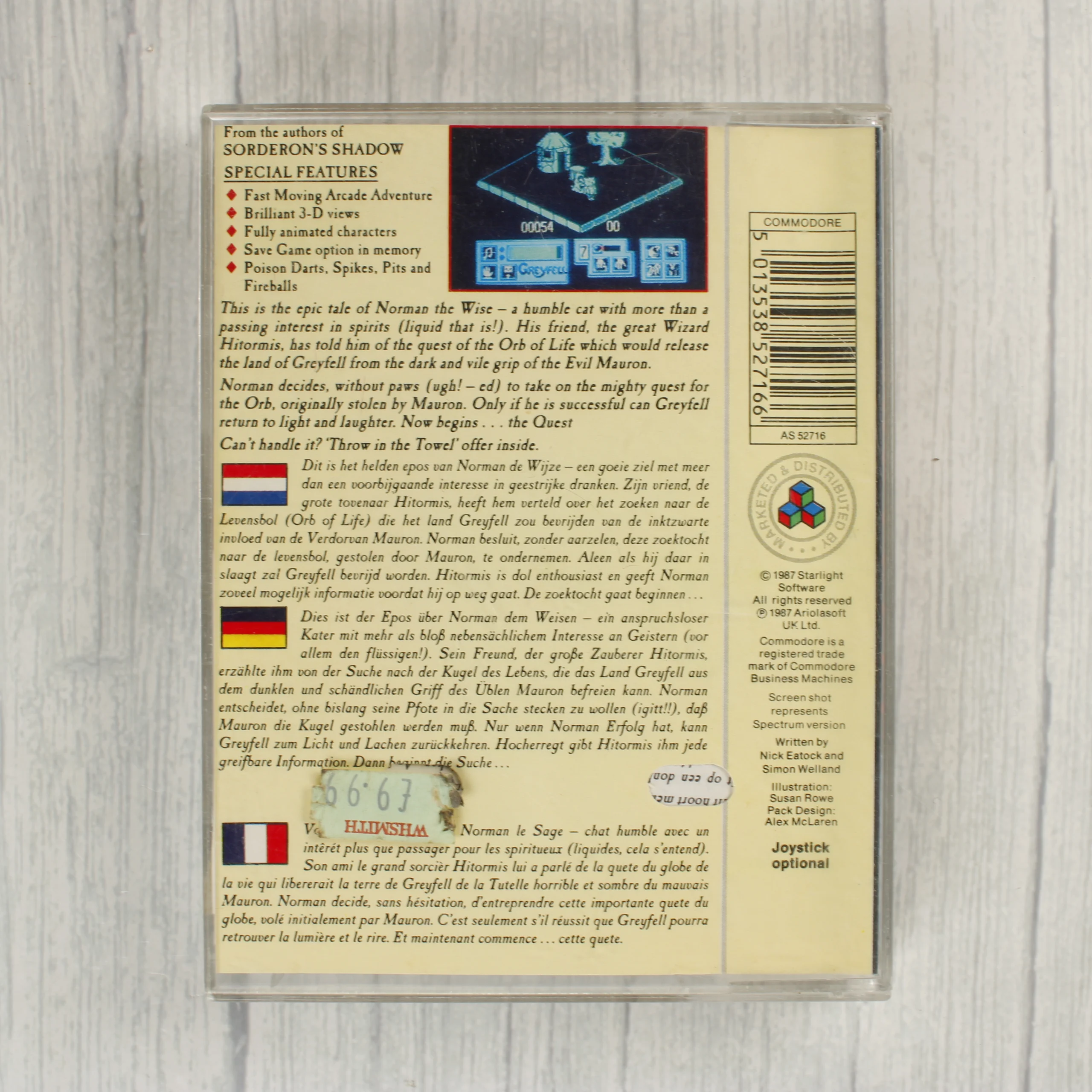 A Greyfell: The Legend of Norman egy 1987-es kiadású videójáték Commodore 64 és 128 rendszerekhez. A csomag egy átlátszó műanyag tokot tartalmaz, amelyben az eredeti borító és egy fekete színű, sárga címkés kazetta található. A borító előlapján színes illusztráció látható egy macskaszerű karakterrel, a hátoldalon pedig többnyelvű leírás és egy képernyőkép olvasható. A kazetta címkéjén piros feliratok és apró karaktergrafikák szerepelnek, valamint a betöltéshez szükséges utasítások. A termék a Starlight Software gondozásában jelent meg. A műanyag tokon és a borítón az idő múlására utaló jelek, például egy régi árcímke maradványa látható a hátoldalon.
