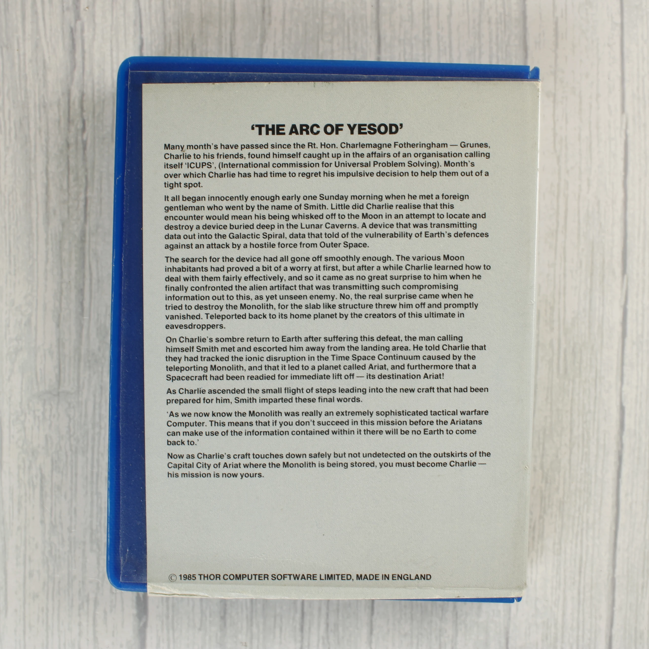 A The Arc of Yesod egy 1985-ös kiadású videójáték Commodore 64 és 128 platformokra. A termék egy kék színű műanyag tokban található, amely tartalmazza az eredeti papírborítót és a fekete színű mágnesszalagos kazettát. A borító előlapján sci-fi stílusú grafika látható egy űrhajóval és egy idegen tájjal, a hátoldalon pedig angol nyelvű leírás olvasható a játék történetéről. A kazettán türkizkék címke található fehér feliratokkal és a Thor Computer Software Ltd. logójával. A csomagolás és a hordozó fizikai állapota korának megfelelő, a papírborítón enyhe sárgulás és használati nyomok láthatóak.