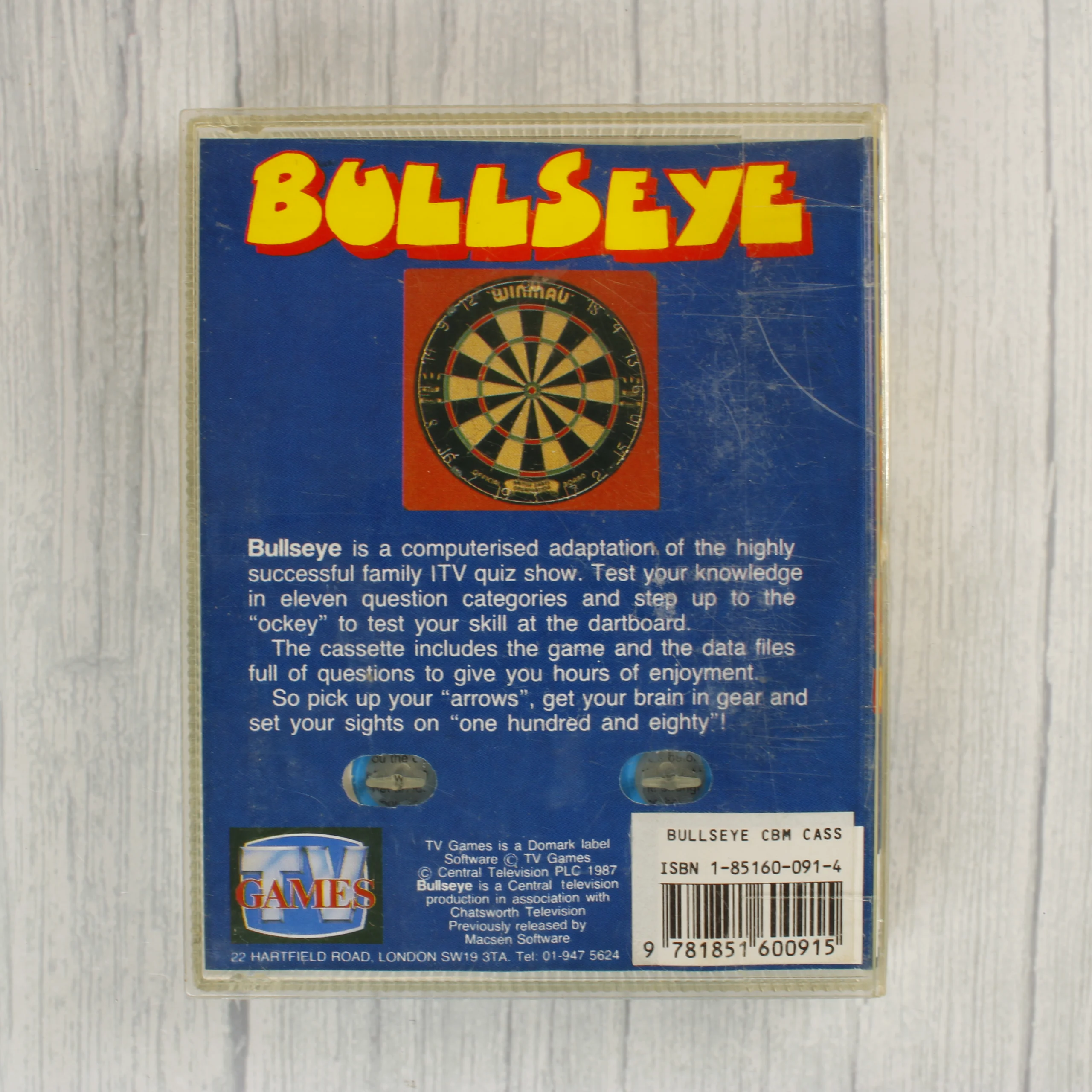 A Bullseye egy Commodore 64 platformra megjelent videójáték, amely az azonos című brit televíziós kvízműsor alapján készült. A csomag tartalmaz egy kék színű műanyag kazettát, amelyen fehér alapon piros feliratok láthatóak, valamint egy átlátszó műanyag tokot a hozzá tartozó színes papírborítóval. A borító előlapján a műsor kabalafigurája, Bully látható egy televízió képernyőjén, míg a hátoldalon a játék leírása és egy céltábla képe szerepel. A kiadvány a TV Games gondozásában jelent meg 1987-ben. A fizikai hordozó és a papír alapú kiegészítők állapota korának megfelelő, a műanyag tokon használatból eredő karcok és kopások figyelhetőek meg.