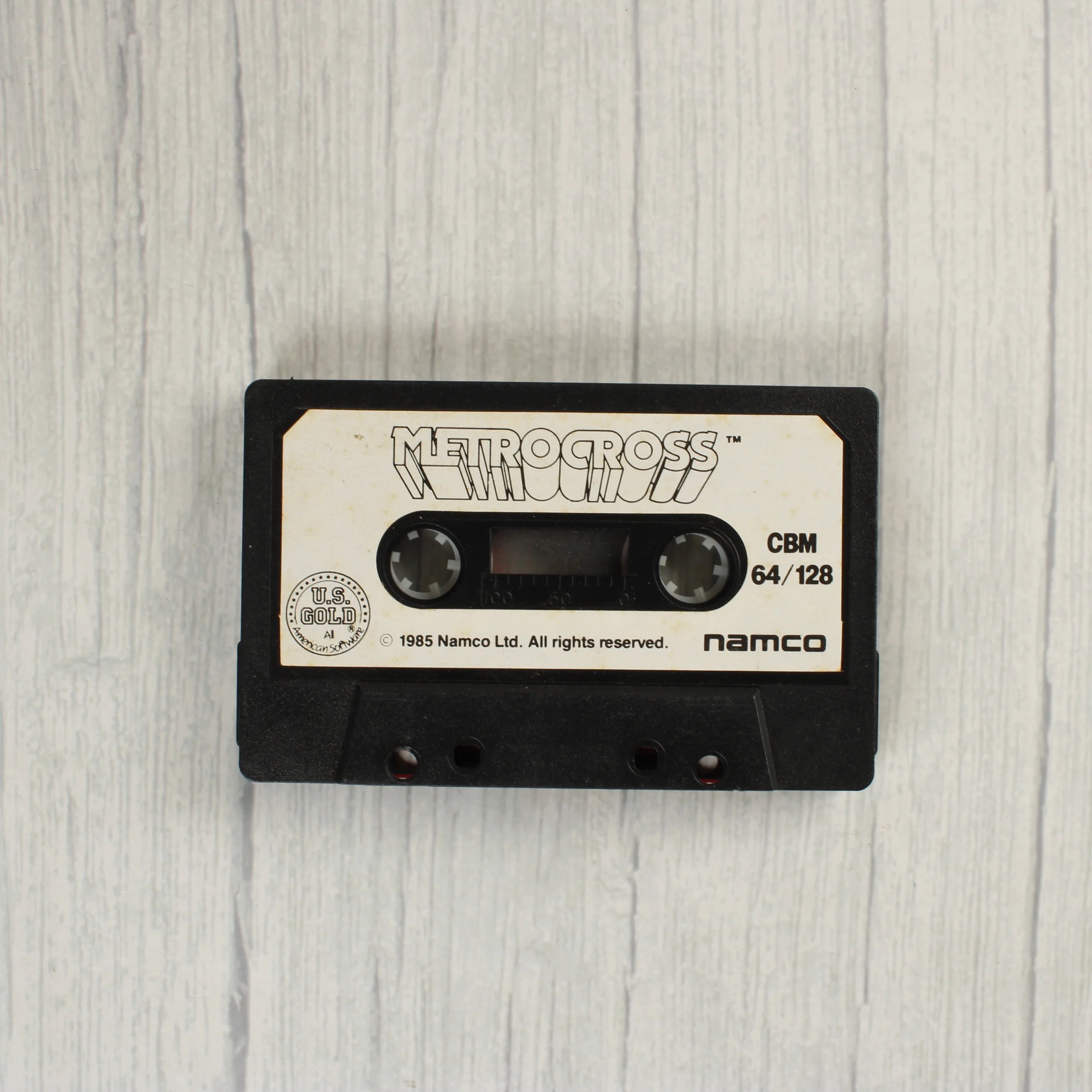 A Metro-Cross című videójáték Commodore 64 és 128 rendszerekre készült kiadása. A csomag tartalmazza az eredeti műanyag tokot, a színes borítót és a fekete színű mágnesszalagos kazettát. A borító előlapján egy futurisztikus vörös páncélt viselő alak látható akció közben, felette a játék logójával és a U.S. Gold, valamint a Namco emblémájával. A hátoldalon angol nyelvű leírás és két képernyőkép látható a játékmenetből. A kazetta fehér címkével rendelkezik, amelyen fekete feliratok jelzik a címet és a jogtulajdonosokat. A termék az 1980-as évek közepéről származó klasszikus ügyességi játék otthoni számítógépes változata.