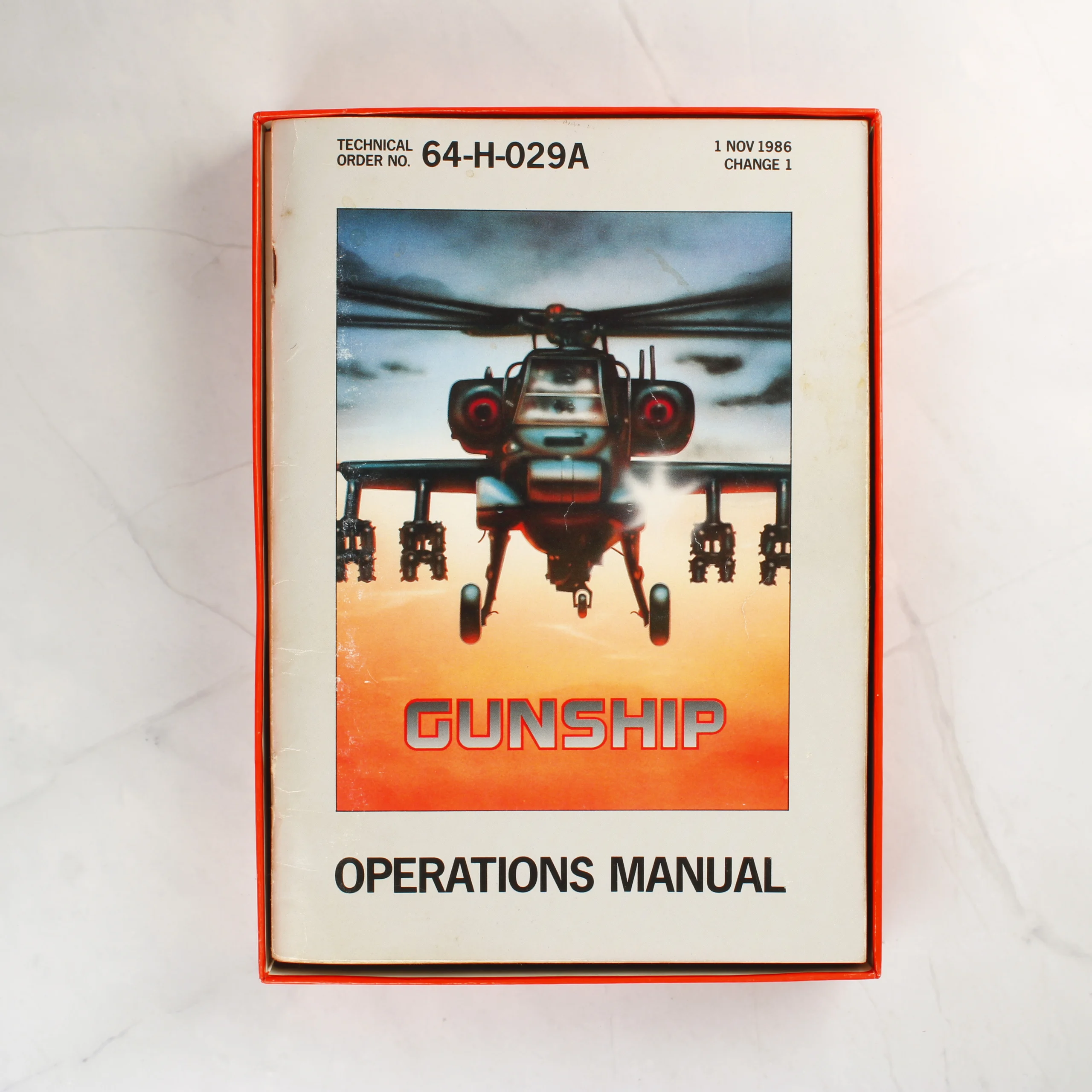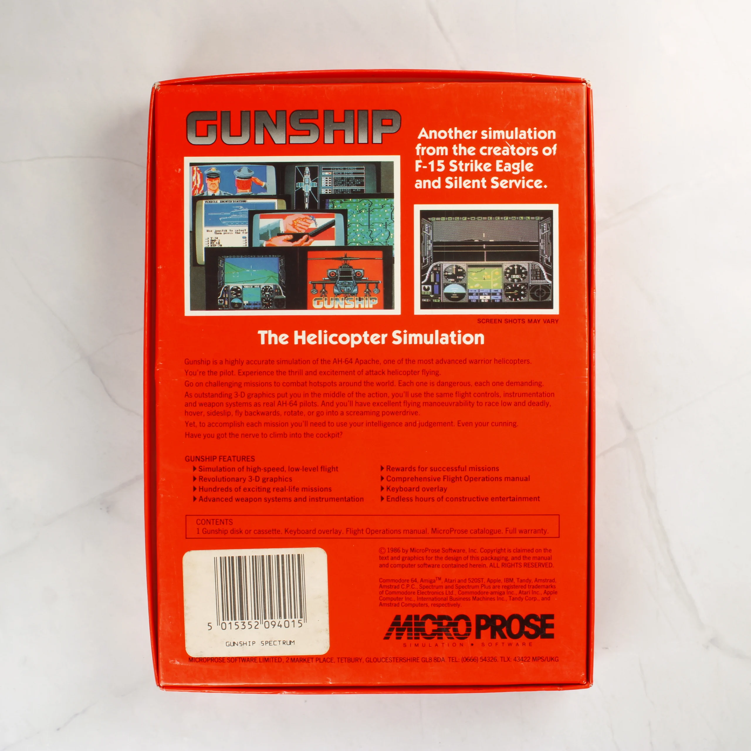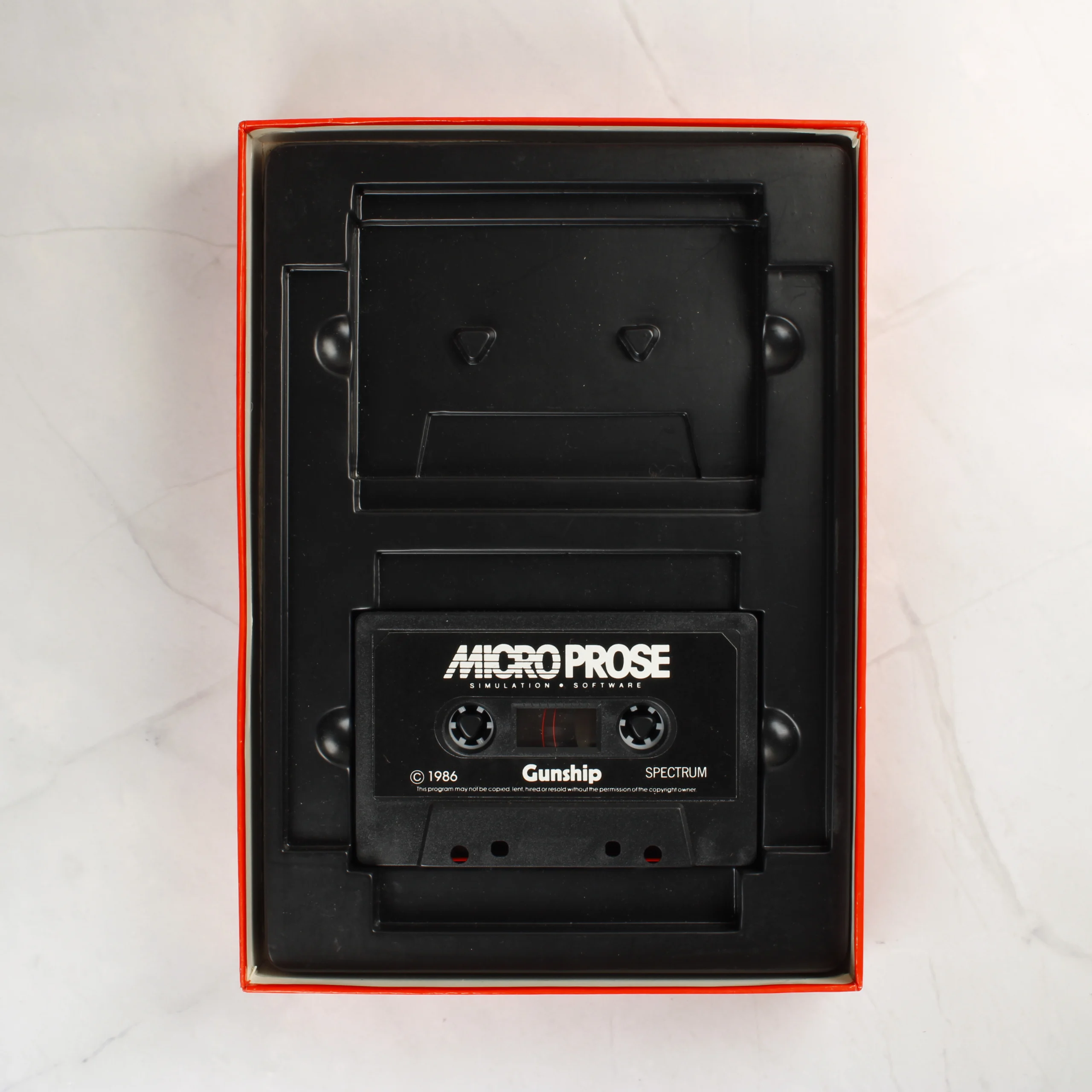 A MicroProse által kiadott Gunship videójáték ZX Spectrum 48/128K platformra készült kiadása. A csomag egy piros alapszínű, kartonból készült dobozt tartalmaz, amelynek elején egy AH-64 Apache helikopter látható akció közben. A dobozban egy fekete műanyag tálca található, amelyben egy darab fekete színű kazetta kapott helyet, a második kazetta helye üres. A készlet része egy fehér borítójú, Operations Manual feliratú használati útmutató is, amelyen szintén a helikopter grafikája szerepel. A doboz hátoldalán a játékból vett képernyőmentések és angol nyelvű leírás olvasható. A csomagoláson fehér matricák jelzik a kompatibilitást és a kazetták számát. A papírdoboz élei mentén enyhe kopás és használati nyomok láthatóak.