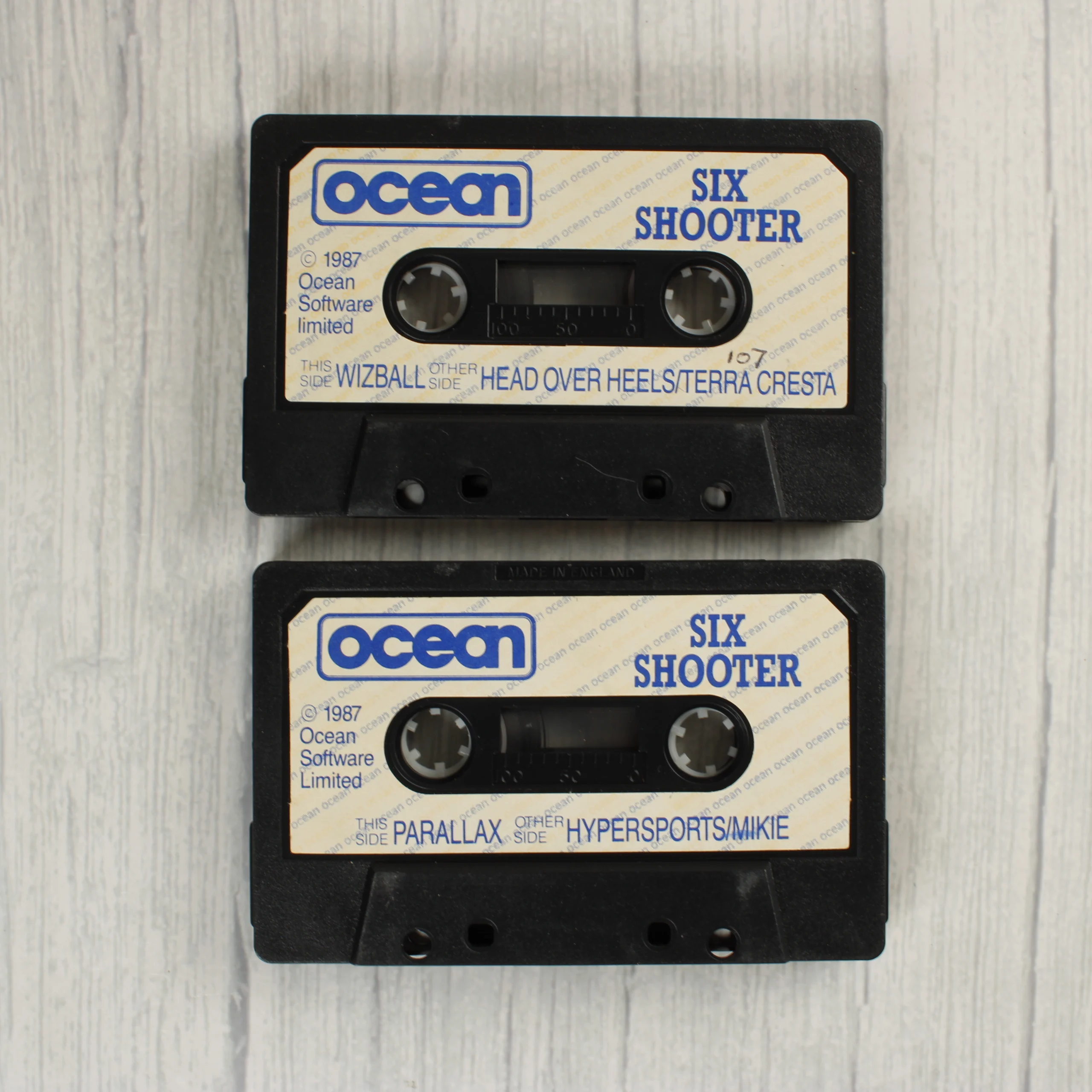 A Six Shooter egy videójáték-válogatás Commodore 64 és 128 rendszerekhez, amelyet az Ocean Software adott ki 1987-ben. A csomag két darab fekete műanyag kazettát tartalmaz, amelyeken összesen hat klasszikus játék kapott helyet: Wizball, Head Over Heels, Terra Cresta, Parallax, Hypersports és Mikie. A kazetták fehér címkével rendelkeznek, amelyeken kék feliratok és az Ocean logója látható. A sárga alapszínű papírborítón a játékok illusztrációi és a címek szerepelnek. A készlet egy vastag, fekete hátoldalú műanyag tokban található, amelynek gerincén az Ocean és a Dixons felirat olvasható. A tok átlátszó előlapja védi a színes borítót. A termék korának megfelelő, megkímélt állapotban van, a műanyag felületeken apróbb használati karcok láthatóak.