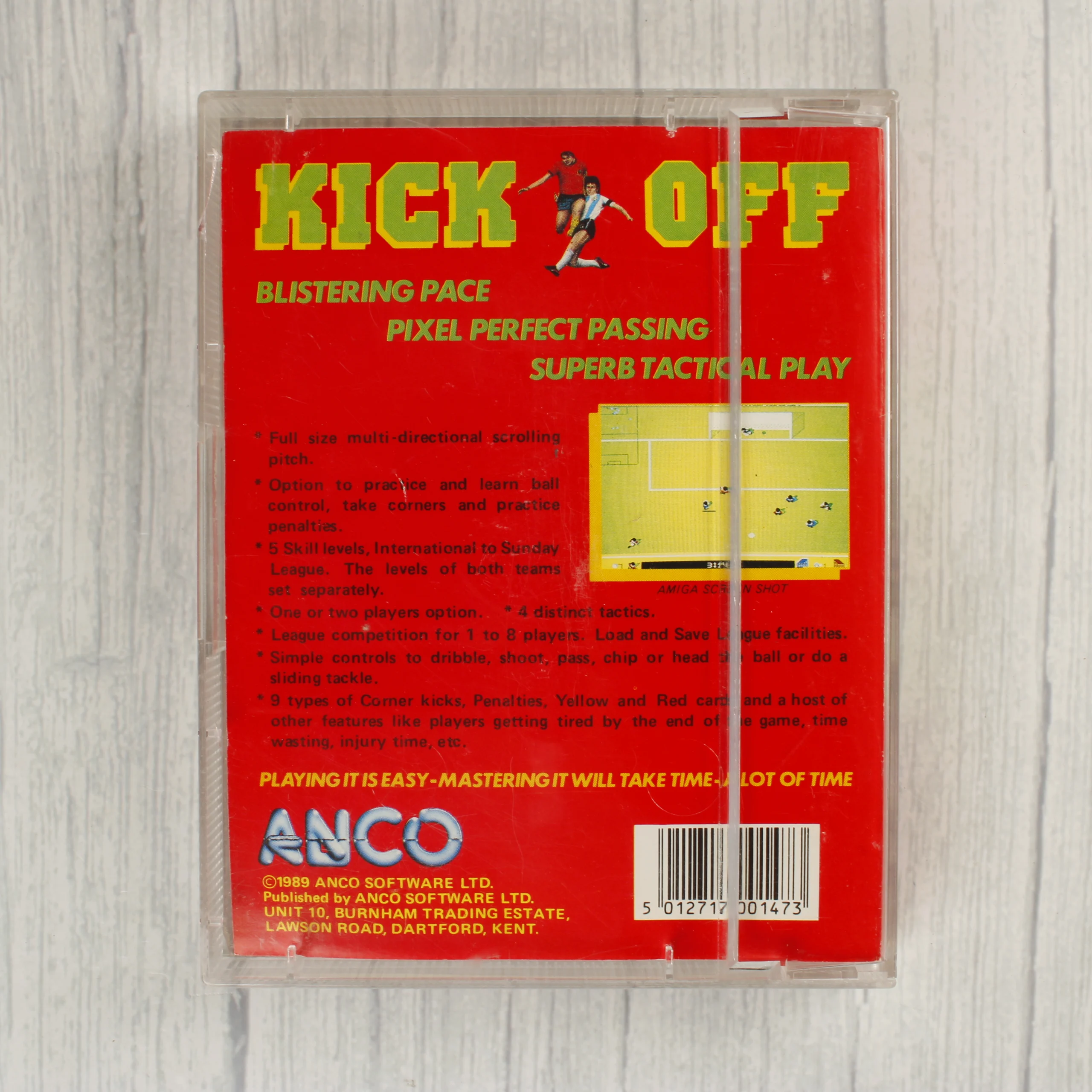 A Kick Off című videójáték Commodore 64 és 128 rendszerekre készült kiadása. A csomag egy átlátszó műanyag tokot tartalmaz, amelyben egy piros alapszínű, illusztrált papírborító található. A borító elején két labdarúgó látható játék közben, a hátoldalon pedig angol nyelvű leírás és egy képernyőkép olvasható. A készlet része egy fekete műanyag házas magnetofonkazetta, amelyen piros címke jelzi a játék címét, a kiadót és a platformot. A kazetta és a tok használt, de megkímélt állapotú, a műanyagon apróbb felületi karcok láthatóak. A terméket az Anco Software Ltd. adta ki 1989-ben.