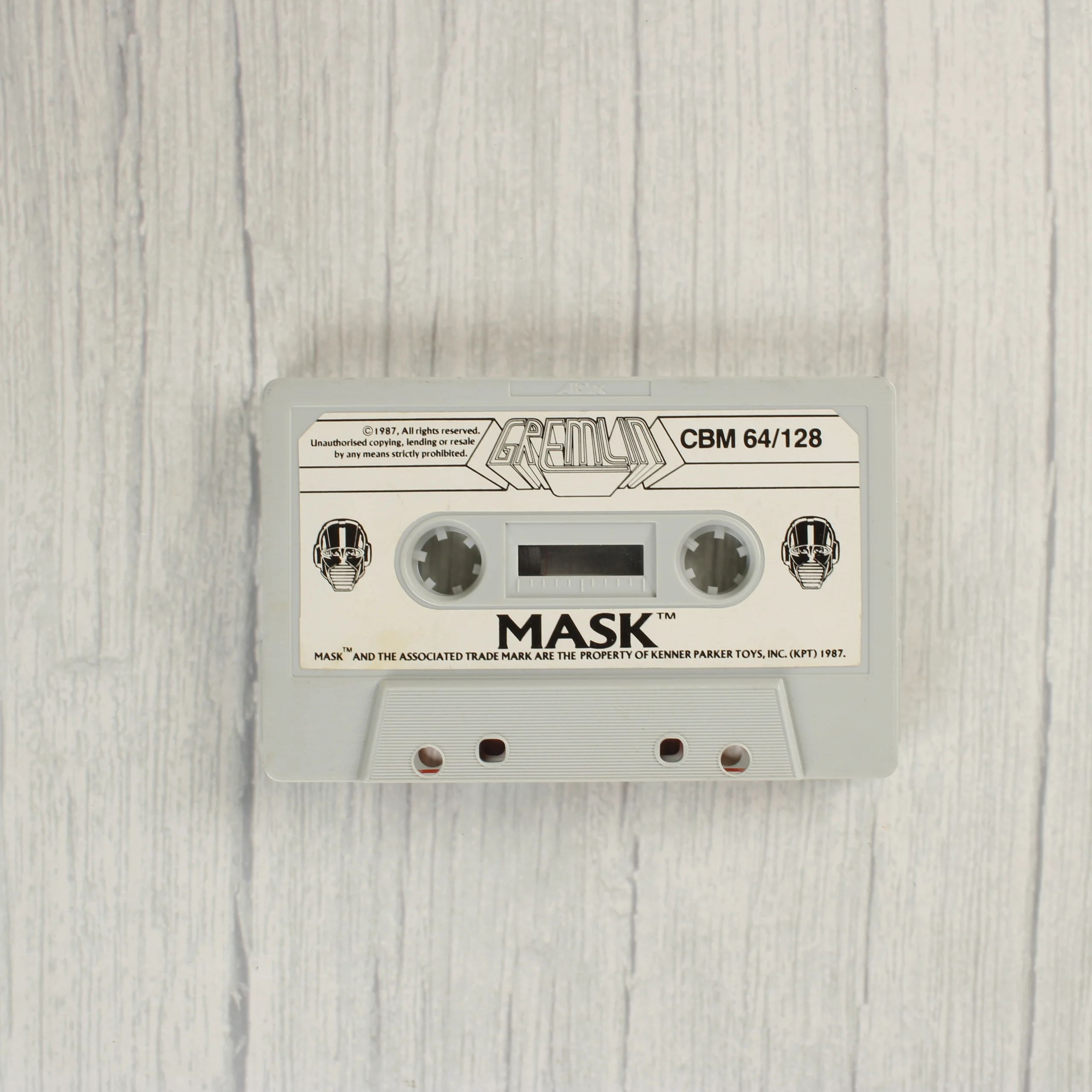 A M.A.S.K. című videójáték Commodore 64 és 128 platformokra készült kiadása. A csomag tartalmazza az eredeti színes papírborítót, a műanyag tokot és a szürke színű adathordozó kazettát. A borítón a sorozat jellegzetes karakterei és járművei láthatók, mint például a Thunderhawk. A kazettán fehér címke található fekete feliratokkal és a Gremlin Graphics logójával. A termék az 1987-es évből származik, a Kenner Parker Toys licence alapján készült. A műanyag tok átlátszó, a kazetta háza pedig világosszürke műanyagból készült. A borító hátoldalán angol nyelvű leírás és képernyőfotók láthatóak a játékból.