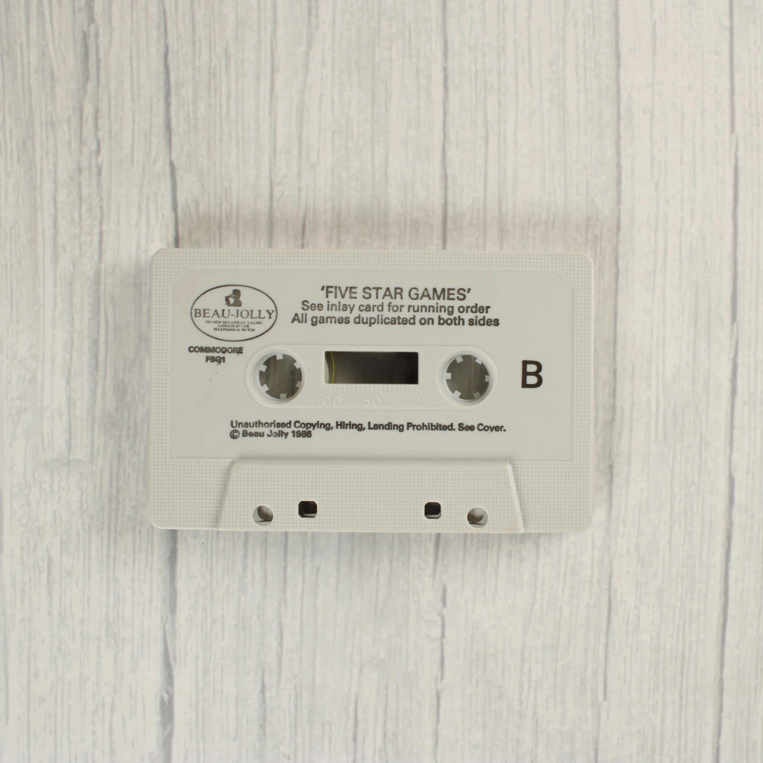 A Five Star Games egy videójáték-válogatás Commodore 64/128 platformra, amely öt különböző címet tartalmaz: Spindizzy, Batalyx, Zoids, Scarabaeus és Equinox. A termék egy normál méretű, átlátszó műanyag tokban található, amelyben egy papír borító és egy fehér színű kazetta kapott helyet. A borító előlapján kék csillagok jelzik a játékokat, a hátoldalon pedig rövid leírások és képernyőképek láthatóak az egyes programokról. A kazetta címkéjén a Beau-Jolly logó és a 'Five Star Games' felirat olvasható. A csomagolás és a hordozó is használt, de megkímélt állapotú, a műanyag tokon apróbb felületi karcok és kopások észlelhetőek. A papír borító színei élénkek, a széleken minimális használati nyom látszik.