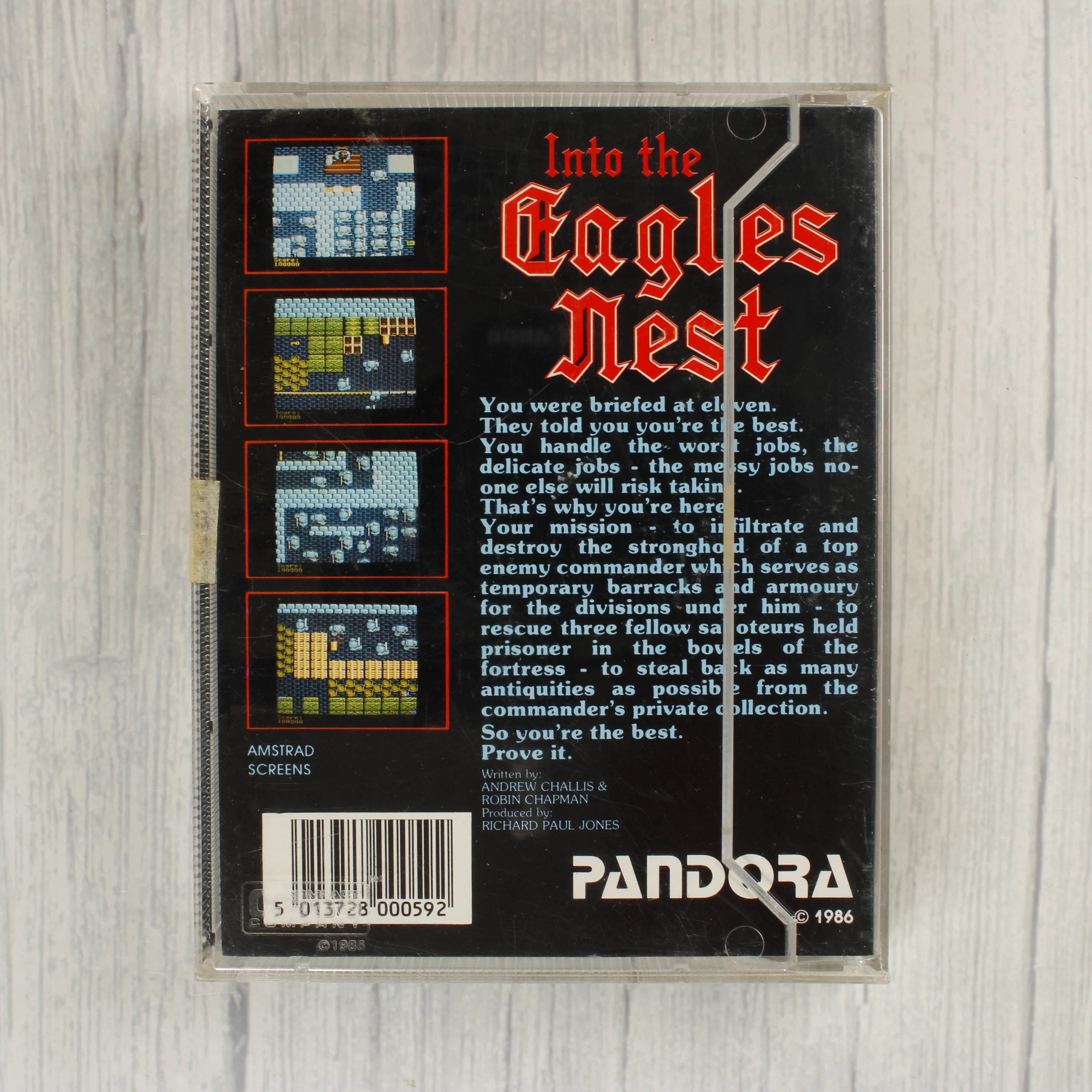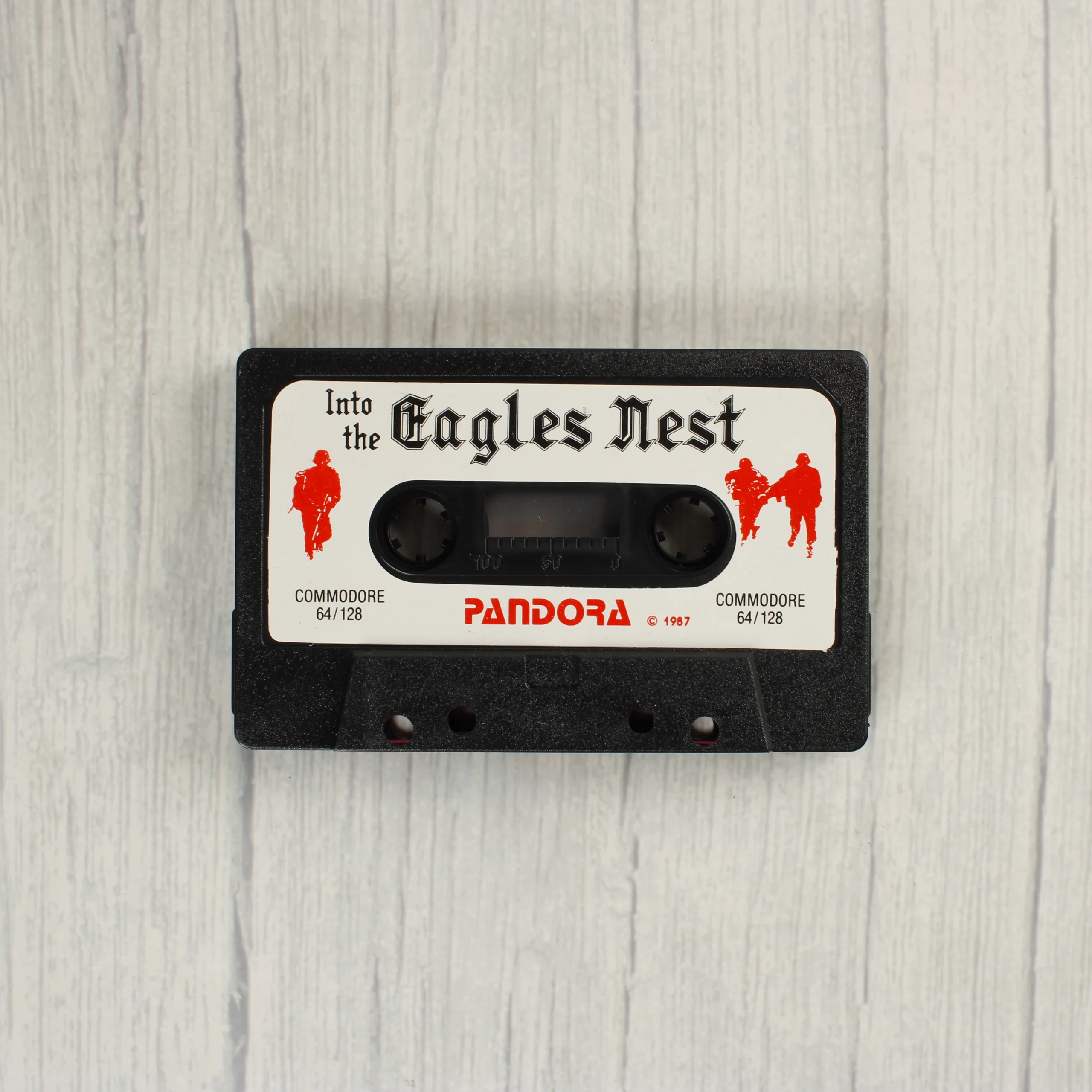 Az Into the Eagles Nest egy Commodore 64/128 platformra megjelent videójáték, amely eredeti műanyag tokban és adathordozó kazettán található. A Pandora által kiadott szoftver borítóján második világháborús katonák és egy vár látható. A hátoldalon angol nyelvű leírás és képernyőmentések szerepelnek. A fekete színű kazetta fehér címkével rendelkezik, amelyen piros katona sziluettek és a játék címe látható gótikus betűtípussal. A csomagolás és a kazetta is korának megfelelő, használt állapotban van.