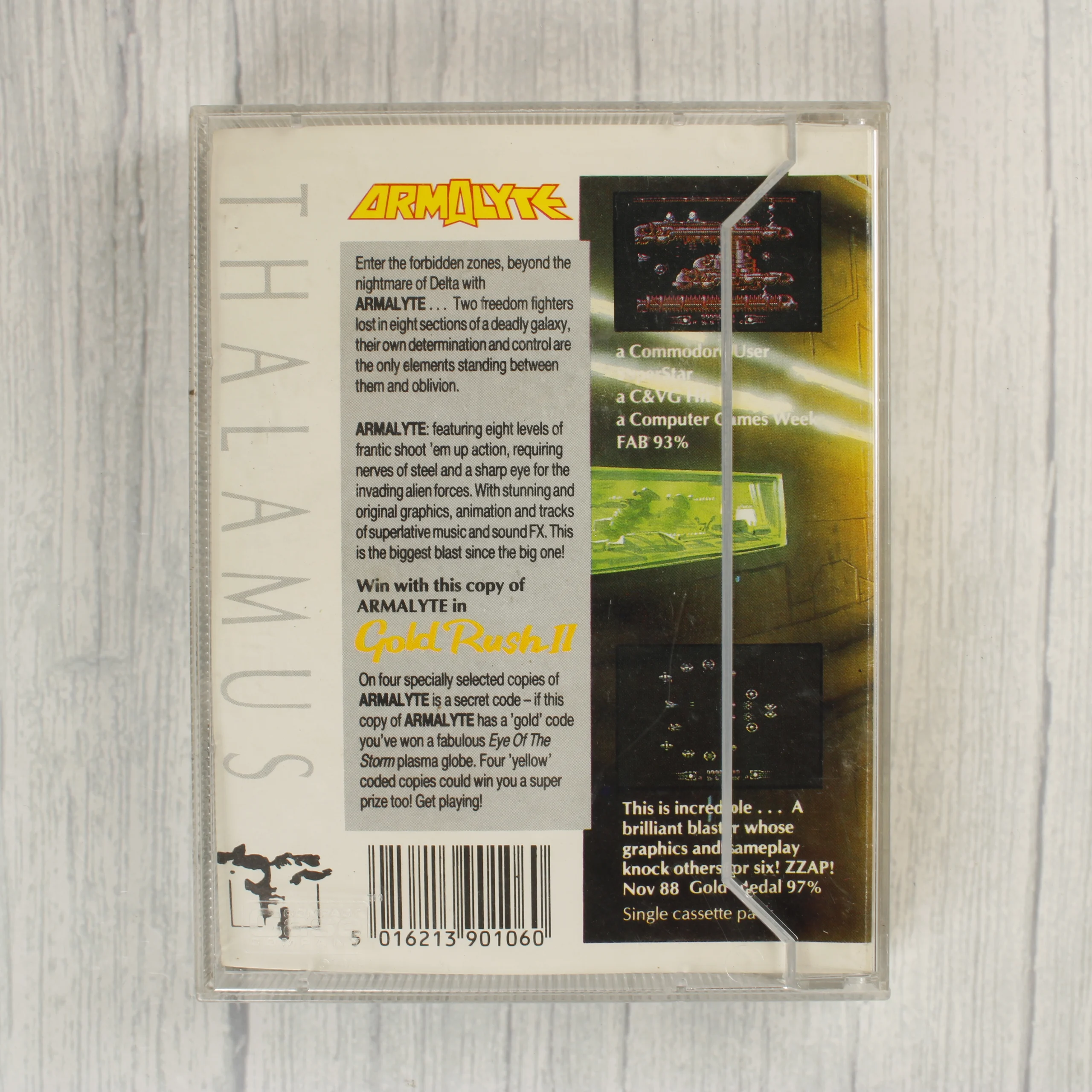 Az Armalyte egy Commodore 64 és 128 rendszerekre megjelent videójáték, amely eredeti műanyag tokban és kazetta formátumban maradt fenn. A borítón színes, sci-fi stílusú illusztráció látható, amely űrcsatát ábrázol futurisztikus hajókkal. A Thalamus által kiadott szoftver tokjának hátoldalán angol nyelvű leírás, játékmenet-képek és egy vonalkód található. A csomag tartalmazza az eredeti, világosszürke színű kazettát is, amelyen fehér alapon fekete feliratok és a kiadó logója látható. A papírborító és a kazetta címkéje tiszta, a színek élénkek, a műanyag tok pedig átlátszó, ép állapotú. A termék a nyolcvanas évek végének jellegzetes otthoni számítógépes szoftvermegjelenését képviseli.