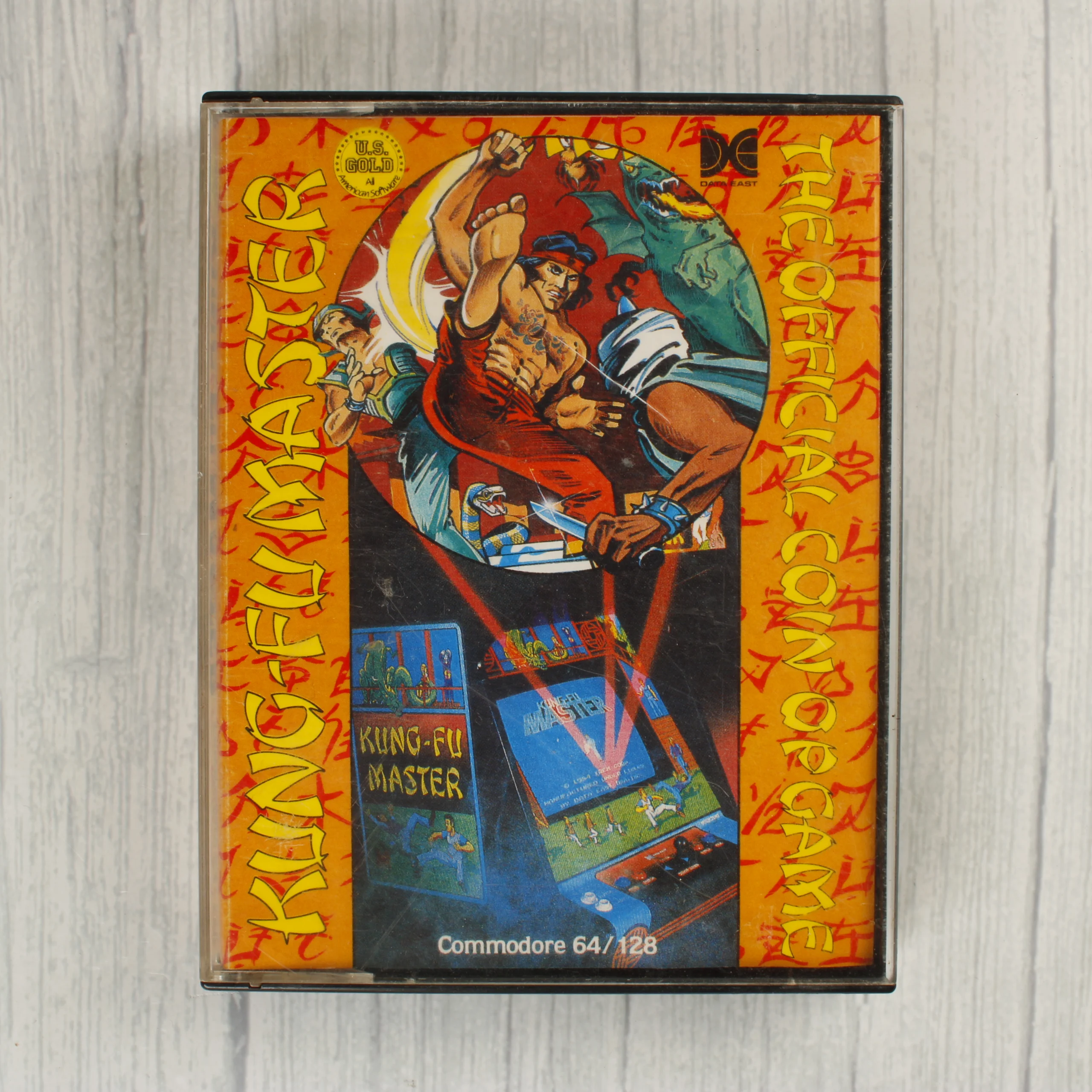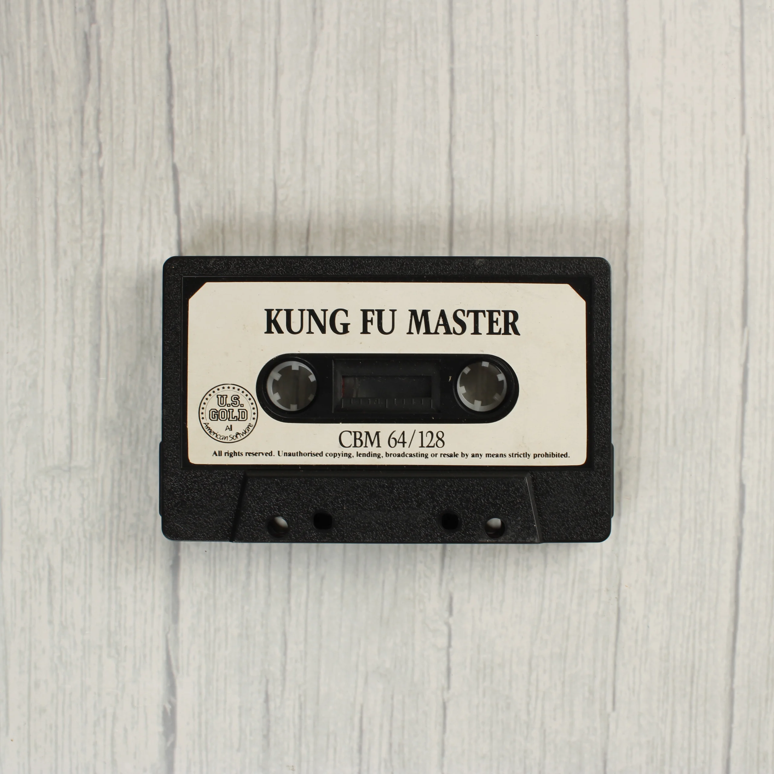 A Kung-Fu Master című videójáték Commodore 64 és 128 rendszerekhez készült kiadása. A csomag tartalmazza az eredeti műanyag tokot a színes papírborítóval, valamint a fekete színű mágnesszalagos kazettát. A borítón látványos illusztráció látható harcművészeti jelenettel és egy játéktermi automatával. A kazetta fehér címkéjén fekete felirat jelzi a címet és a kompatibilis platformot. A kiadó az U.S. Gold, a játékot az Irem Corp. licencelte. A tok hátoldalán vonalkód és a kiadó elérhetőségei szerepelnek. A termék fizikai adathordozón tárolt szoftver, amely a nyolcvanas évek otthoni számítógépes korszakát idézi.