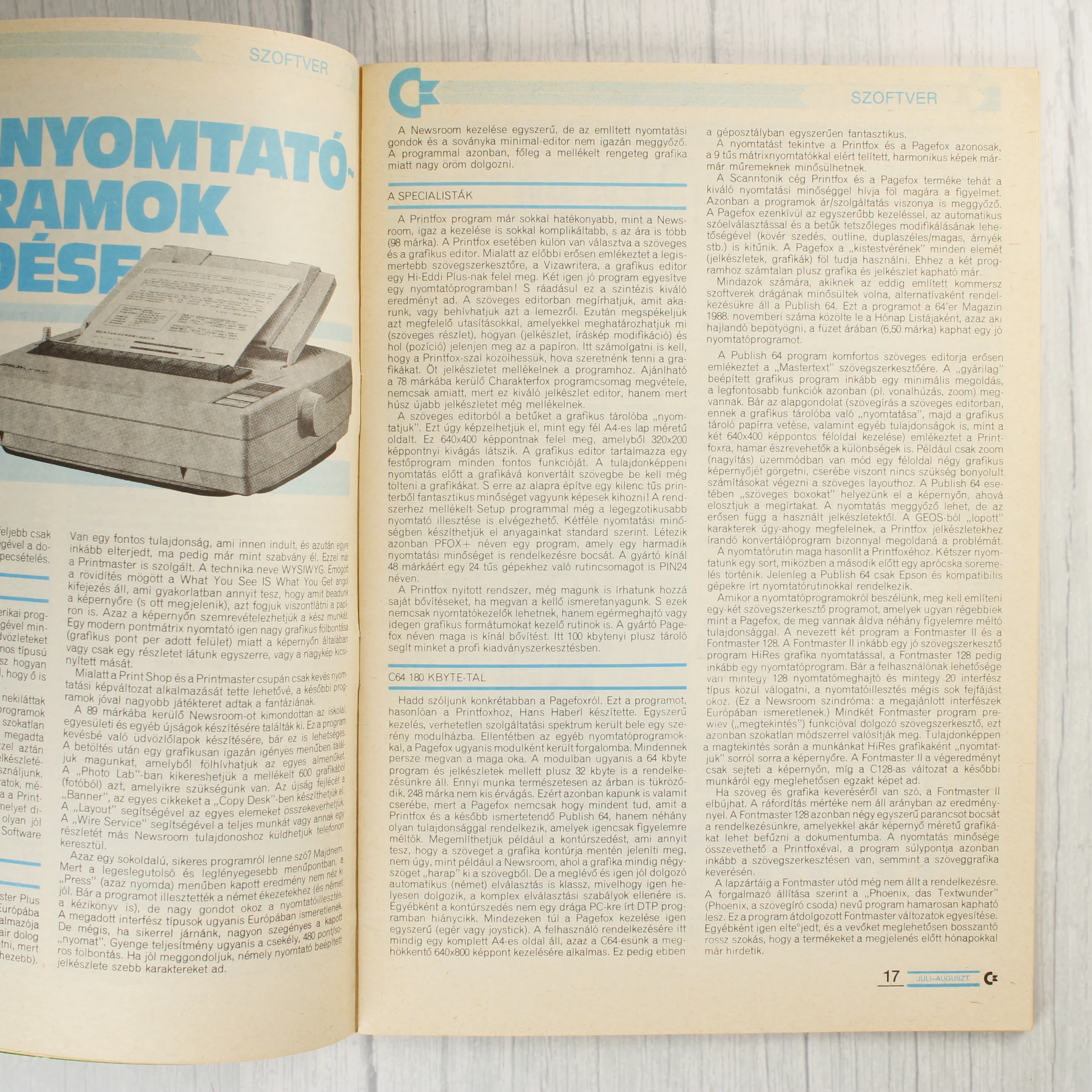 Az Országos Commodore Egyesület lapjának 1989. július-augusztusi száma. A címlapon egy piros fürdőruhás nő látható napszemüvegben, mellette egy korabeli számítógép monitorral és floppy lemezmeghajtóval. A borító fekete-fehér négyzethálós és narancssárga hátterű, rajta kék 'C' logóval és piros 'újság' felirattal. A belső oldalakon szoftverekről, vírusokról és programozásról szóló cikkek olvashatók, többek között egy 80 karakteres szövegszerkesztő programlistája is látható. A kiadvány tűzött kötésű, papír alapú, magyar nyelvű technikai magazin.