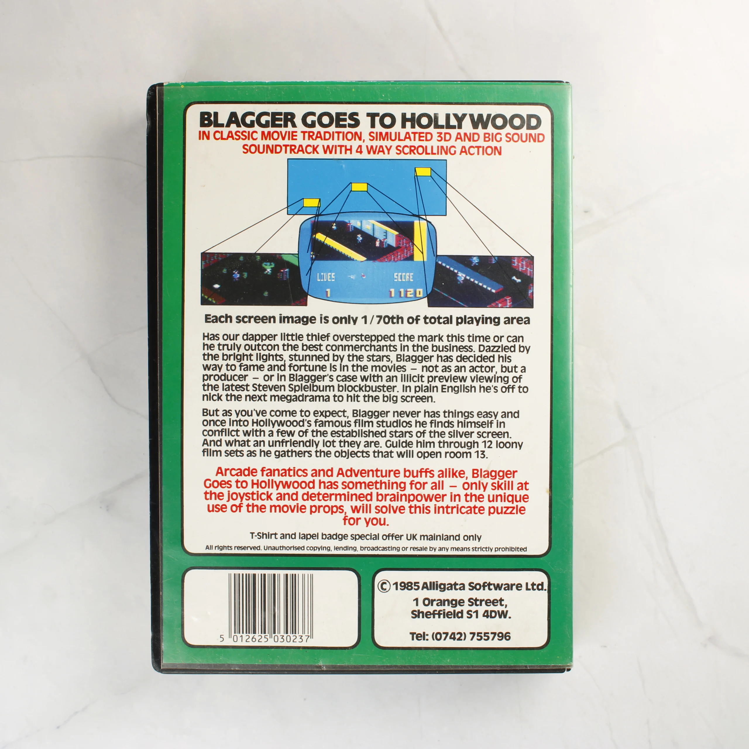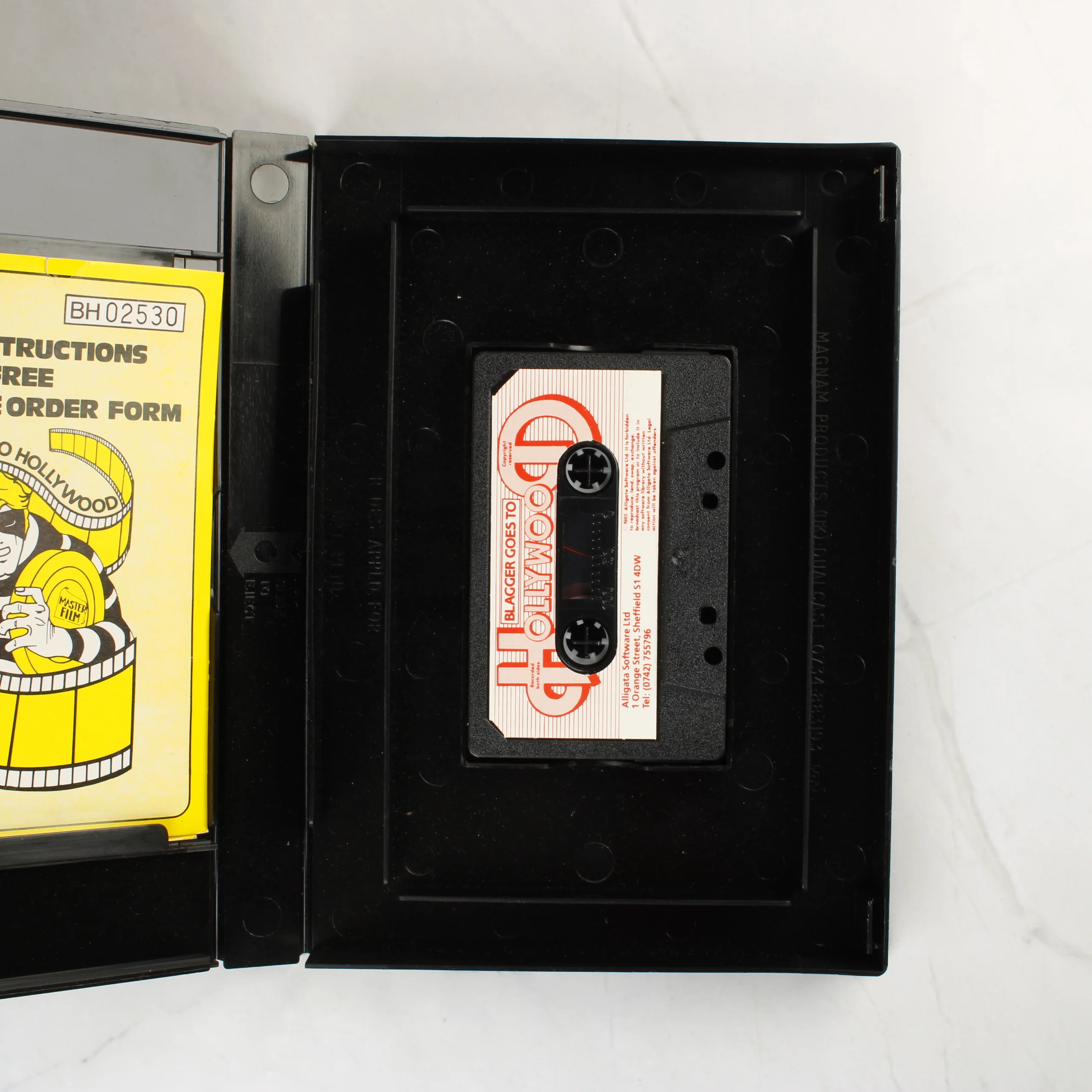 A Blagger Goes to Hollywood című videójáték Commodore 64 platformra, eredeti műanyag tokban. A csomag tartalmazza a fekete színű adathordozó kazettát és a sárga színű papír alapú használati útmutatót. A borítón színes illusztráció látható, amelyen a főhős mellett különböző filmes karakterekre emlékeztető alakok tűnnek fel. A hátoldalon angol nyelvű leírás és képernyőképek találhatók a játékról. A kiadó az Alligata Software Ltd, a kiadás éve 1985. A tok és a papírok élei mentén enyhe kopás látható, de az elemek fizikailag épek.
