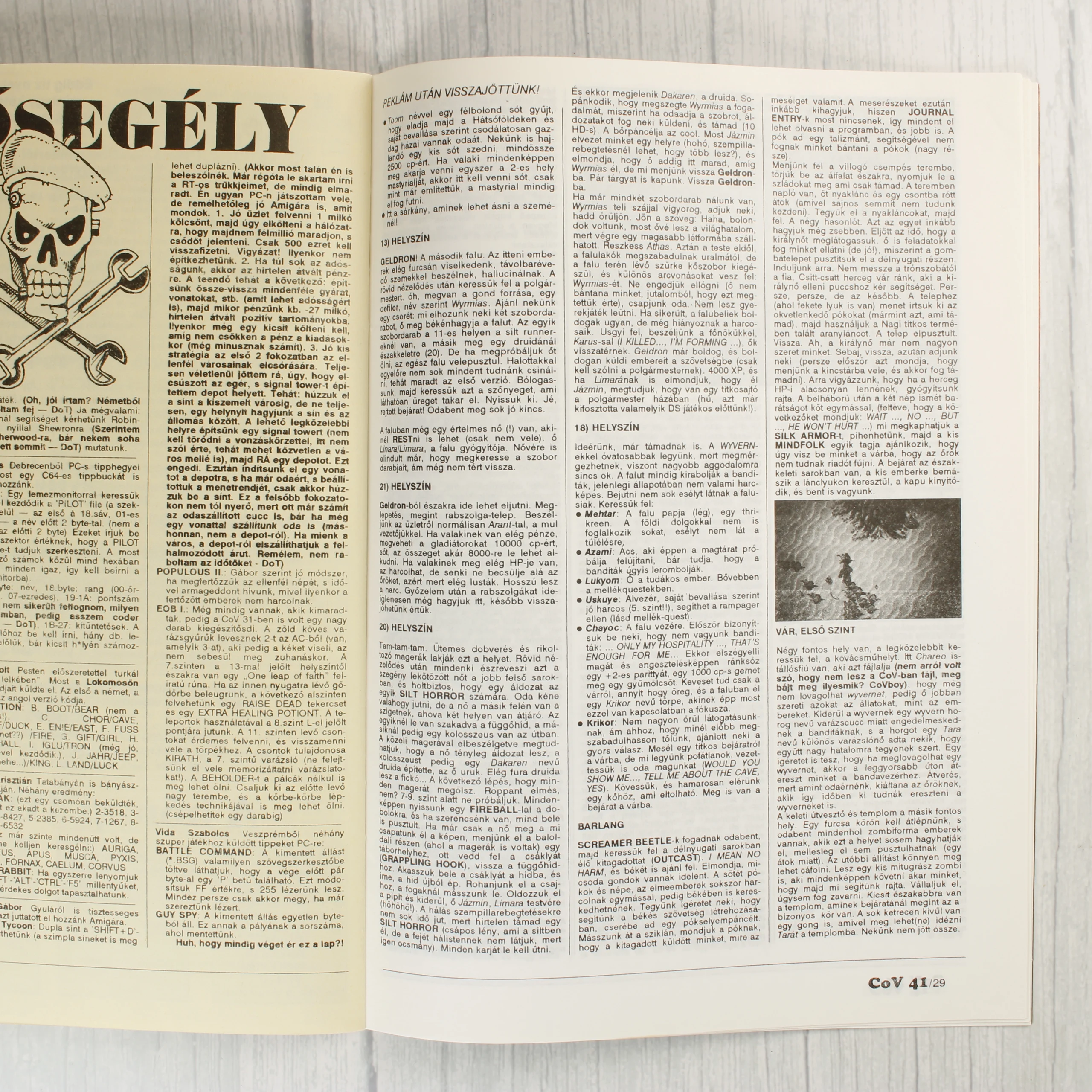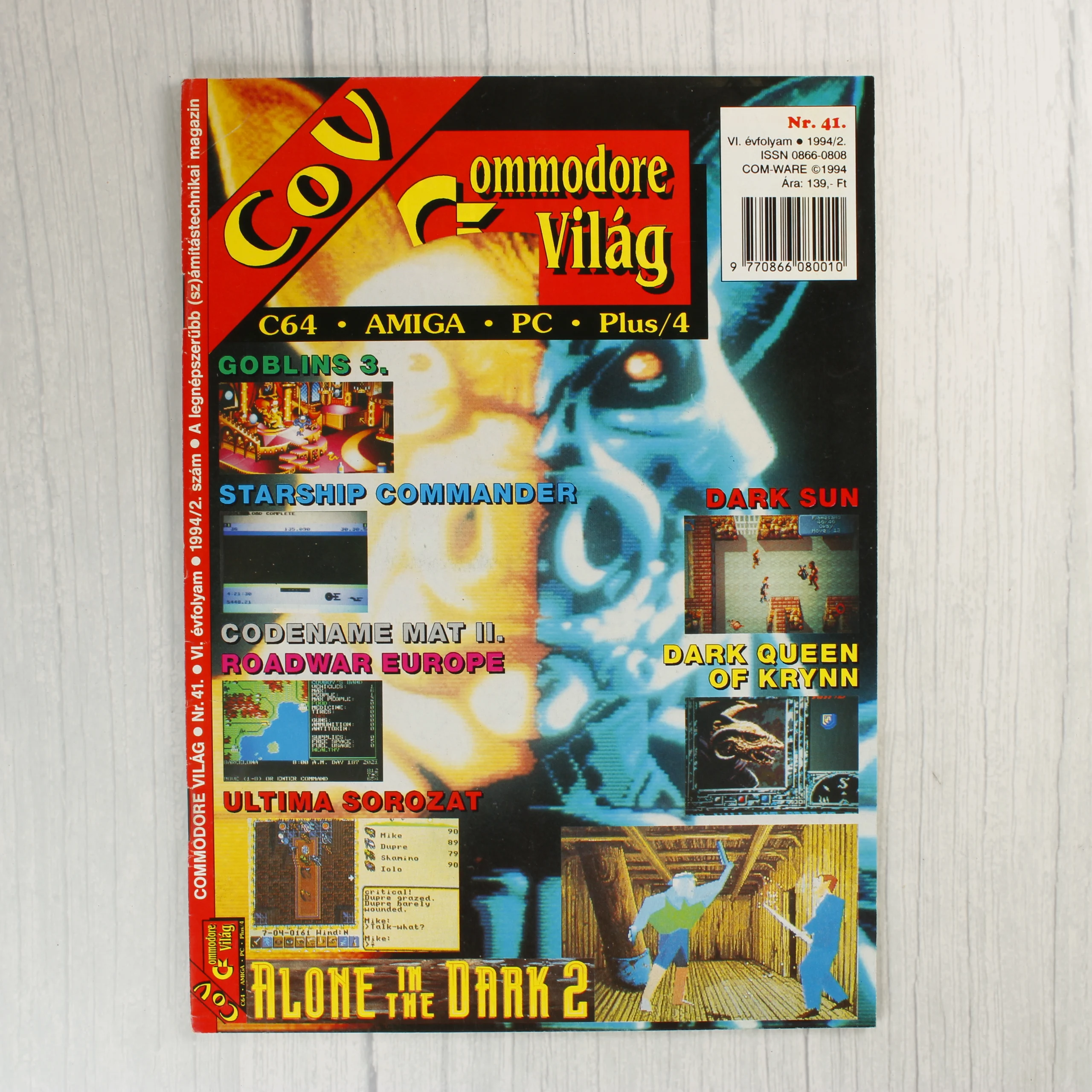 A Commodore Világ (COV) számítástechnikai magazin 41. száma, amely 1994 februárjában jelent meg. A borítón színes montázs látható különböző videójátékokból, többek között a Goblins 3, Starship Commander, Dark Sun és Alone in the Dark 2 címekből. A magazin C64, Amiga, PC és Plus/4 platformokkal foglalkozik. A belső oldalakon fekete-fehér szöveges tartalom, játékleírások és illusztrációk láthatóak, többek között a Dark Sun játékhoz kapcsolódó részletes végigjátszás. A papír az éleknél enyhén kopott, de a kiadvány egyben van, nincsenek rajta jelentős szakadások vagy firkálások. A hátoldalon vonalkód és az akkori 139 forintos ár szerepel.