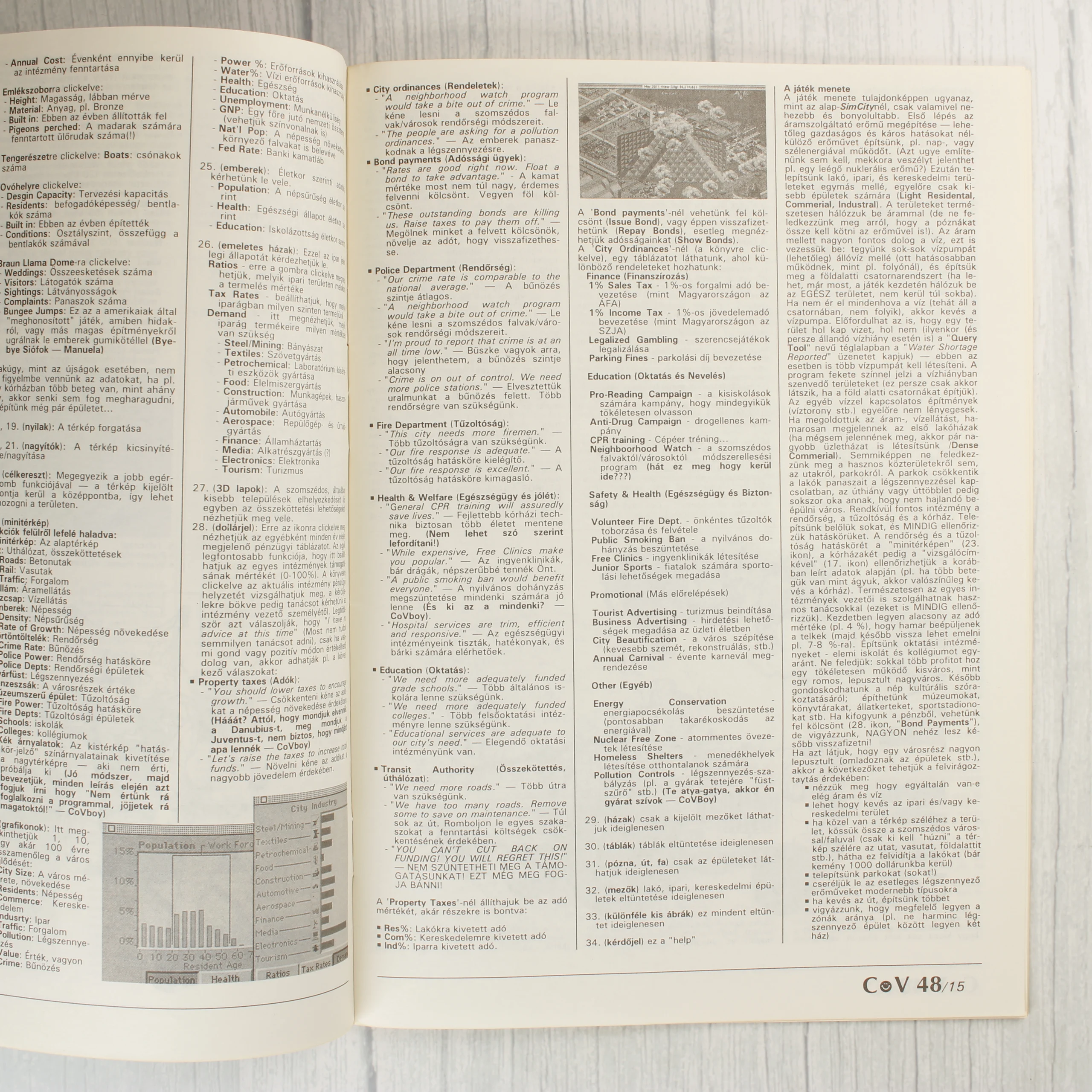 A Commodore Világ (COV) számítástechnikai magazin 48. száma, amely 1994 szeptemberében jelent meg. A borítón egy nagyméretű, sárgás tónusú grafika látható egy szemkötőt viselő férfiról, mellette pedig játékismertetők és képernyőmentések kaptak helyet, többek között a SimCity 2000, a Space Hulk és az Ultima sorozat kapcsán. A címlapon a C64, Amiga, PC és Plus/4 platformok logói szerepelnek. A belső oldalakon sűrűn szedett, fekete-fehér szöveges tartalom látható, amely részletes játékleírásokat és stratégiai tanácsokat tartalmaz a SimCity 2000 és a SimFarm játékokhoz. A papír alapú kiadvány tűzött kötéssel készült, a borító színes, míg a belső oldalak monokróm nyomásúak.