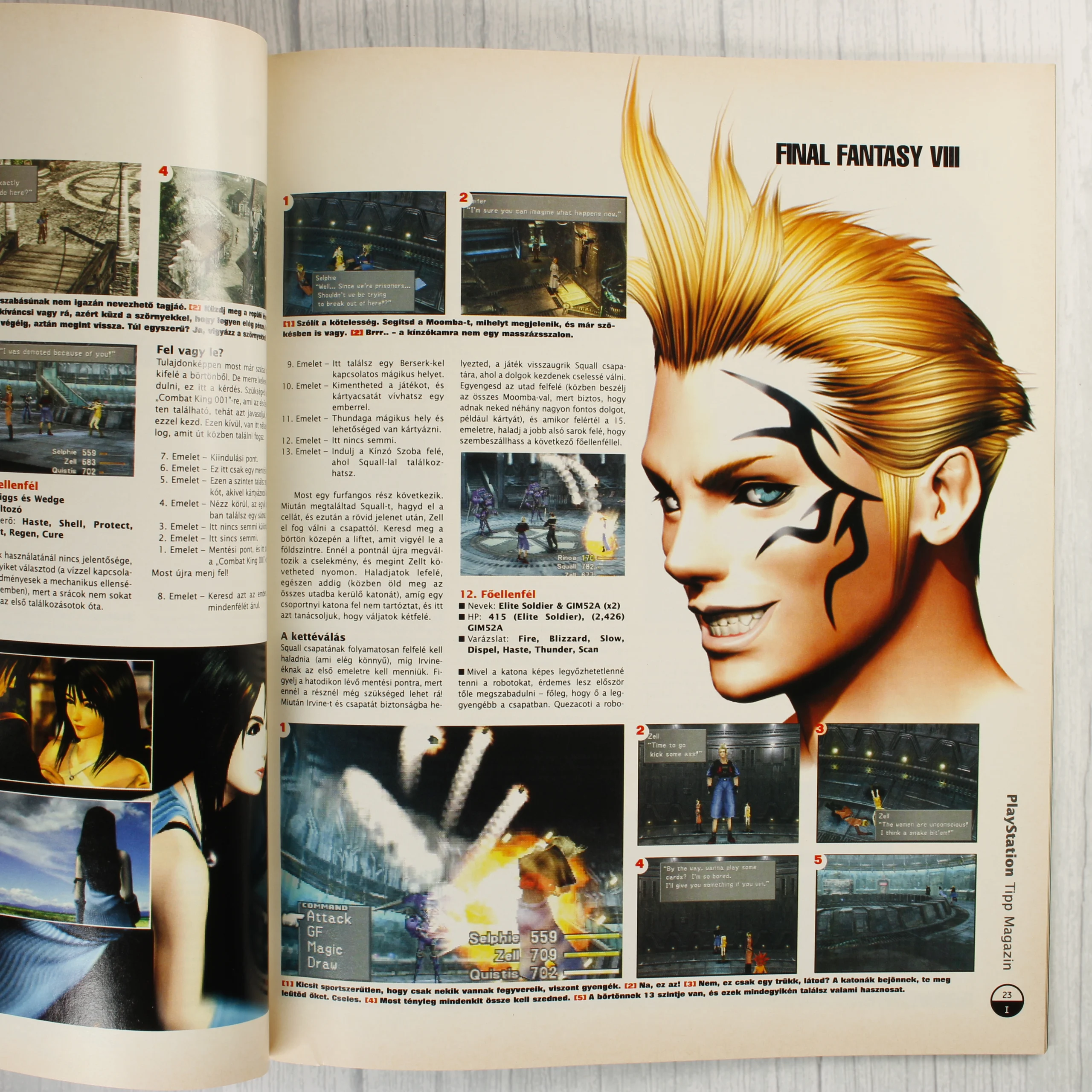 A PlayStation Tipp magazin 1999. decemberi száma, amely a hivatalos magyar PlayStation Magazin alkotóitól származik. A borítón a Final Fantasy VIII főszereplője, Squall Leonhart látható, kiemelve a játékhoz tartozó 16 oldalas végigjátszást. A magazin további tartalmai közé tartozik a Metal Gear Solid: Special Missions leírása, tippek és csalások gyűjteménye, valamint ismertetők a FIFA 2000, Quake II és 40 Winks játékokról. A kiadvány papíralapú, színes nyomtatással készült, a belső oldalakon részletes szöveges útmutatók és képernyőmentések találhatók a korszak népszerű videójátékairól. A borító felső részén piros alapon fehér betűkkel olvasható a magazin címe, mellette az ár és a dátum is feltüntetésre került.