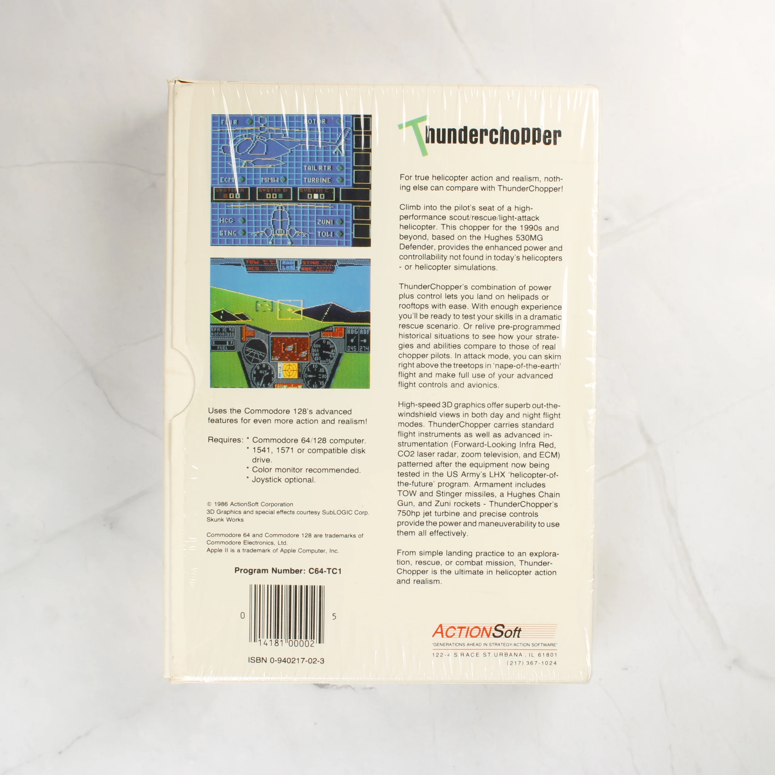 A Thunderchopper című helikopter-szimulátor videójáték Commodore 64 és 128 számítógépekhez. A csomag tartalmazza az eredeti, színes illusztrációval ellátott kartondobozt, amelyen egy katonai helikopter látható naplemente előtt. A doboz hátoldalán játékmenet-képernyőképek és részletes angol nyelvű leírás található. A készlet része továbbá egy 5,25 colos floppy lemez fehér papírtokban, valamint egy Helicopter Operations Handbook feliratú felhasználói kézikönyv. A szoftvert az ActionSoft adta ki 1987-ben, a grafikai technológiát a SubLOGIC licencelte. A doboz felületén az eredeti védőfólia maradványai vagy gyűrődései látszanak, a sarkok és élek épek. A floppy lemez címkéje tiszta, a kézikönyv borítója megkímélt állapotú.
