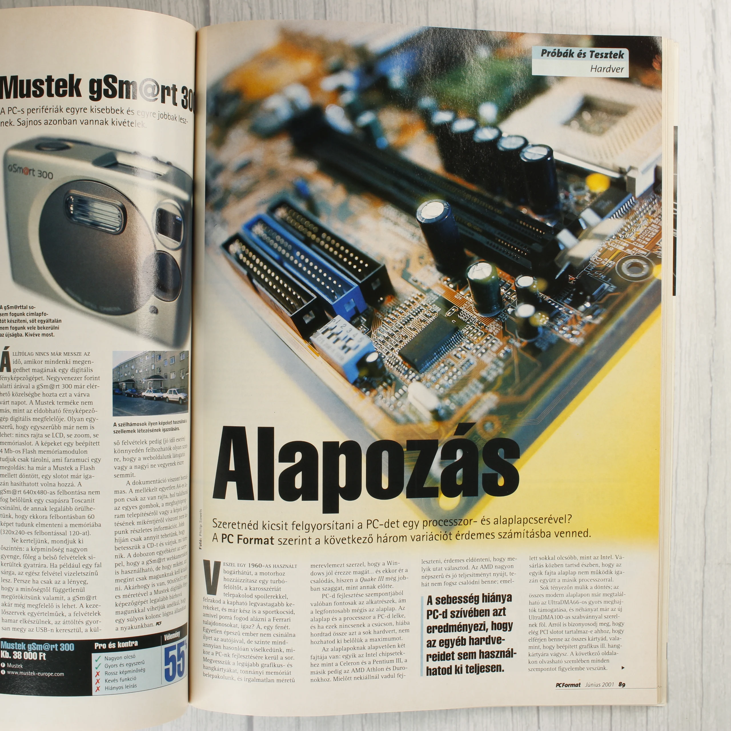 A PC Format magazin 2001. júniusi száma, amelynek címlapján egy arany ruhás hölgy látható. A borítón kiemelt témák között szerepel a 2001-es díjkiosztó, a 3D játékok jövője, a Tribes 2, valamint a Windows XP bemutatója. A magazin mellékleteként két CD-t hirdetnek, amelyek teljes verziós szoftvereket és játékdemókat tartalmaznak. A belső oldalakon hardvertesztek, többek között alaplapok és digitális fényképezőgépek bemutatói, valamint videójáték-ismertetők olvashatók. A kiadvány fényes papírra nyomtatott, színes illusztrációkkal és technikai adatokkal gazdagon ellátott. A borító jobb alsó sarkában vonalkód és az ár (1990 Ft) látható.