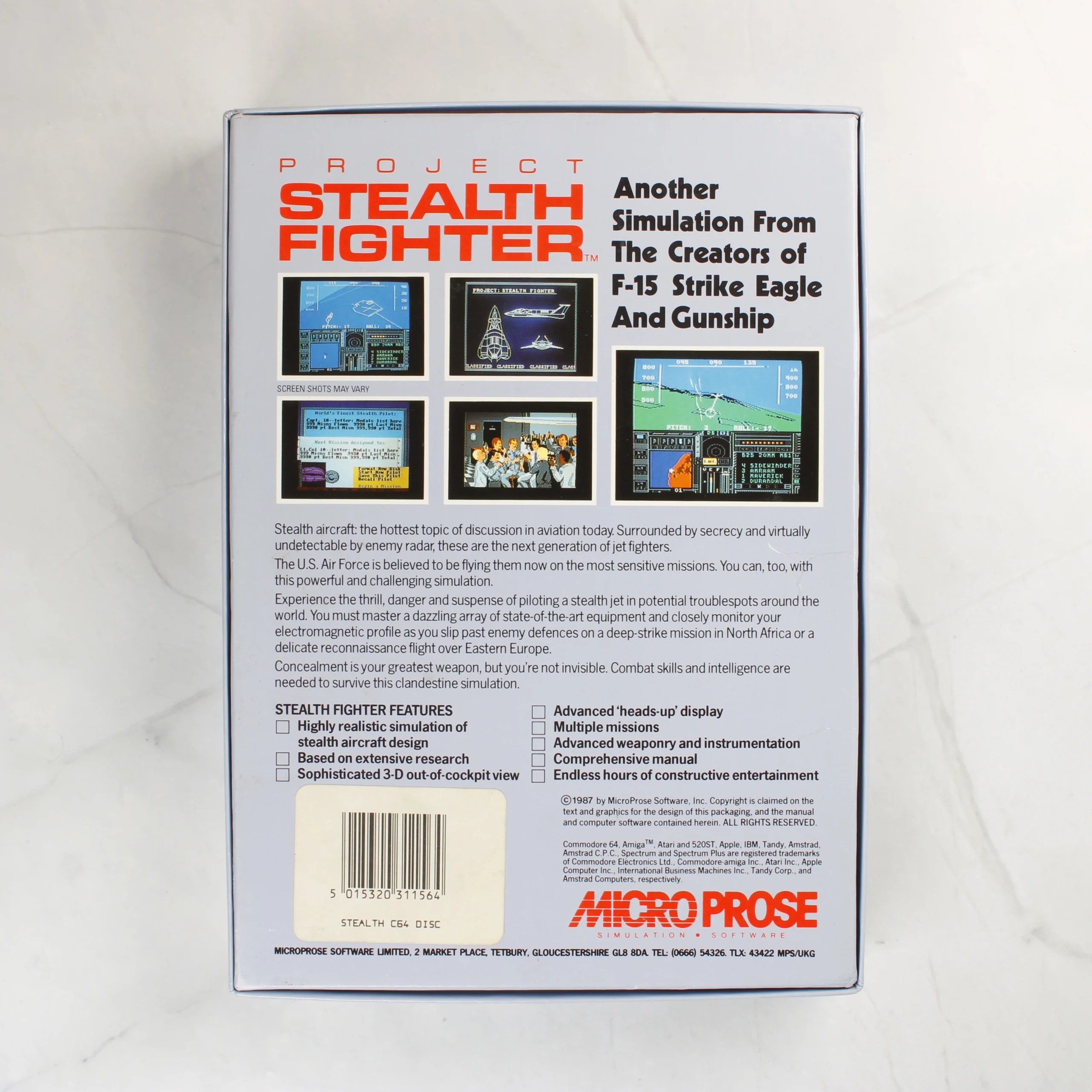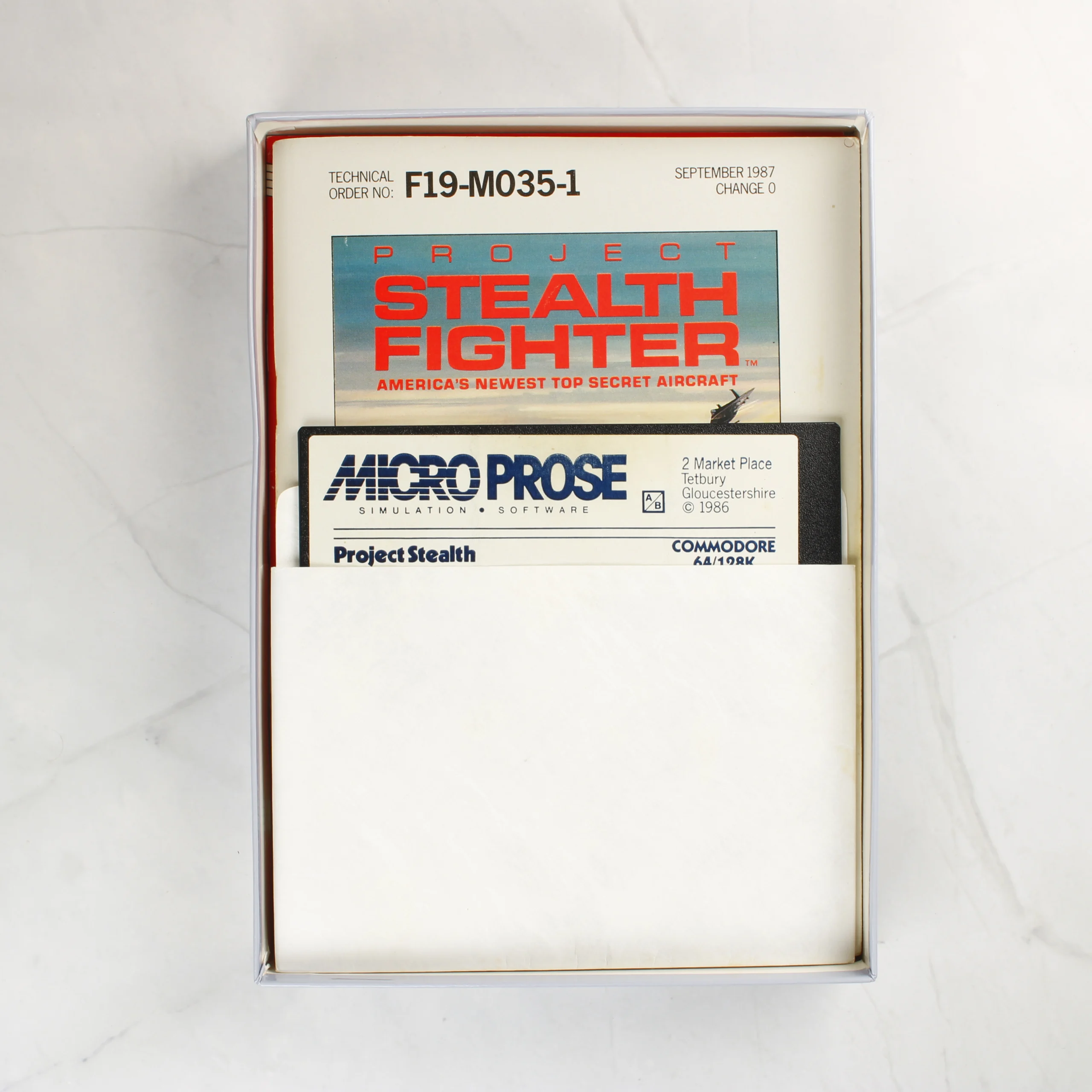 A MicroProse által kiadott Project Stealth Fighter videójáték Commodore 64/128 platformra. A csomag tartalmazza az eredeti kartondobozt, egy 5,25 colos floppy lemezt papírtokban, valamint egy részletes, angol nyelvű használati útmutatót (Operations Manual). A doboz elején egy lopakodó vadászgép látható bevetés közben, a hátoldalon pedig játékmenet-felvételek és technikai leírások szerepelnek. A szoftver egy szimulációs program, amely a modern sugárhajtású repülőgépek irányítására fókuszál.