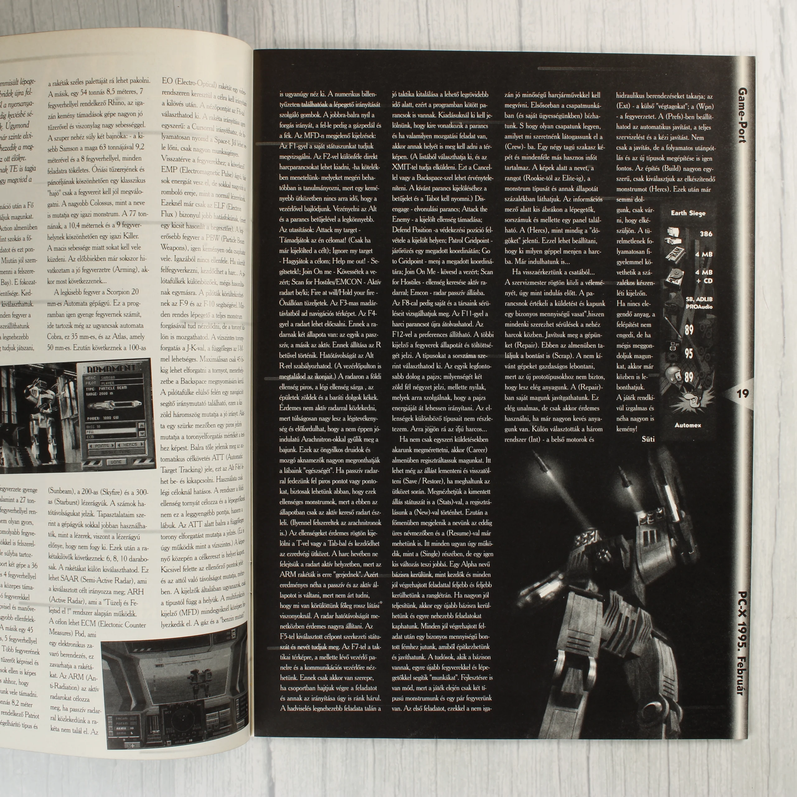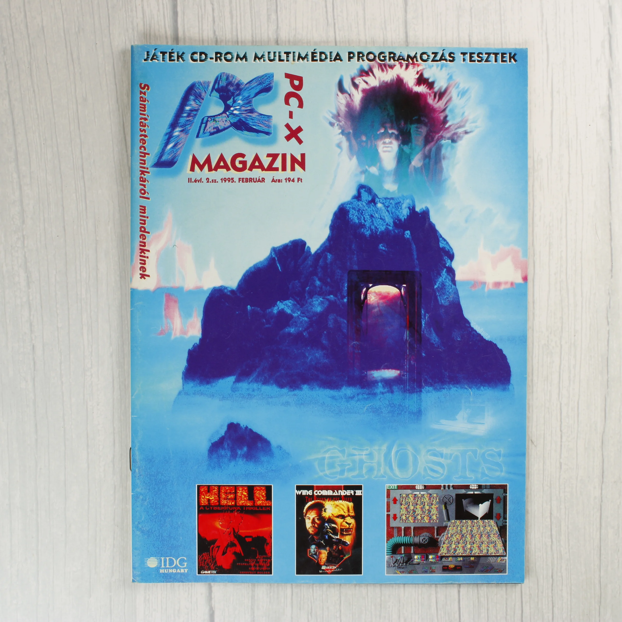 A PC-X magazin 1995. februári száma, amely az IDG Hungary gondozásában jelent meg. A borítón egy kék tónusú, sziklás tájat ábrázoló grafika látható, felette egy misztikus alak sziluettjével. A címlapon olyan videójátékok címei és képei szerepelnek, mint a Hell: A Cyberpunk Thriller és a Wing Commander III. A magazin felső részén a játék, CD-ROM, multimédia, programozás és tesztek témakörök vannak feltüntetve. A belső oldalakon részletes játéktesztek és leírások olvashatók fekete-fehér és színes illusztrációkkal, többek között az Earth Siege és a Lords of the Realm játékokról. A kiadvány tűzött kötésű, papíralapú, korának megfelelő állapotban van, a széleken enyhe kopásnyomokkal.