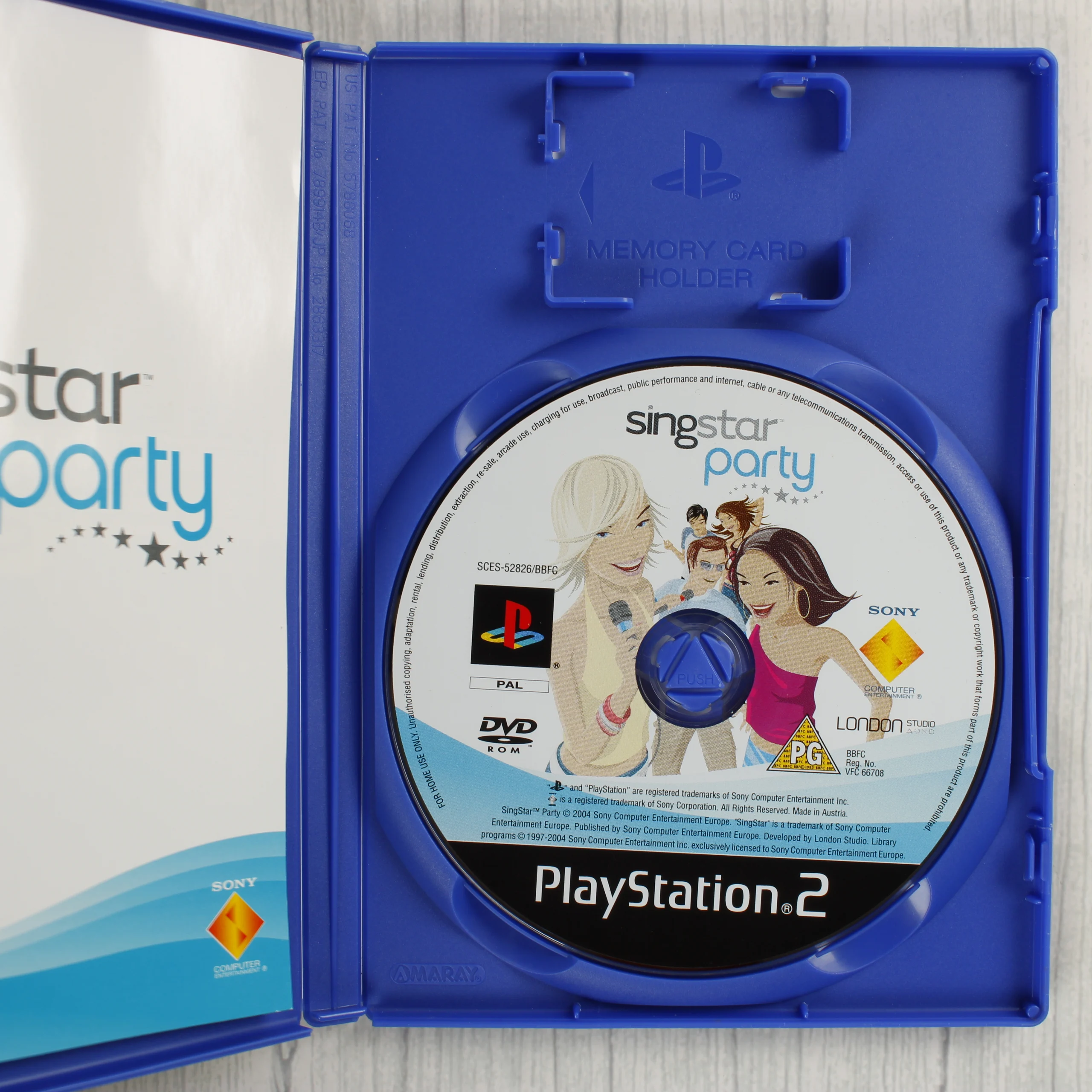A SingStar Party egy PlayStation 2 konzolra megjelent zenei videójáték. A csomag tartalmazza a kék színű műanyag tokot, a színes borítót, a használati útmutatót és a játékot tartalmazó DVD-ROM lemezt. A borítón rajzolt karakterek láthatók éneklés közben, valamint több előadó neve is szerepel rajta, mint például a Destiny's Child és George Michael. A tok elején egy kerek, fehér CeX matricát helyeztek el. A hátoldalon a dalok listája és a játékmenetből vett képernyőfotók láthatók. A lemez felülete illusztrált, a borító grafikáját követi. A kiadvány PAL formátumú, és az EyeToy USB kamerával is kompatibilis.