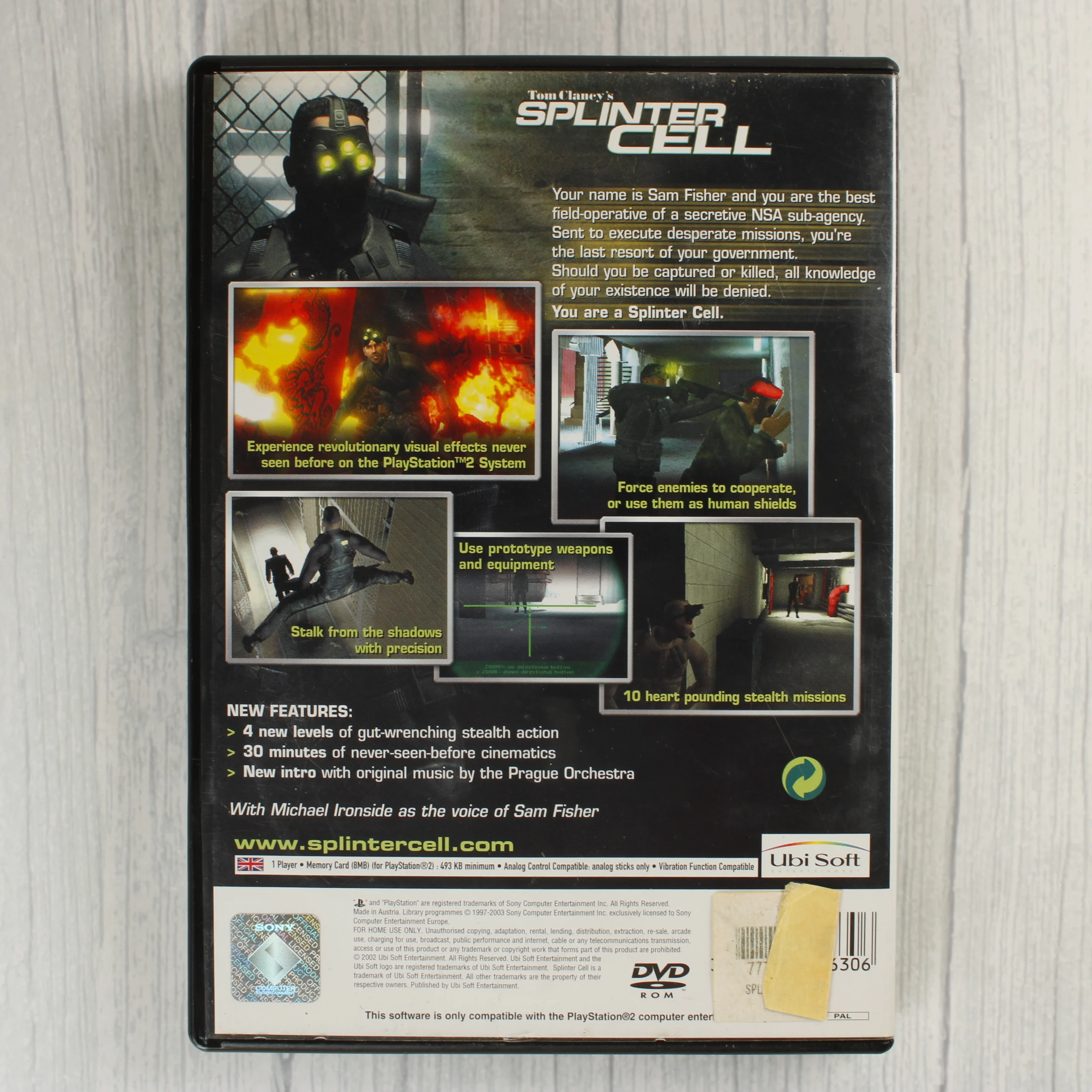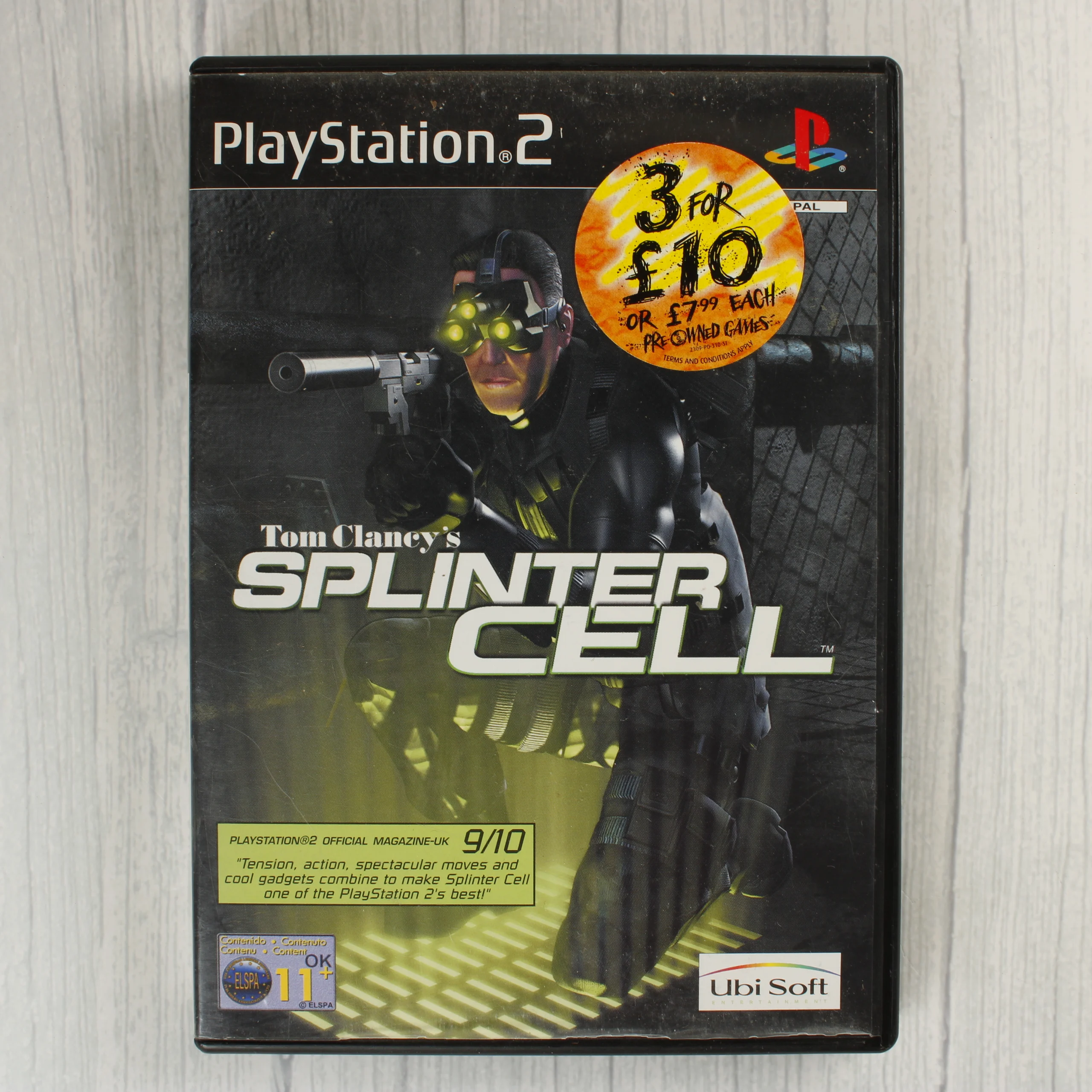 A Tom Clancy's Splinter Cell videójáték PlayStation 2 konzolra kiadott változata. A csomag tartalmazza a fekete műanyag tokot, az eredeti borítót, a használati útmutatót és a Platinum kiadású DVD-ROM lemezt. A borító előlapján egy nagyméretű, sárga-narancssárga akciós matrica látható. A hátoldalon angol nyelvű leírás és játékmenet-képek szerepelnek. A lemez felülete fémes csillogású, rajta a PlayStation 2 és az Ubi Soft logója látható. A tok belső részén kialakított hely van a memóriakártya számára. A termék használt, a borítón és a tokon kisebb kopások és egy régi árcédula maradványa figyelhető meg.