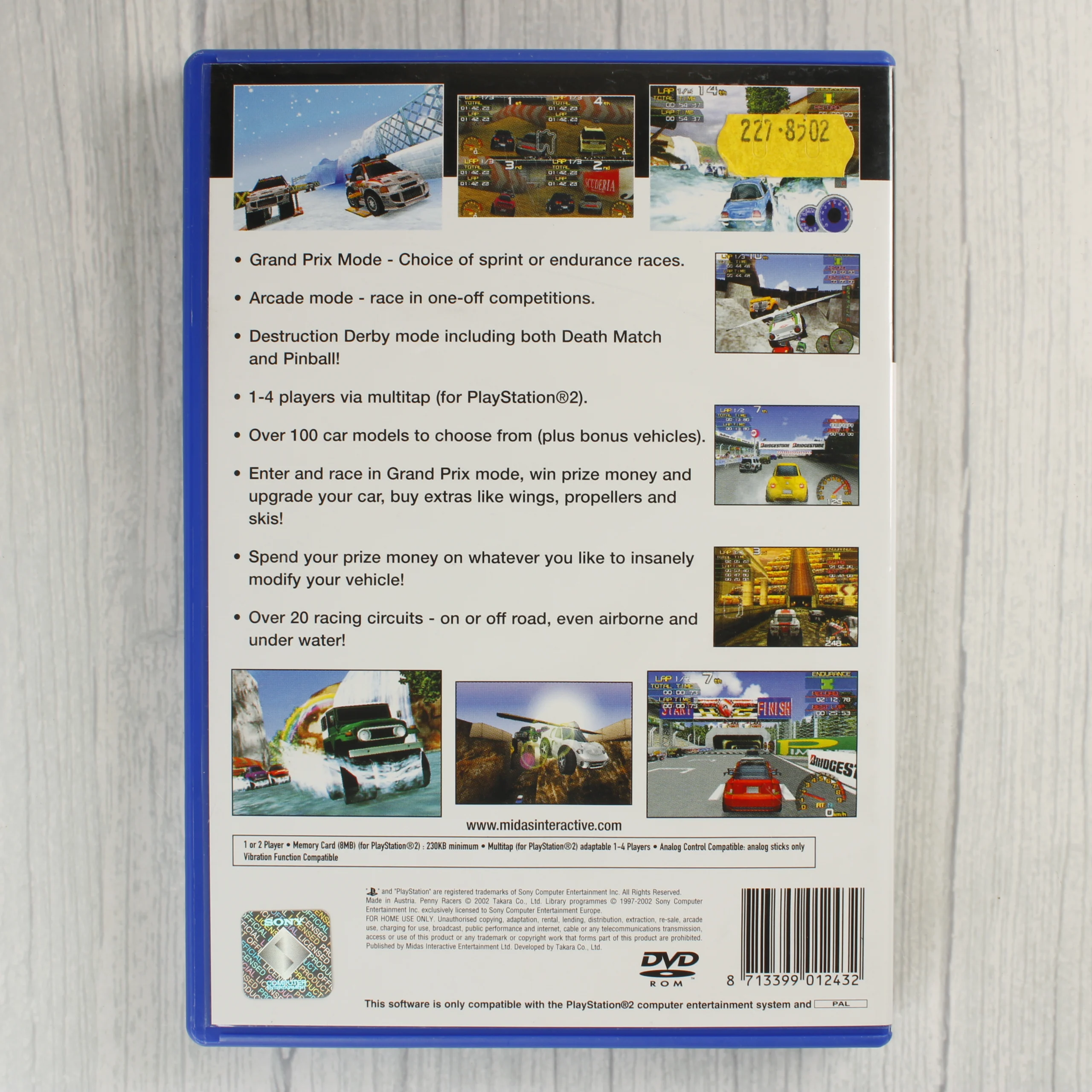 A Penny Racers egy PlayStation 2 konzolra megjelent autóversenyzős videójáték. A termék egy kék színű, műanyag tokban található, amely tartalmazza a játékot hordozó DVD-ROM lemezt is. A borítón színes, rajzfilmszerű illusztráció látható, amelyen egy sárga autó és más járművek szerepelnek városi környezetben. A tok hátoldalán angol nyelvű leírás olvasható a játékmenetről, többek között a Grand Prix és Arcade módokról, valamint kilenc darab kis méretű képernyőkép mutatja be a játék grafikáját. A lemez fehér alapszínű, fekete feliratokkal és grafikával, rajta a PlayStation 2 és a Takara logókkal. A csomagolás hátulján egy sárga árcímke maradványa látható a jobb felső sarokban.