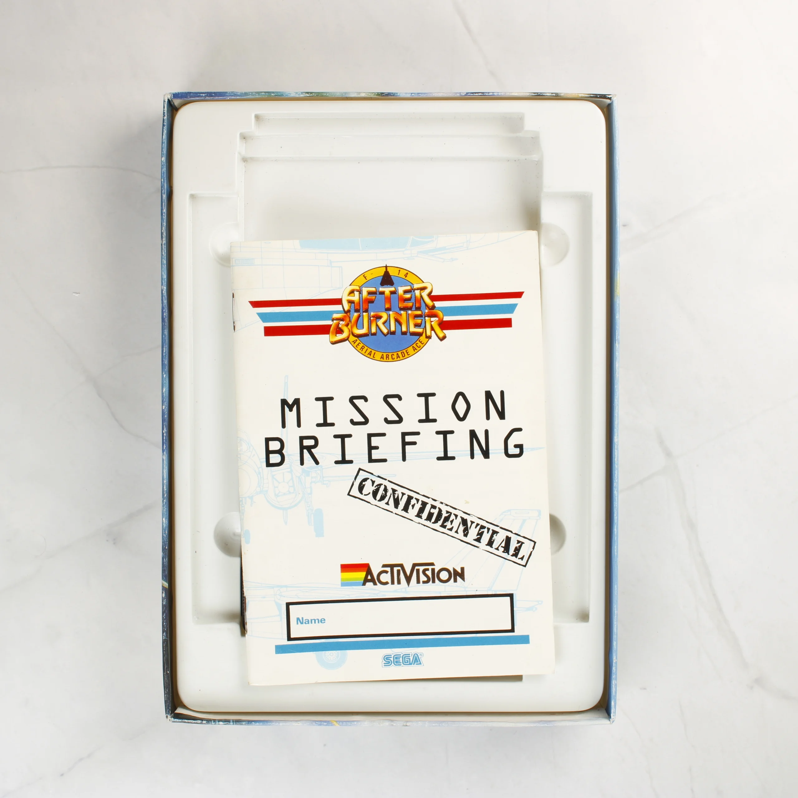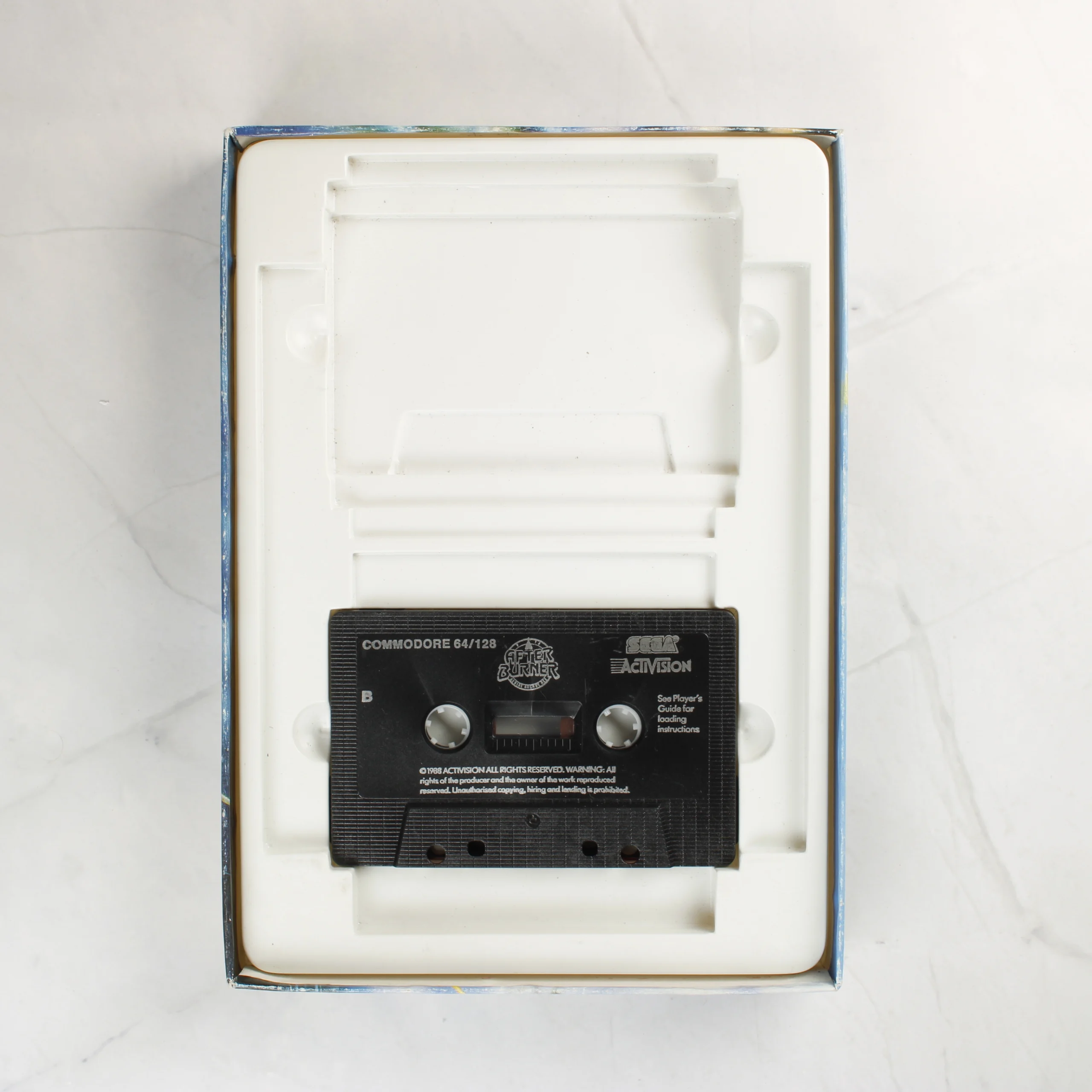 Az After Burner videójáték Commodore 64/128 platformra készült kiadása, amely egy nagyméretű kartondobozban található. A csomag tartalmaz egy fekete színű mágnesszalagos kazettát, amelyen a játék címe és a kiadók logói láthatóak. Mellékelve van egy fehér alapszínű, Mission Briefing feliratú használati útmutató füzet is. A doboz elején látványos illusztráció látható vadászgépekről és egy repülőgép-hordozóról, a Sega és az Activision logóival. A hátoldalon angol nyelvű leírás, képernyőmentések és egy vonalkódos matrica található. A belső részben egy fehér műanyag tálca tartja a kazettát és a füzetet.