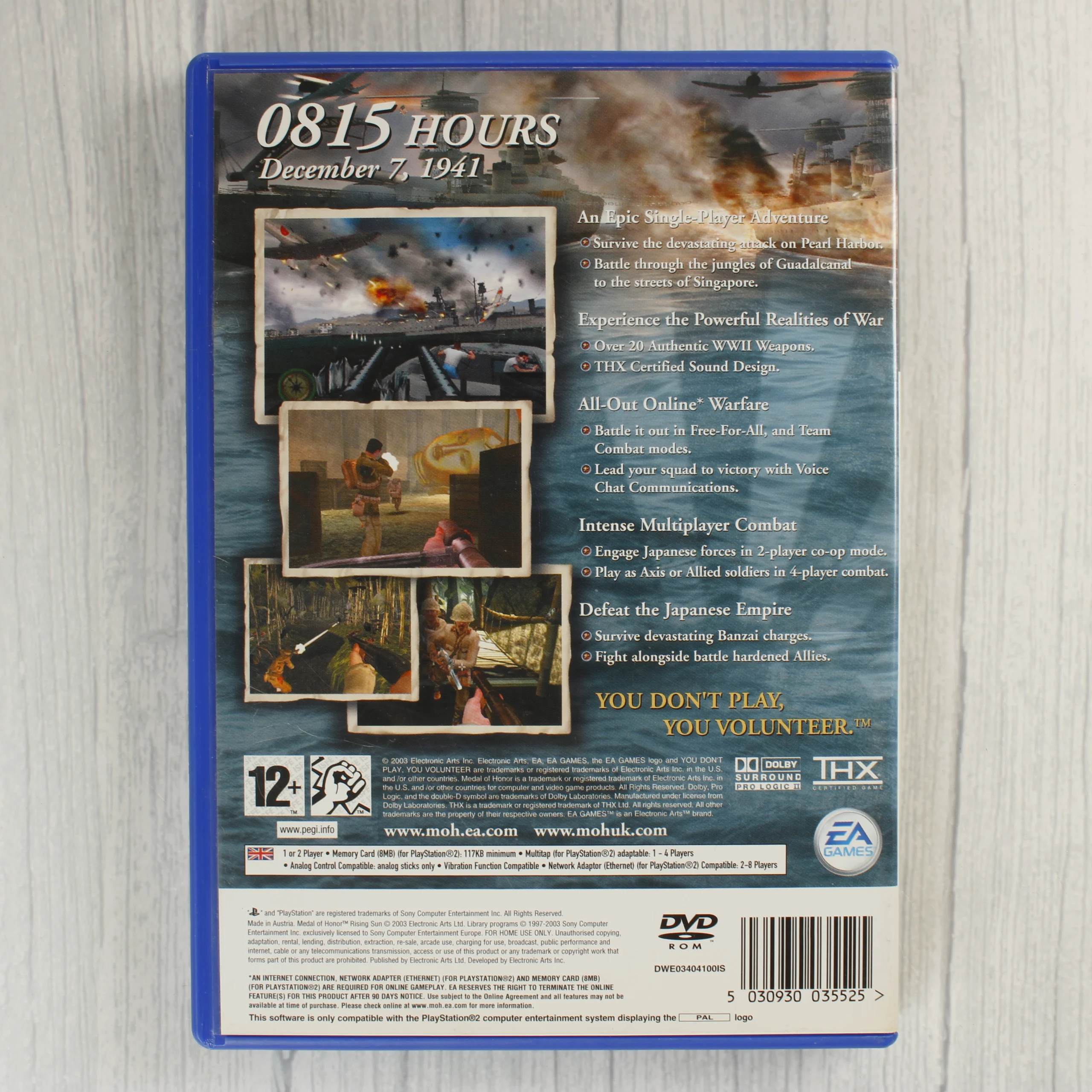 A Medal of Honor Rising Sun egy PlayStation 2 konzolra megjelent videójáték. A csomag tartalmazza a kék színű műanyag tokot, a színes borítót és az eredeti DVD-ROM lemezt. A borító előlapján egy katona látható harci jelenetben, valamint egy 9/10-es értékelést jelző matrica és egy 12+-os PEGI korhatár-besorolás. A hátoldalon a játékmenetből vett képek, technikai adatok és a vonalkód szerepelnek. A belső részben kialakított hely van a memóriakártya számára. A lemez felülete sötétkék alapszínű, rajta a játék logójával és a PlayStation 2 felirattal. A tok és a borító állapota használt, a műanyag fólián apróbb karcok és kopásnyomok láthatóak.