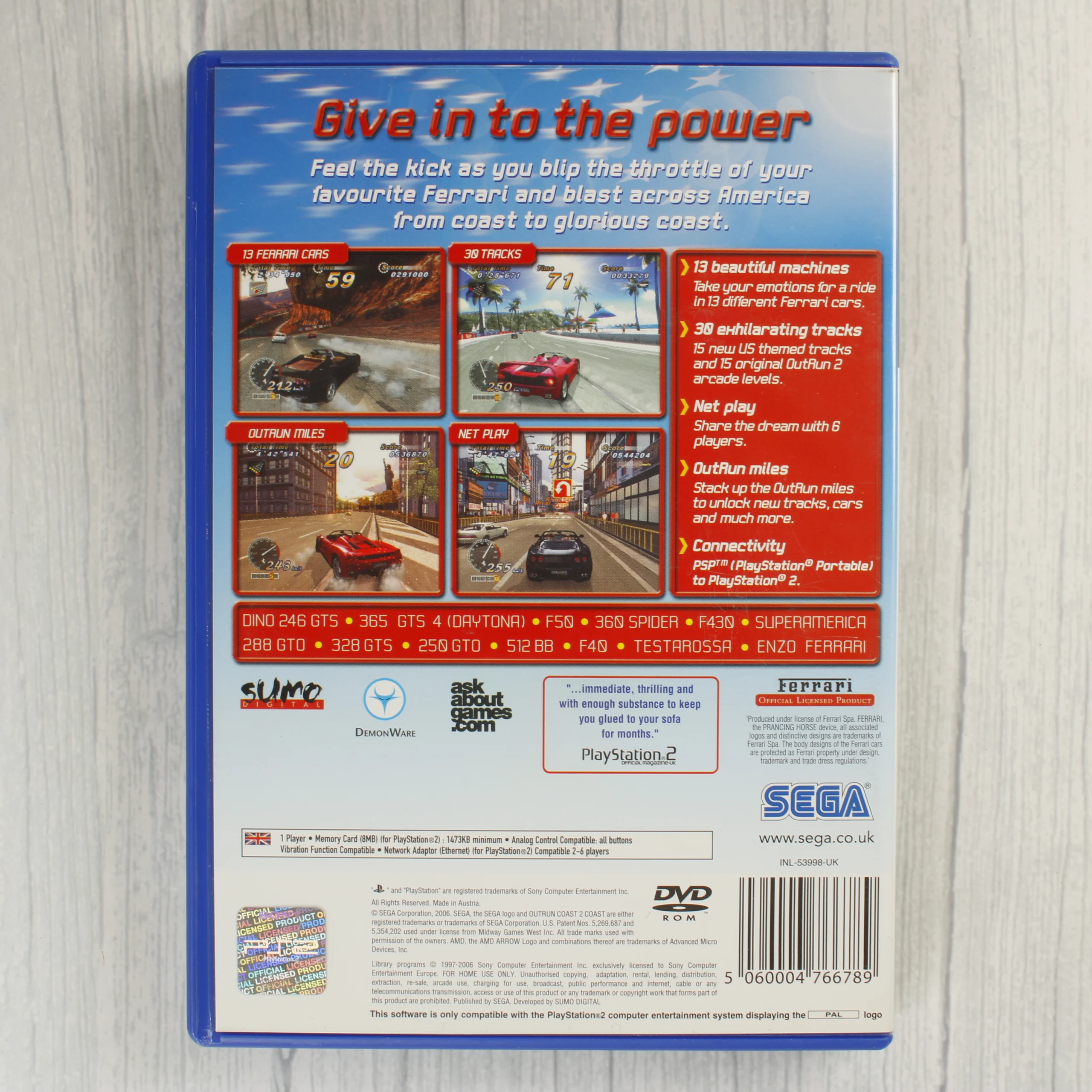 Az OutRun 2006 Coast 2 Coast egy PlayStation 2 konzolra megjelent autóversenyzős videójáték. A csomag tartalmazza az eredeti kék színű műanyag tokot, a színes borítót és a játékot tartalmazó DVD-ROM lemezt. A borító előlapján egy piros Ferrari látható tengerparti környezetben, a SEGA és a PlayStation 2 logóival. A hátoldalon játékmenet-fotók és technikai adatok szerepelnek, kiemelve a 13 licencelt Ferrari autót és a 30 különböző pályát. A lemez piros alapszínű, rajta a játék címével és a hivatalos Ferrari licenc matricával. A tok belső részén kialakított hely van a memóriakártya számára is. A kiadvány PAL rendszerű, és 3 éves kortól ajánlott PEGI besorolással rendelkezik.