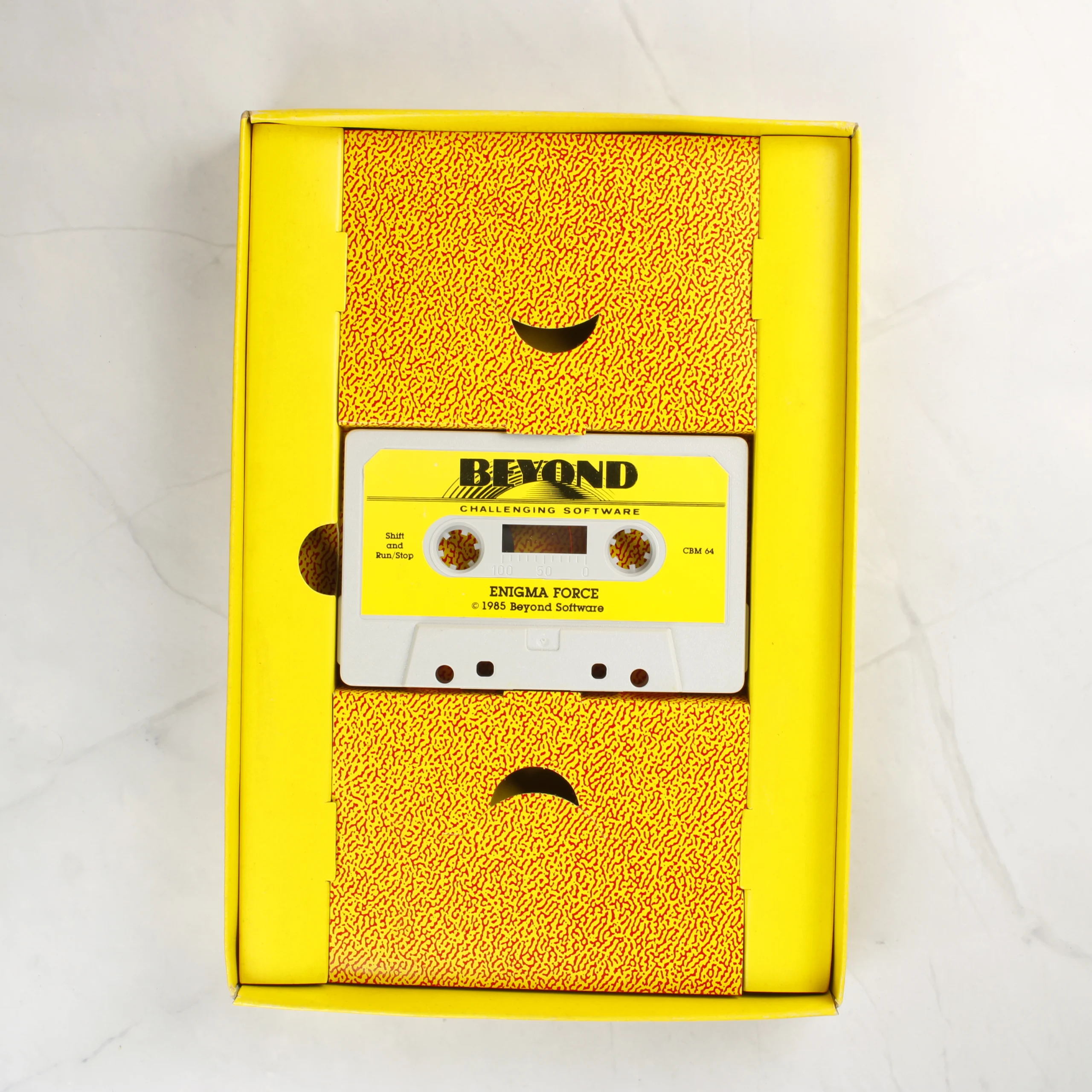 Az Enigma Force egy 1985-ös kiadású videójáték Commodore 64 (CBM 64) platformra, a Beyond Challenging Software gondozásában. A termék egy nagyméretű, sárga szegélyű kartondobozban található, amelynek előlapján színes, sci-fi stílusú illusztráció látható három karakterrel és egy futurisztikus járművel. A doboz hátoldala leírást, képernyőképet és vonalkódot tartalmaz. A csomag belső része egy sárga kartonbetétet rejt, amelyben egy fehér színű, sárga címkés magnókazetta helyezkedik el. A kazettán fekete felirat jelzi a játék címét és a kiadót. A doboz élei mentén enyhe kopás és használati nyomok láthatóak, de a csomagolás szerkezetileg ép.