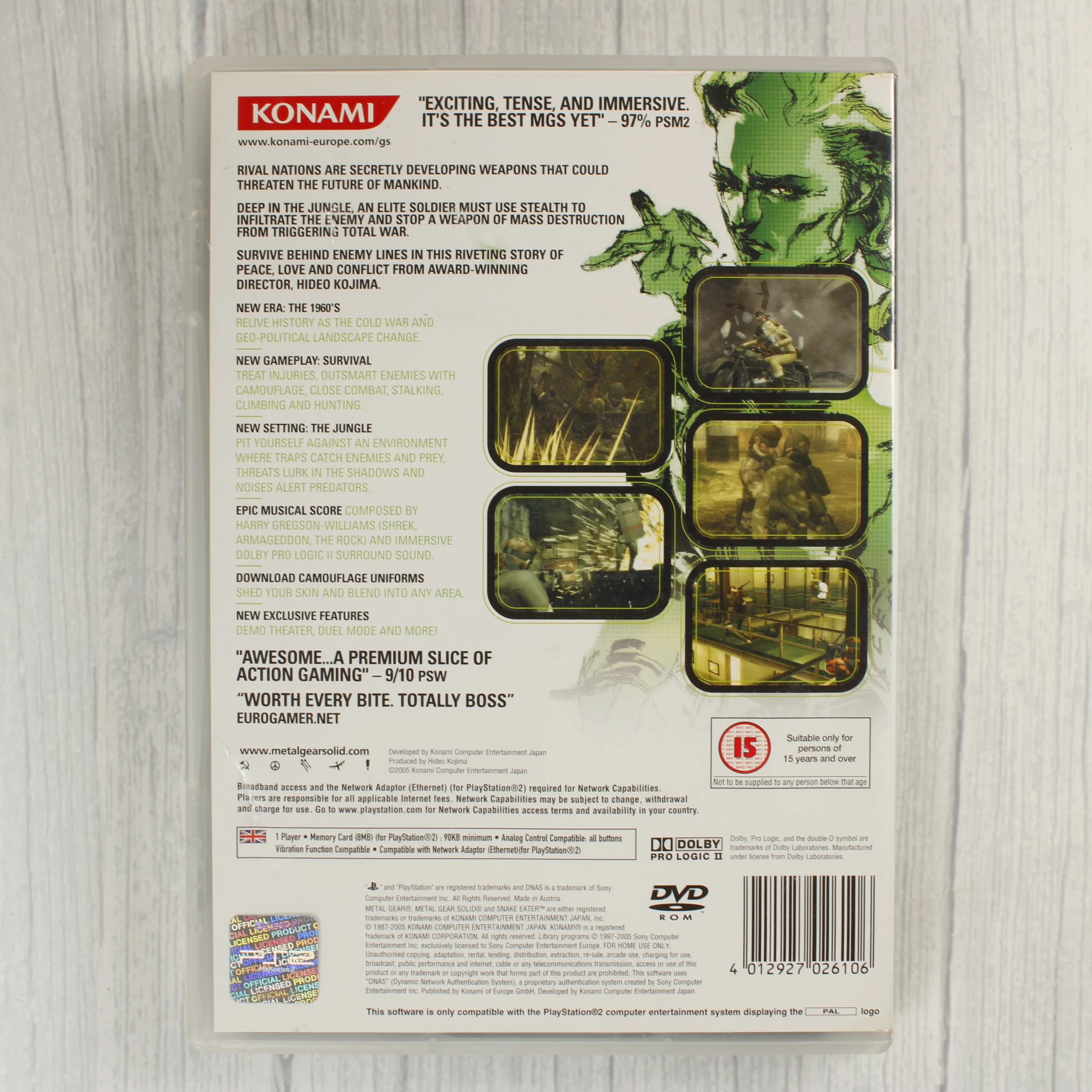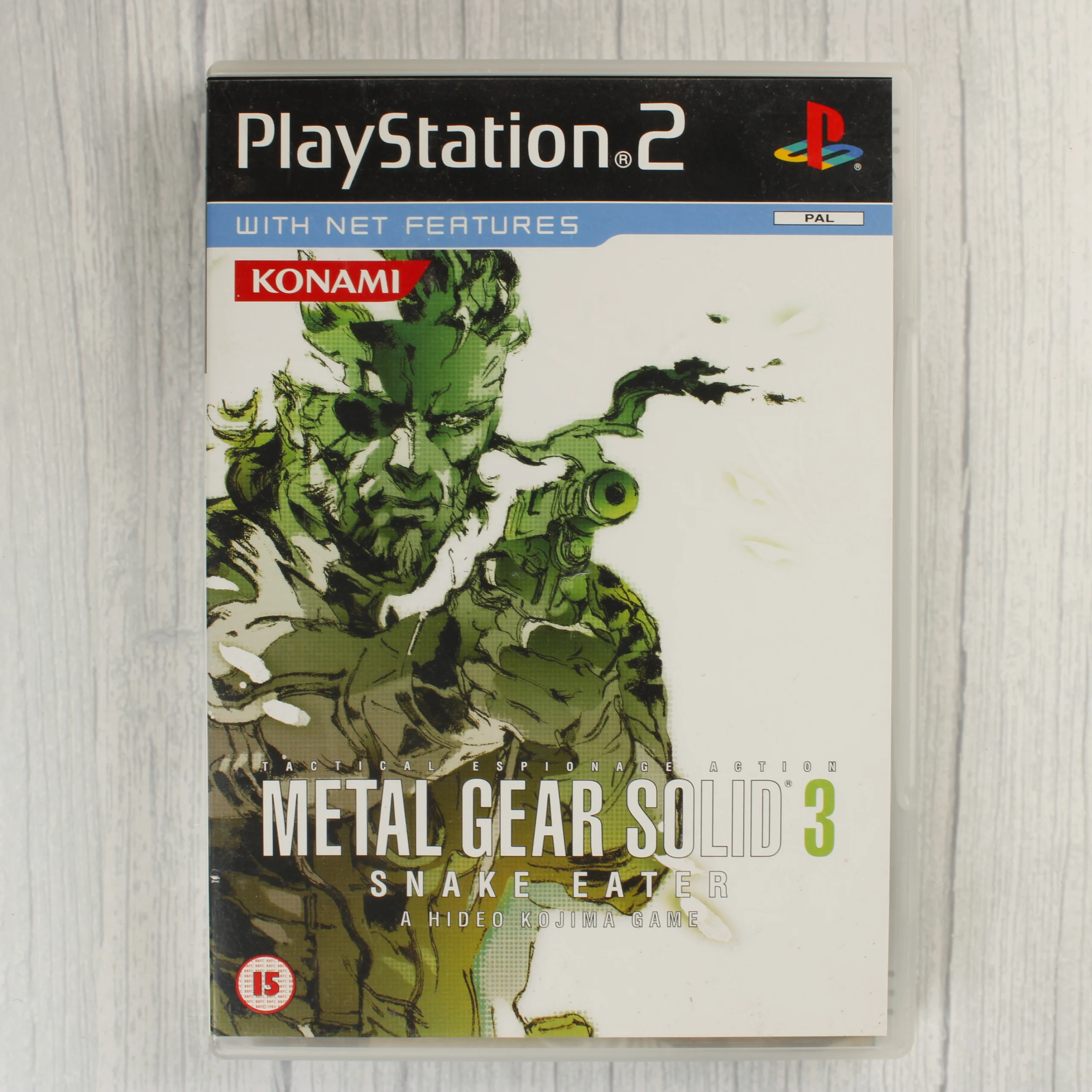A Metal Gear Solid 3: Snake Eater videójáték PlayStation 2 konzolra. A csomag tartalmazza az eredeti műanyag tokot, a színes borítót, a használati útmutatót és a játéklemezt. A borítón Snake karaktere látható zöldes árnyalatú, művészi stílusú grafikával. A tok hátoldalán angol nyelvű leírás, játékmenet-fotók és technikai adatok szerepelnek. A lemez fekete alapszínű, rajta a játék címe és a Konami logója látható. Ez a PAL régiós kiadás, amely 15 éves kortól ajánlott besorolással rendelkezik.
