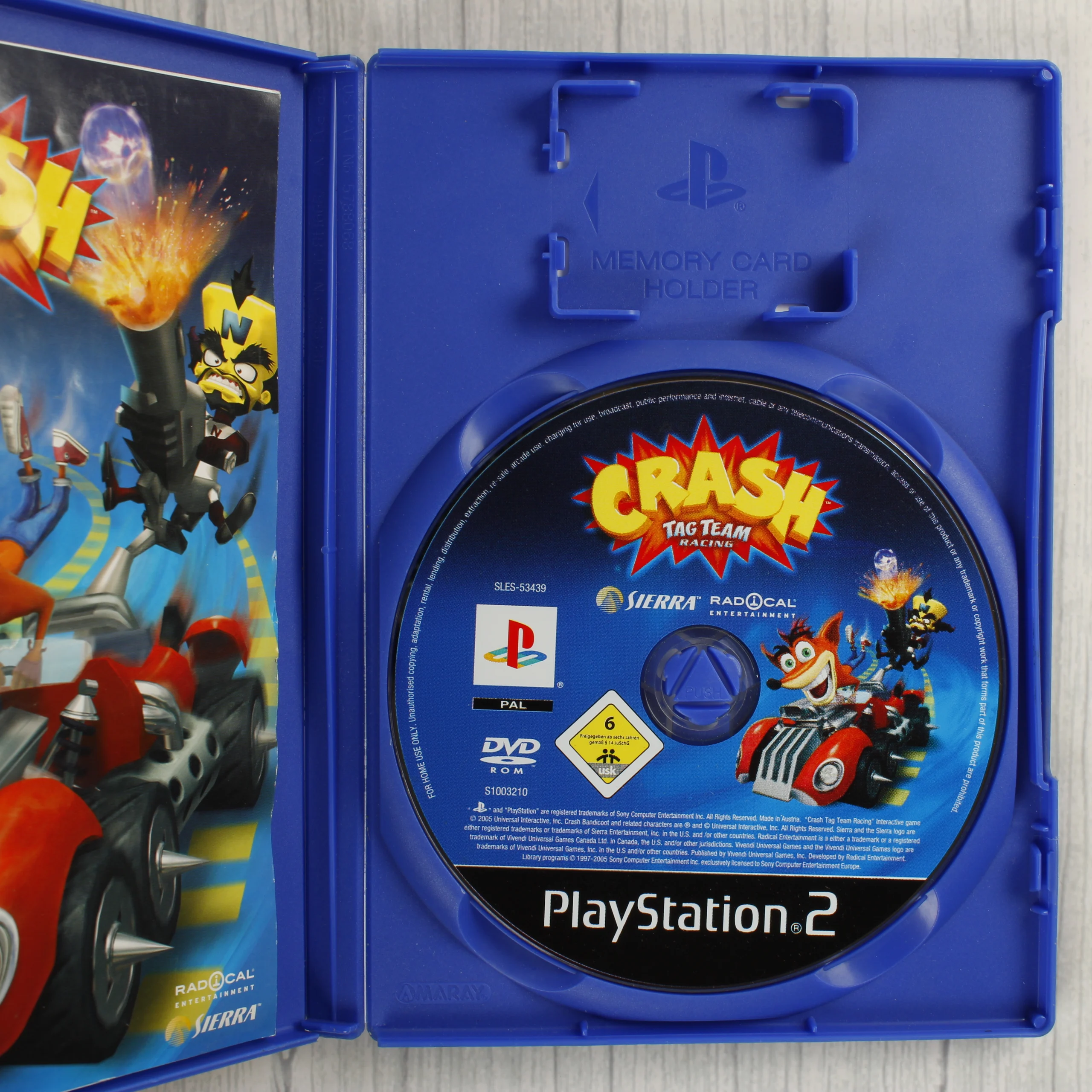 A Crash Tag Team Racing egy PlayStation 2 konzolra megjelent videójáték, amely kék színű, normál műanyag tokban található. A borítón Crash Bandicoot és Dr. Neo Cortex látható versenyautókban, akciódús jelenetben. A csomag tartalmazza az eredeti DVD-ROM lemezt, amelyen a játék címe és a PlayStation 2 logója is szerepel. A tok belső részén egy memóriakártya-tartó rekesz is kialakításra került. A hátoldalon színes képernyőmentések és a játék funkcióit bemutató leírások olvashatók angol nyelven. A terméken látható a PEGI 7-es korhatár-besorolás és a PAL régiókód. A kiadó a Sierra, a fejlesztő pedig a Radical Entertainment.