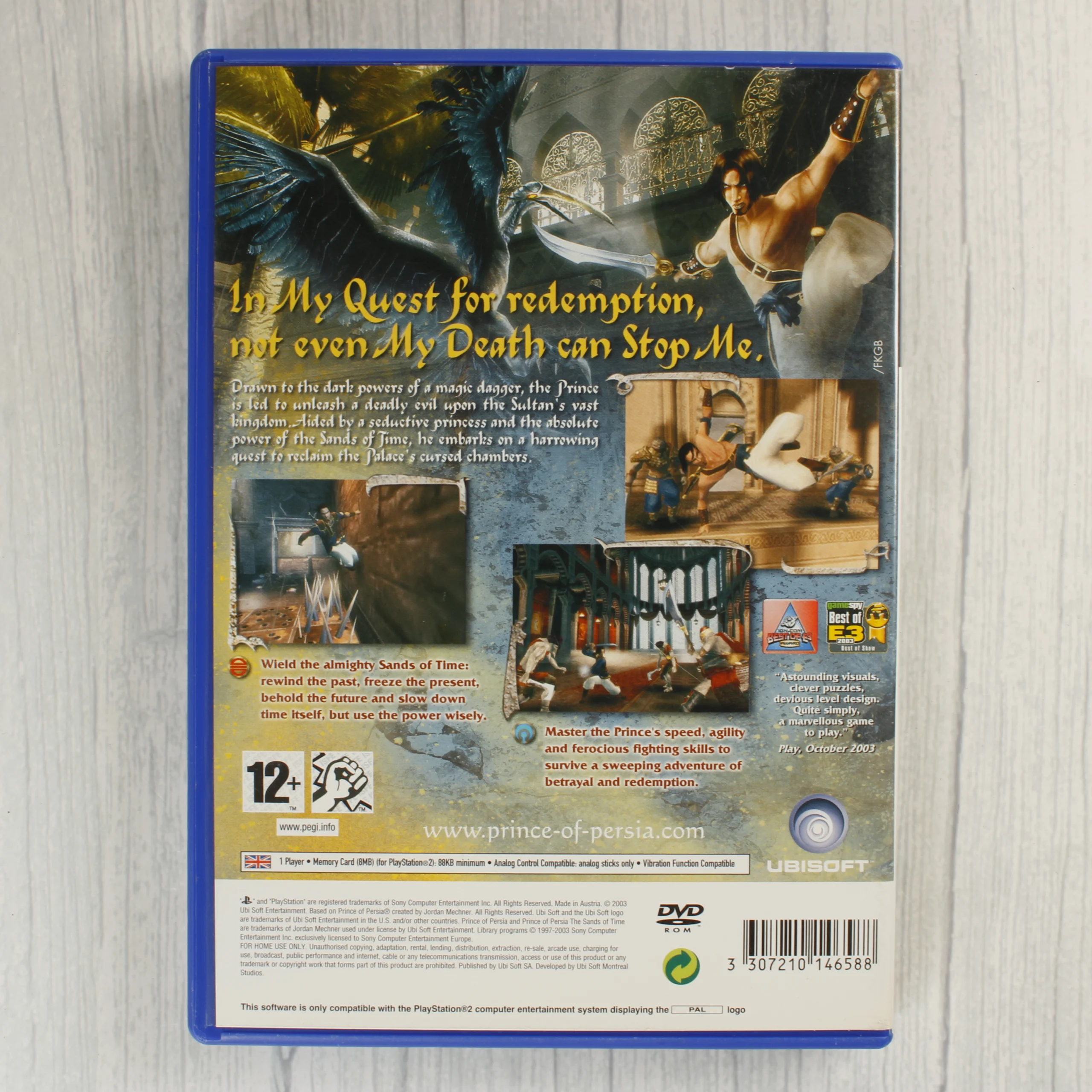A Prince of Persia: The Sands of Time egy PlayStation 2 konzolra megjelent videójáték. A csomag tartalmazza az eredeti kék színű műanyag tokot, a színes borítót, a játéklemezt és a használati útmutatót. A borítón a főhős látható akció közben, keleti épületekkel a háttérben. A tok hátoldalán angol nyelvű leírás és játékmenet-fotók találhatók. A lemez fekete alapszínű, rajta a játék logójával és a PEGI 12-es korhatár-besorolással. A tok belső részén egy memóriakártya-tartó is kialakításra került. A termék használt, de megkímélt állapotban van, a borító és a lemez felülete tiszta, komolyabb sérülésektől mentes.
