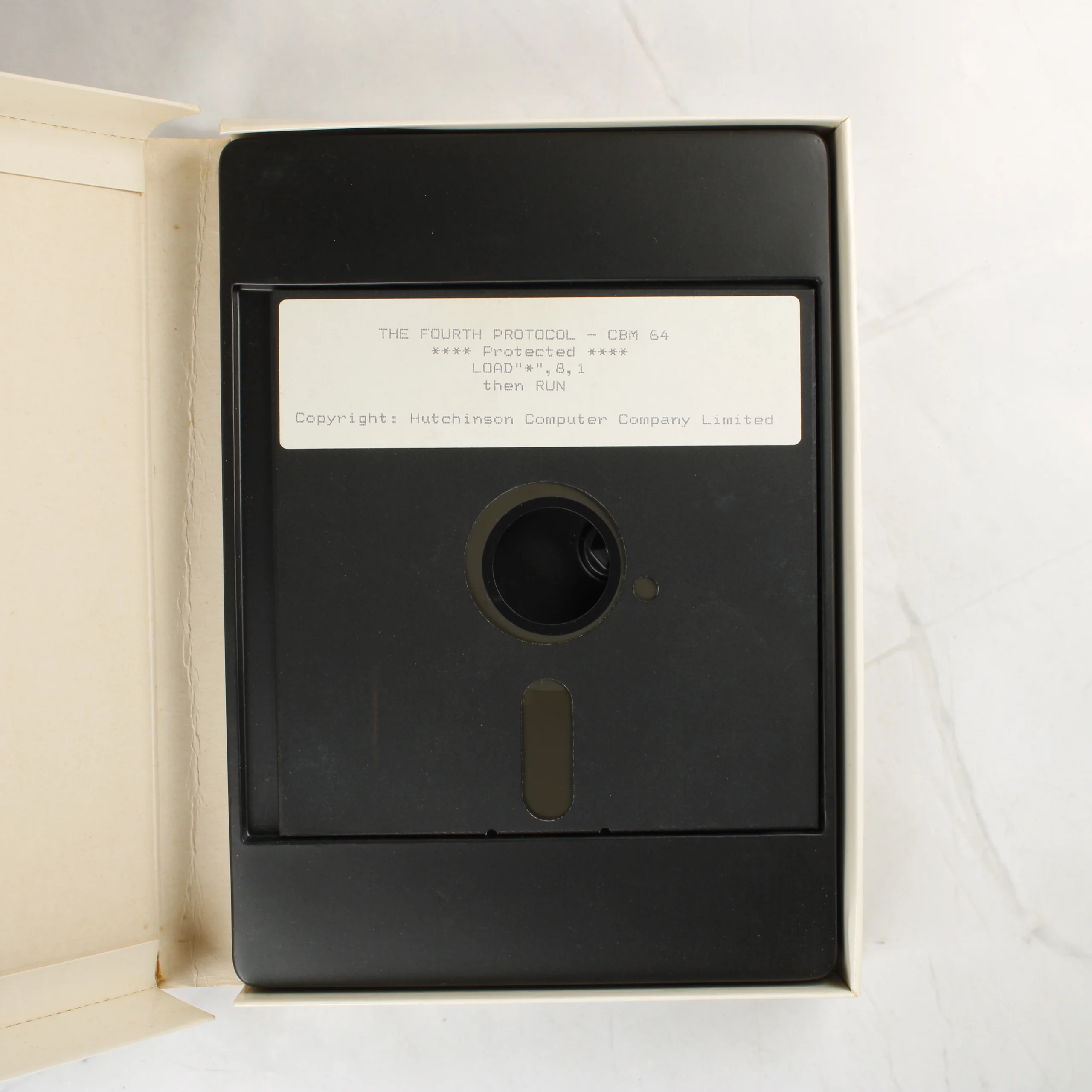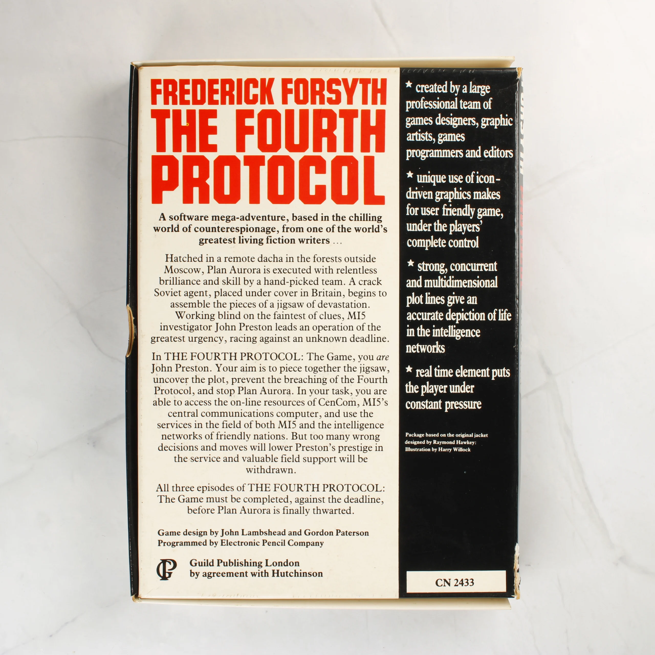 A Frederick Forsyth: The Fourth Protocol című videójáték Commodore 64 platformra készült kiadása. A csomag egy nagyméretű, fehér és fekete színvilágú kartondobozt tartalmaz, amelynek elején vörös feliratok és egy koponyás pecsét látható. A doboz belsejében egy 5,25 colos floppy lemez található fekete védőtokban, valamint egy MI5 Investigator's Handbook feliratú, fekete borítós használati útmutató. A hátoldalon részletes angol nyelvű leírás olvasható a játékmenetről és a történetről, valamint a Guild Publishing London logója is látható. A kiadvány az Electronic Pencil Company fejlesztése.
