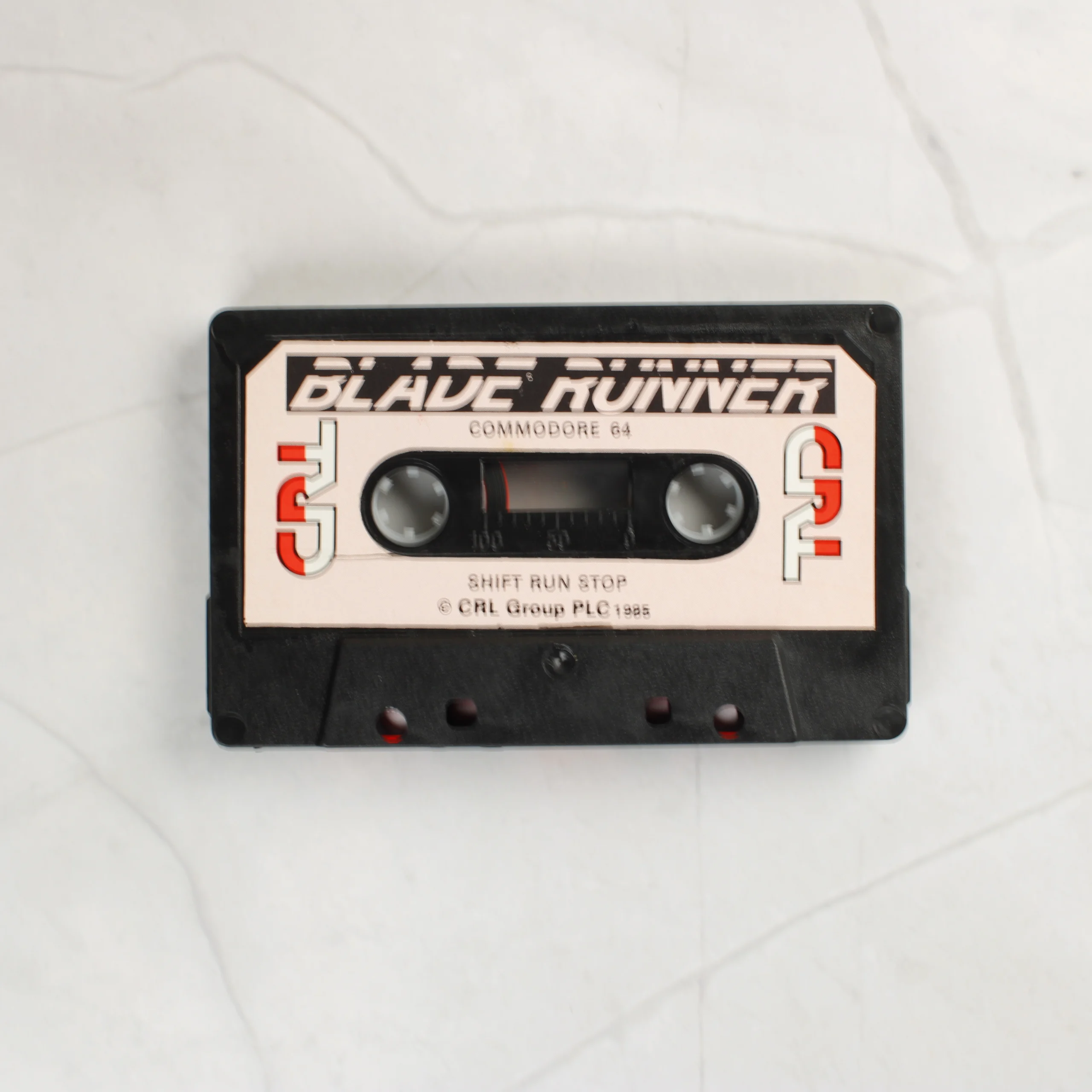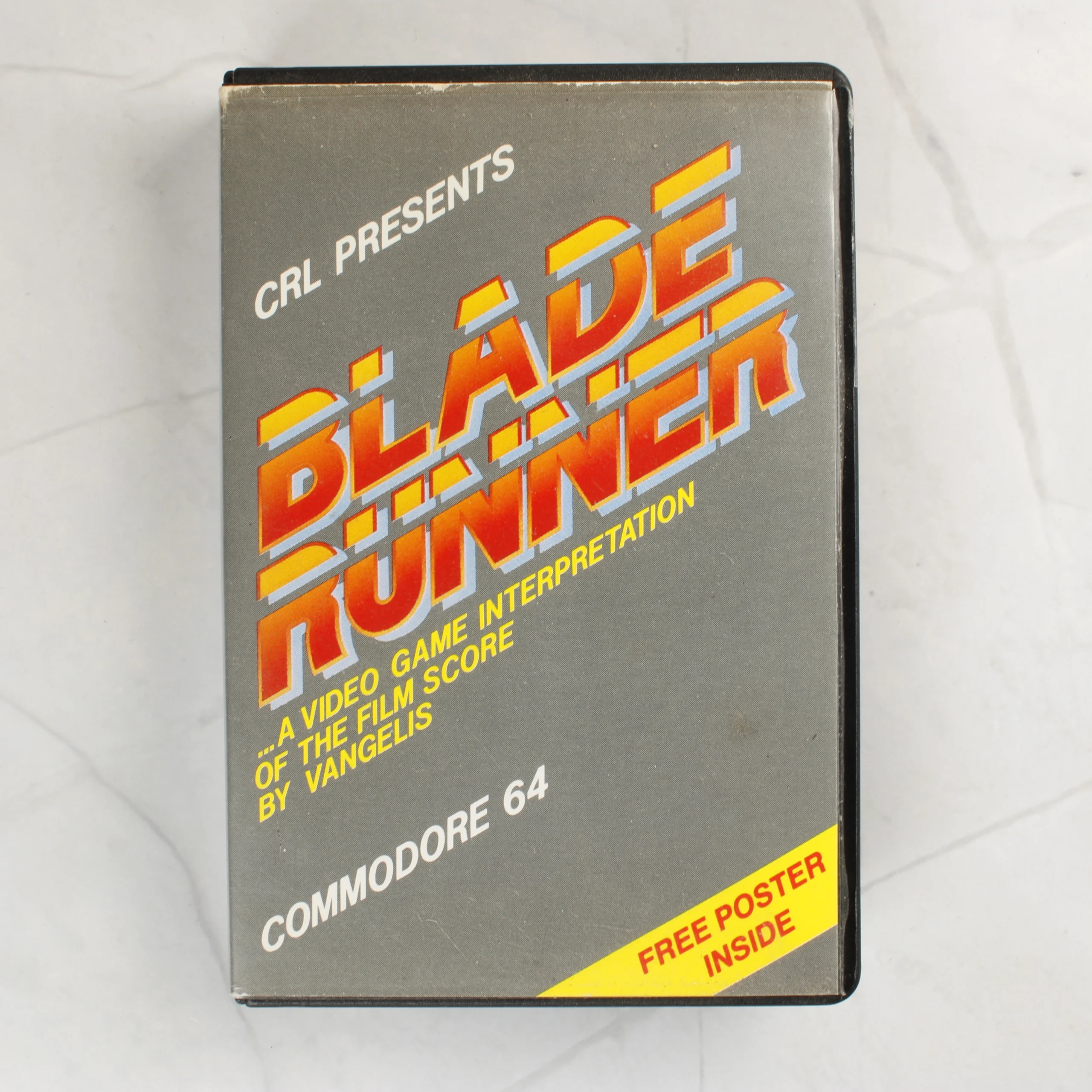 A Blade Runner videójáték Commodore 64 platformra kiadott változata, amely egy fekete műanyag tokban és egy szürke alapszínű papírborítóval rendelkezik. A borítón a cím narancssárga és sárga betűkkel látható, alatta Vangelis filmzenéjére való utalás olvasható. A csomag tartalmaz egy mágnesszalagos kazettát is, amelyen fehér alapon fekete és piros feliratok találhatók. A hátoldalon a játék történetének leírása, a CRL Group PLC adatai és egy vonalkód látható. A borító sarkán egy sárga sáv ingyen posztert ígér a csomag belsejében. A termék az 1980-as évekből származik, és a korának megfelelő fizikai állapotban van.