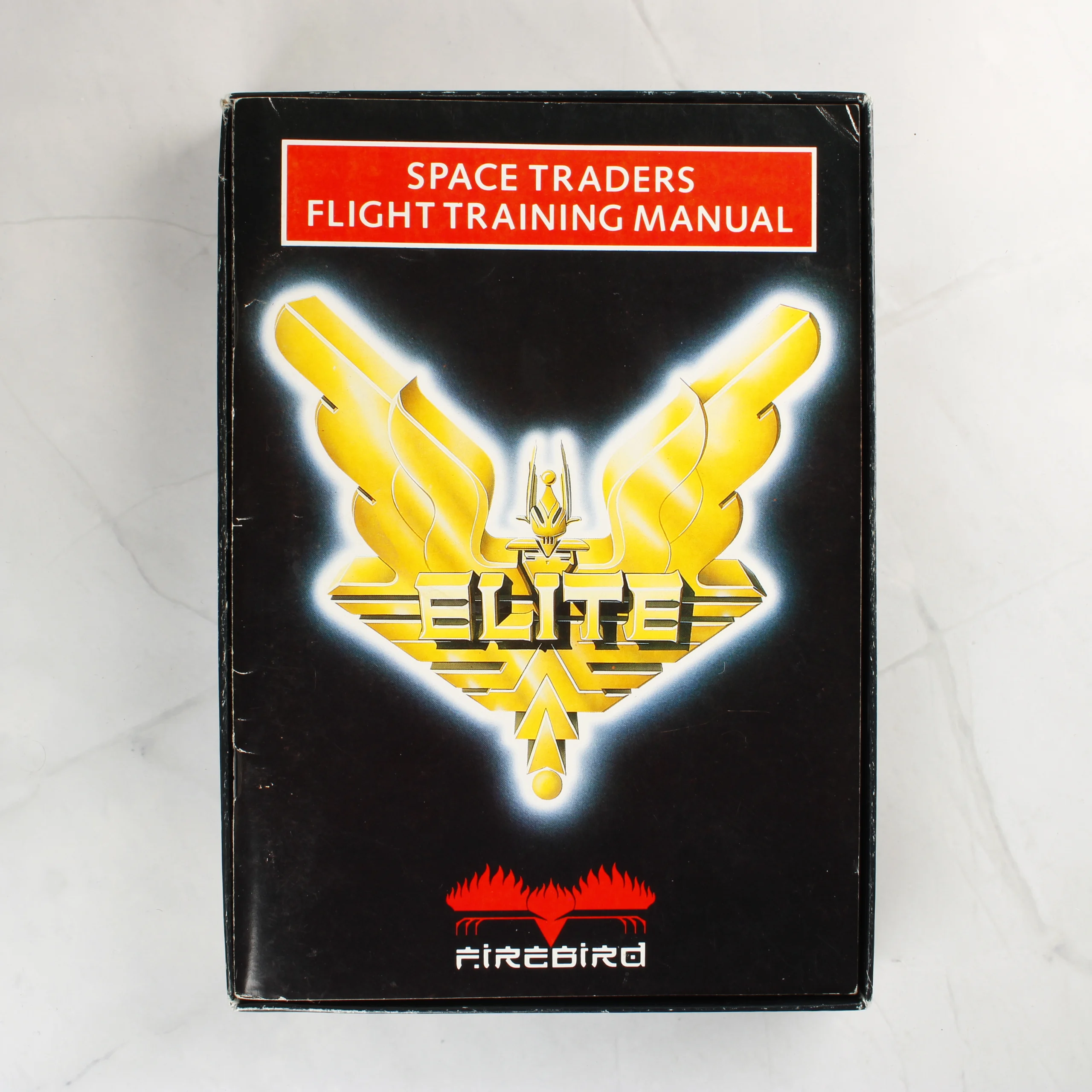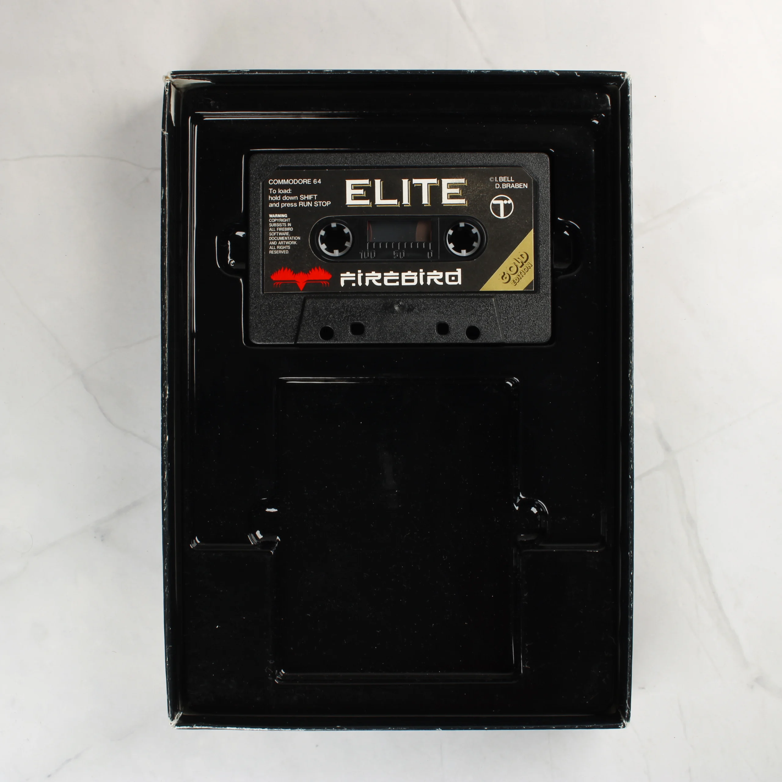 Az Elite Gold Edition videójáték Commodore 64 platformra, eredeti dobozos kiadásban. A csomag tartalmazza a fekete színű, feliratozott magnókazettát, amely egy műanyag belső tálcában helyezkedik el. A készlet része továbbá a Space Traders Flight Training Manual kézikönyv, egy Quick Key Control Guide irányítási segédlet, valamint Robert Holdstock The Dark Wheel című regénye. A doboz elején az ikonikus arany színű szárnyas logó látható a Firebird kiadó emblémájával. A hátoldalon angol nyelvű leírás, játékmenet-képernyőkép és vonalkód található. A papírdoboz élei mentén fehér kopásnyomok és kisebb gyűrődések láthatóak, de a grafika ép és jól kivehető.