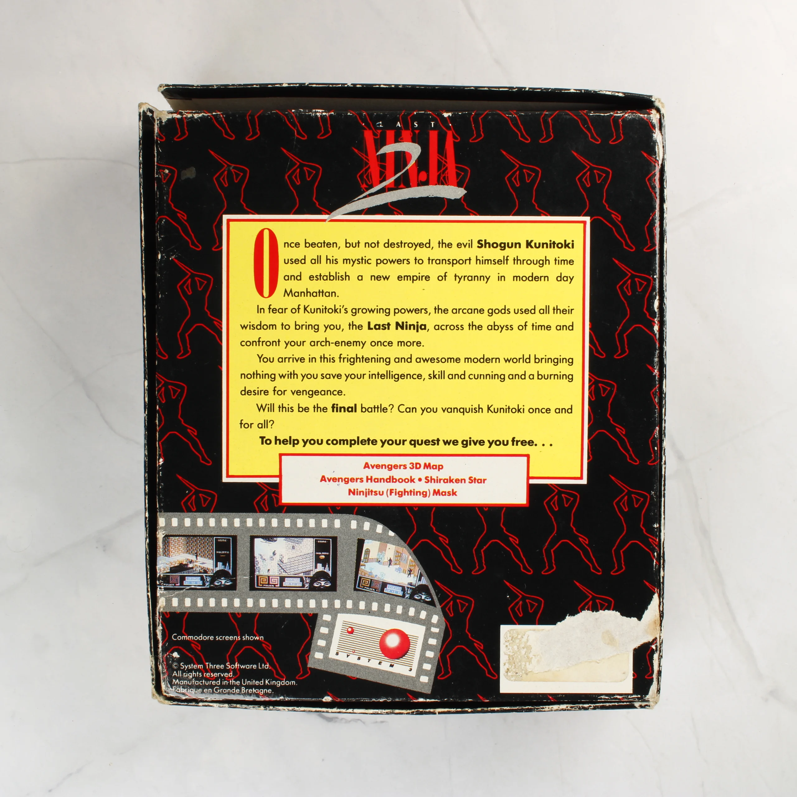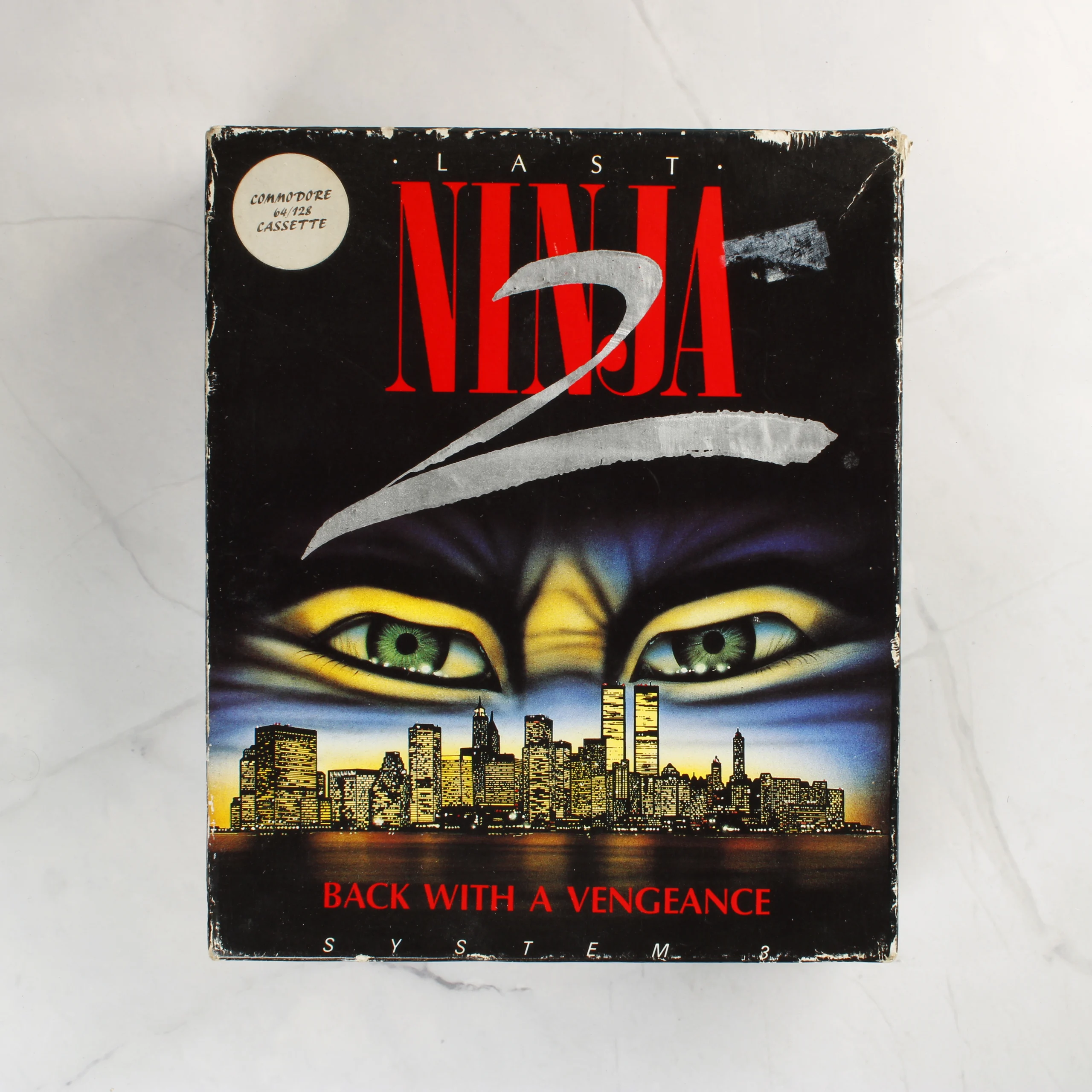 A Last Ninja 2: Back with a Vengeance egy klasszikus videójáték Commodore 64/128 platformra. A termék egy nagyméretű, illusztrált kartondobozban található, amelyen egy nindzsa szempár és New York városának éjszakai látképe látható. A csomag tartalmaz egy fekete színű mágnesszalagos kazettát, amely egy fekete műanyag tálcában helyezkedik el. A doboz hátoldalán a játék történetének leírása, képernyőképek és a mellékelt extrák listája olvasható angol nyelven. A kiadvány a System 3 gondozásában jelent meg 1988-ban. A csomagoláson látható grafika színes, dominánsan fekete, piros és kék árnyalatokkal.