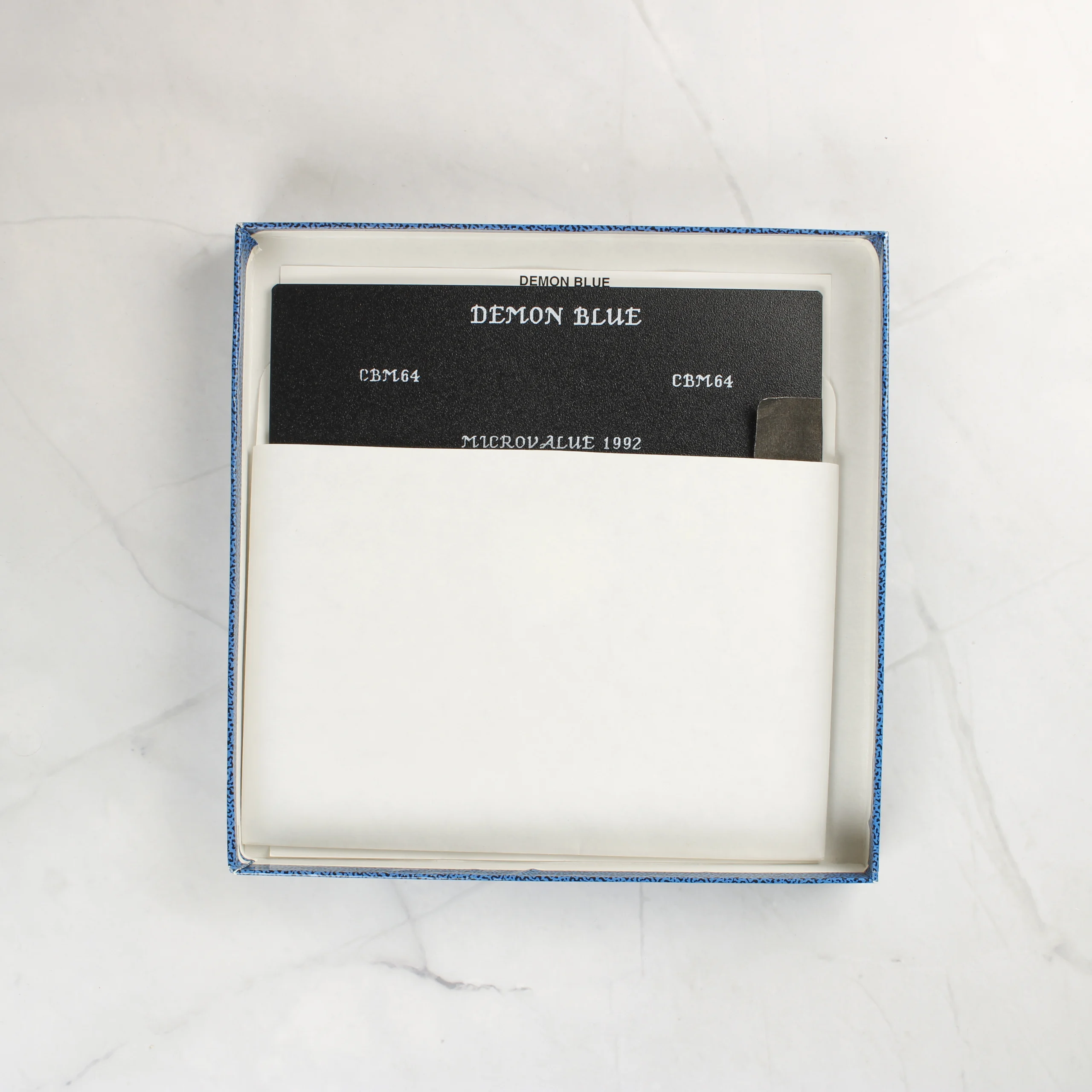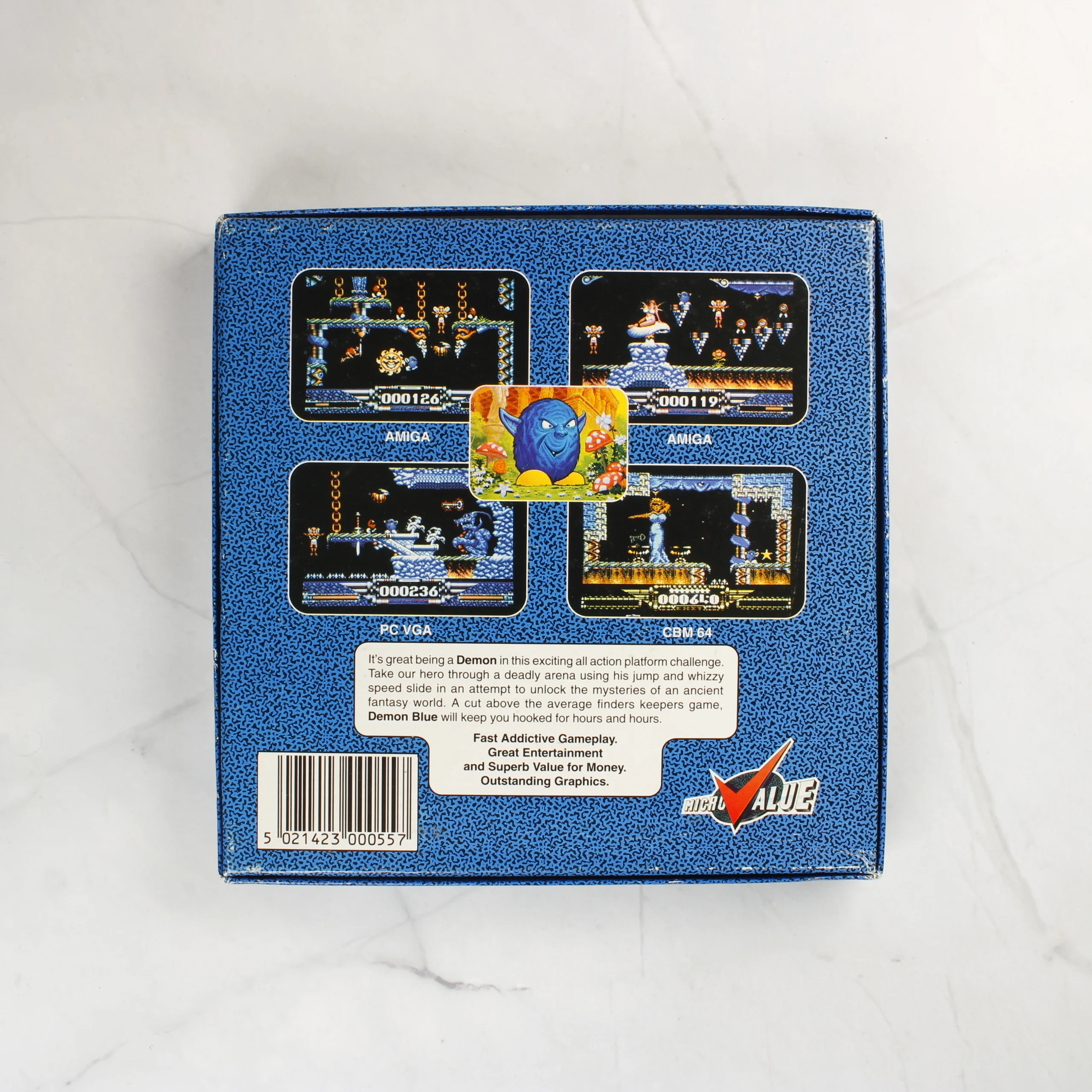 A Demon Blue egy 1992-es kiadású arcade fantasy stílusú videójáték Commodore 64 platformra. A termék egy eredeti, kék mintás kartondobozban található, amelynek előlapján egy kék színű, manószerű lény látható egy antik templom és gombák előtt. A csomag tartalmaz egy 5,25 colos floppy lemezt, amely fehér papírtokban pihen a doboz belsejében. A doboz hátoldalán színes képernyőmentések láthatóak az Amiga, PC VGA és CBM 64 verziókból, valamint egy rövid angol nyelvű leírás a játékmenetről. A kiadó a Microvalue, a dobozon pedig egy aranyszínű C64 matrica jelzi a kompatibilitást. A grafika élénk, a doboz sarkain és élein minimális kopás tapasztalható.
