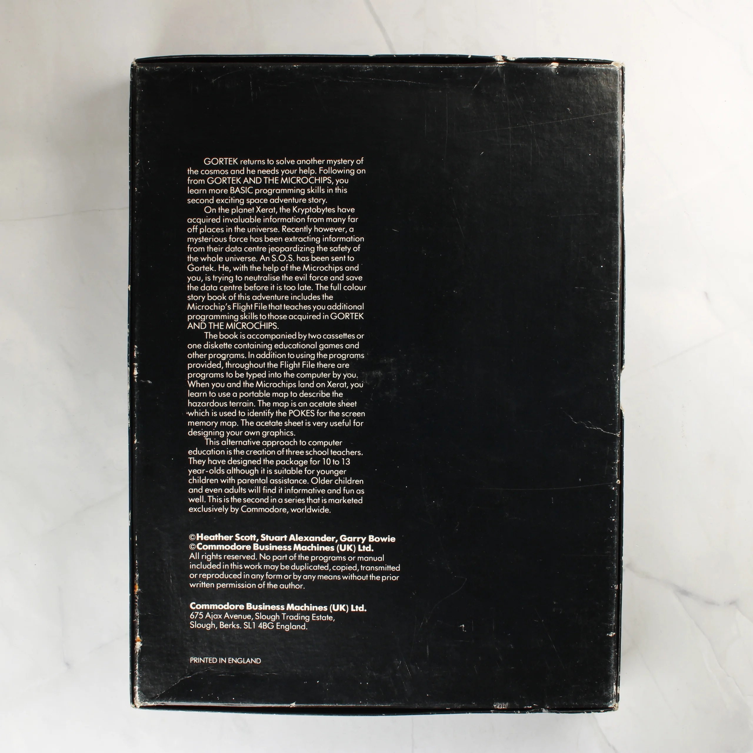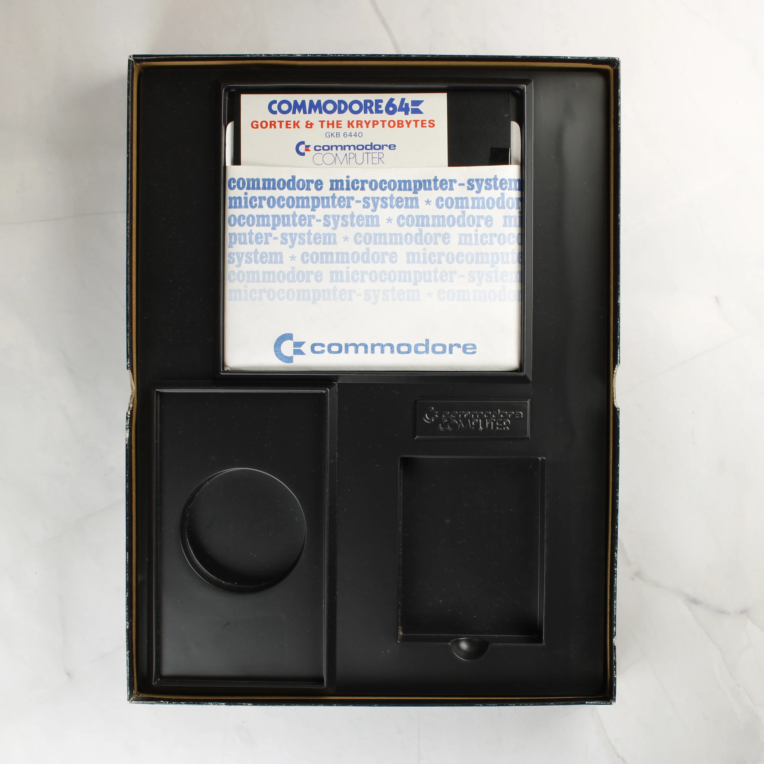 A Commodore 64 platformra megjelent Gortek and the Kryptobytes oktatóprogram és videójáték dobozos kiadása. A fekete kartondoboz elején színes, sci-fi stílusú illusztráció látható két idegen lénnyel egy számítógépes terminál előtt. A csomag tartalmaz egy 5,25 colos floppy lemezt eredeti papírtokban, valamint egy sárgás árnyalatú, átlátszó acetát fóliát, amely a Commodore 64 képernyő-leképezését (Screen Mapper) segíti. A belső fekete műanyag tálca több rekeszt tartalmaz a kiegészítők számára. A doboz hátoldalán angol nyelvű leírás olvasható a program tartalmáról és a készítőkről. A termék a Commodore Business Machines (UK) Ltd. gondozásában jelent meg.