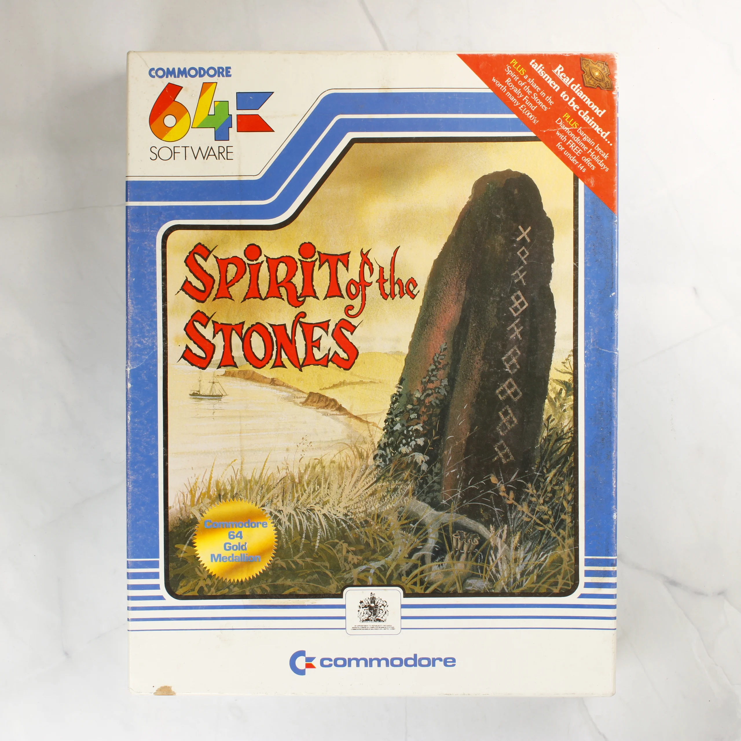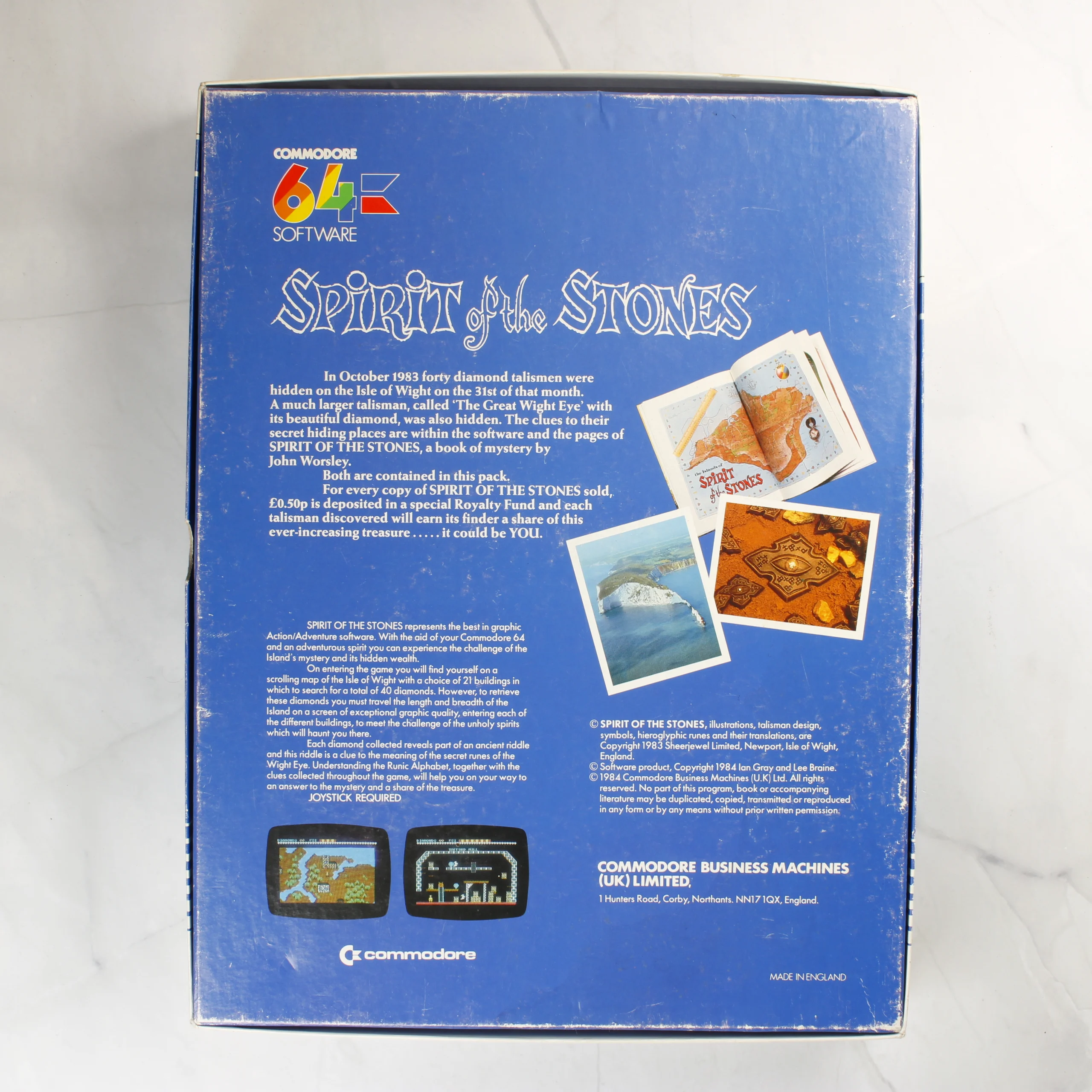 A Spirit of the Stones egy Commodore 64 platformra megjelent videójáték, amely egy nagyméretű, álló formátumú kartondobozban található. A csomag tartalmazza a szoftvert hordozó fekete cartridge-et, amely egy fehér papírtokban pihen a fekete műanyag belső tálcában. A készlet része továbbá egy színes, illusztrált kézikönyv is, amely John Worsley munkája. A doboz előlapján egy tengerparti tájkép látható egy rúnákkal díszített állókővel, a bal felső sarokban a klasszikus Commodore 64 Software logóval. A doboz hátoldala kék alapszínű, részletes angol nyelvű leírást, képernyőmentéseket és a kiadói adatokat tartalmazza. A csomagoláson látható egy aranyszínű Commodore 64 Gold Medallion matrica és egy piros sarokfelirat is.