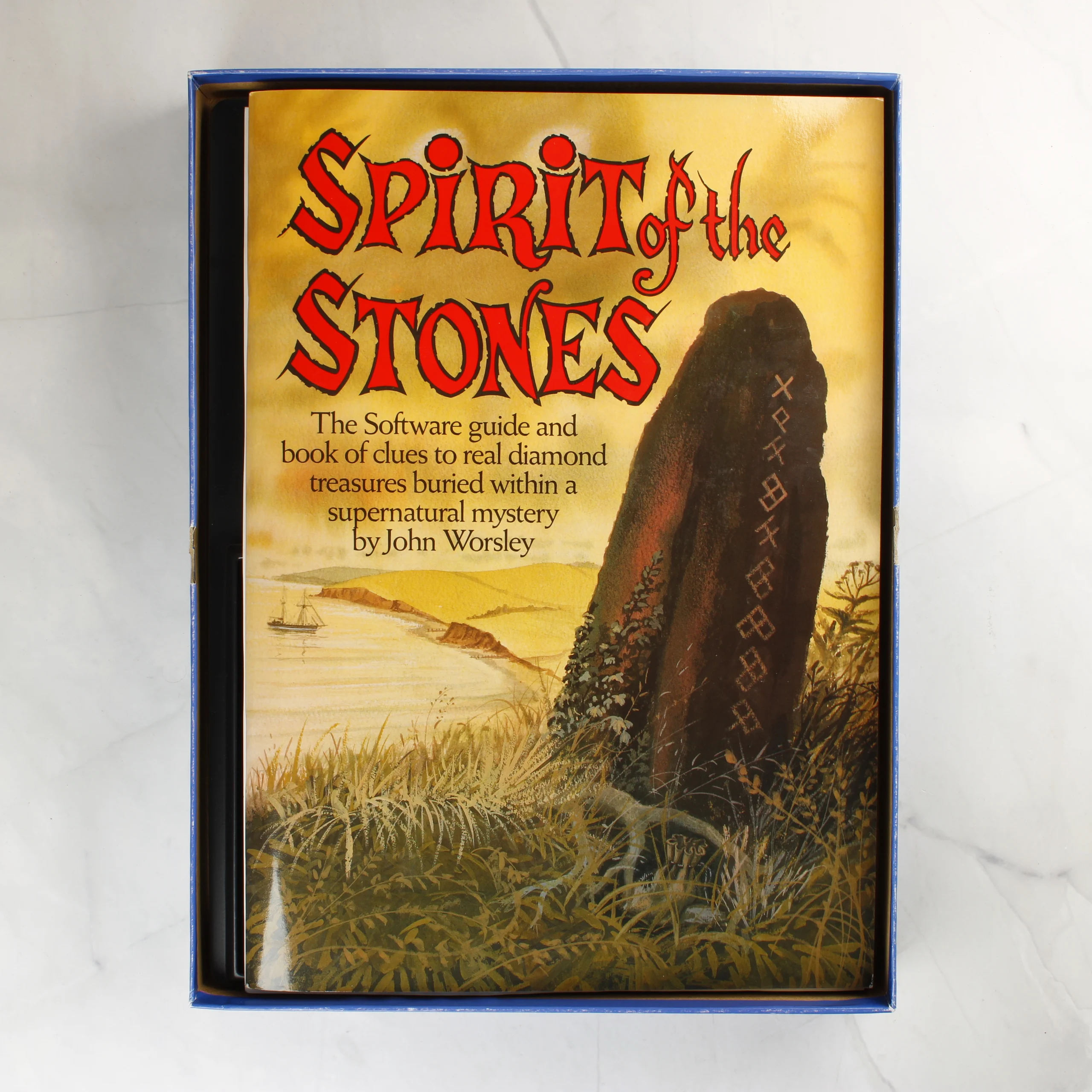Spirit of the Stones videójáték Commodore 64-re, eredeti dobozban, cartridge formátumban, John Worsley illusztrált útmutatójával.