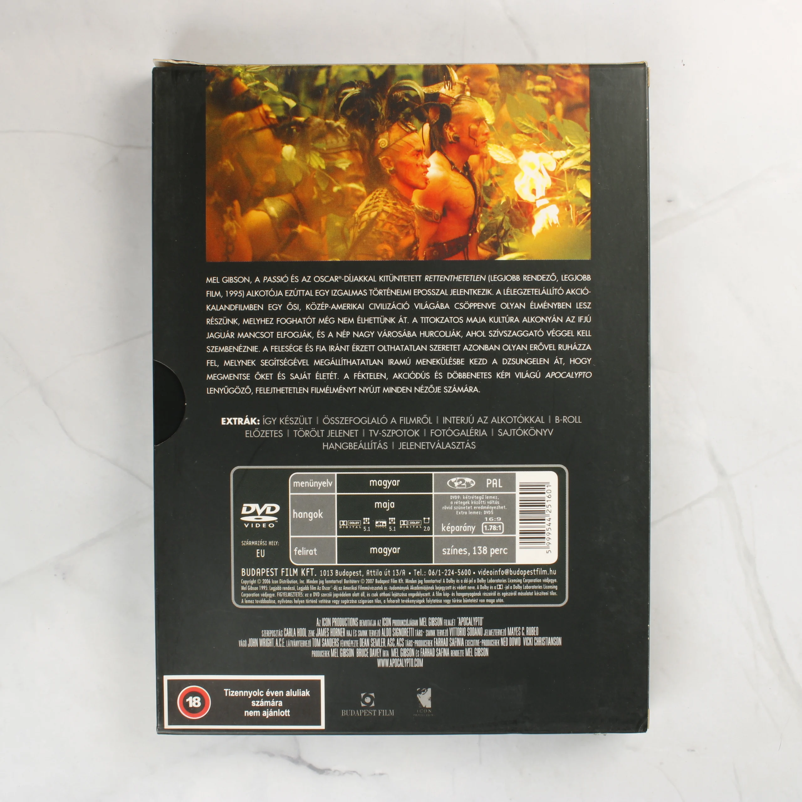 Mel Gibson Apocalypto című filmjének kétlemezes DVD kiadása. A csomag tartalmazza a mozifilmet és egy külön extra lemezt. A külső papírtok sötét tónusú, a film főszereplőjét és egy maja piramist ábrázolja. A belső kihajtható tokban két optikai lemez található, amelyek fekete felületűek, fehér feliratokkal. A tok belseje és a lemezek alatti rész színes filmjelenetekkel van illusztrálva. A hátoldalon magyar nyelvű leírás, technikai adatok és a Budapest Film logója látható. A kiadvány 18-as korhatár-besorolással rendelkezik.