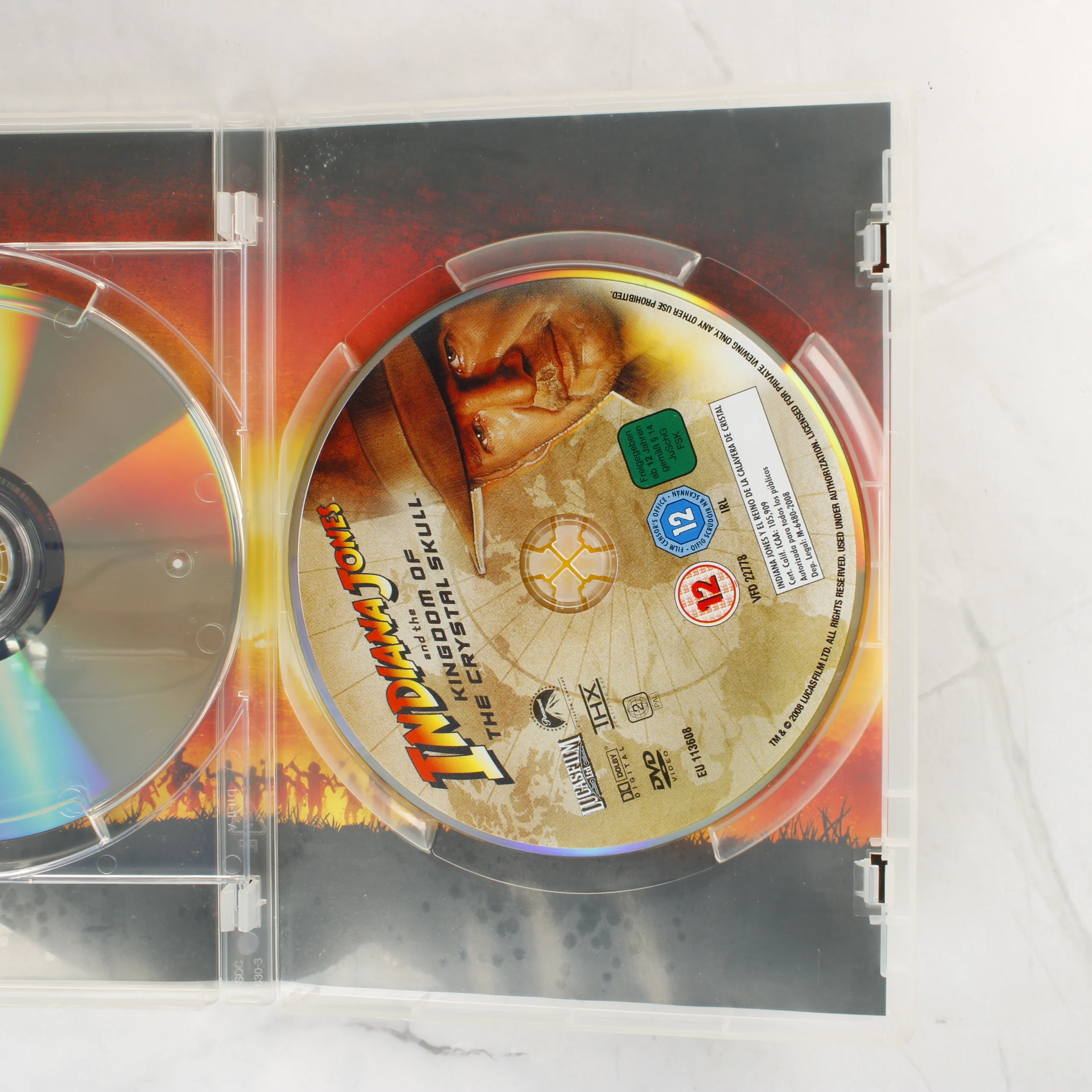 Az Indiana Jones és a kristálykoponya királysága című film kétlemezes kalandor-változata DVD formátumban. A kiadvány egy átlátszó műanyag tokban található, amely tartalmazza a filmet és egy külön lemezt az extra tartalmakkal. A borítón Harrison Ford látható a címszerepben, jellegzetes kalapjával és ostorával, lángoló háttér előtt. A hátoldalon magyar nyelvű leírás, jelenetfotók és a technikai adatok olvashatók, beleértve a választható feliratokat és hangsávokat. A lemezek felülete színes nyomtatással díszített, rajtuk korhatár-besorolási jelzések és stúdiólogók láthatók. A csomagolás és a lemezek megkímélt állapotban vannak.