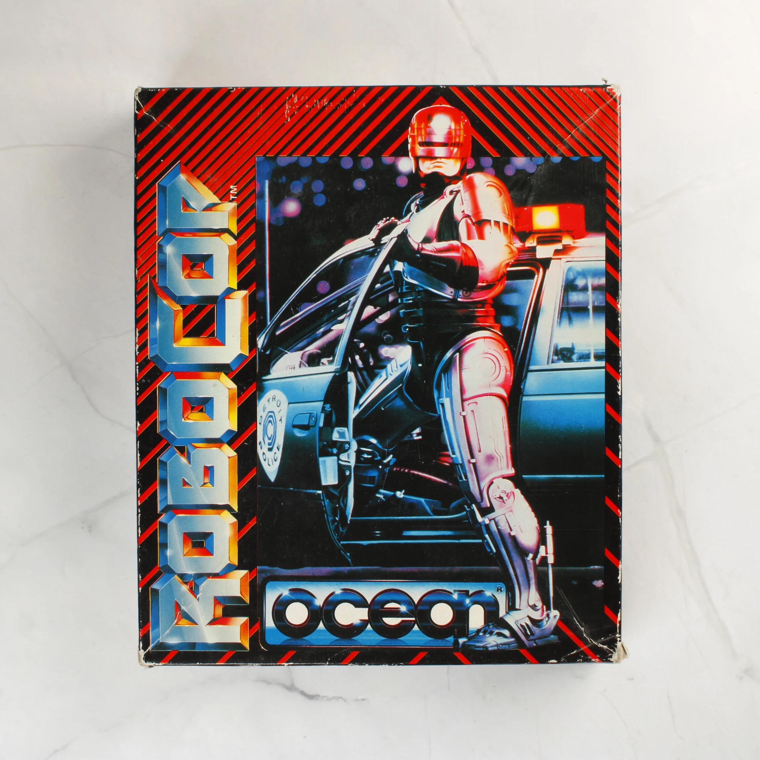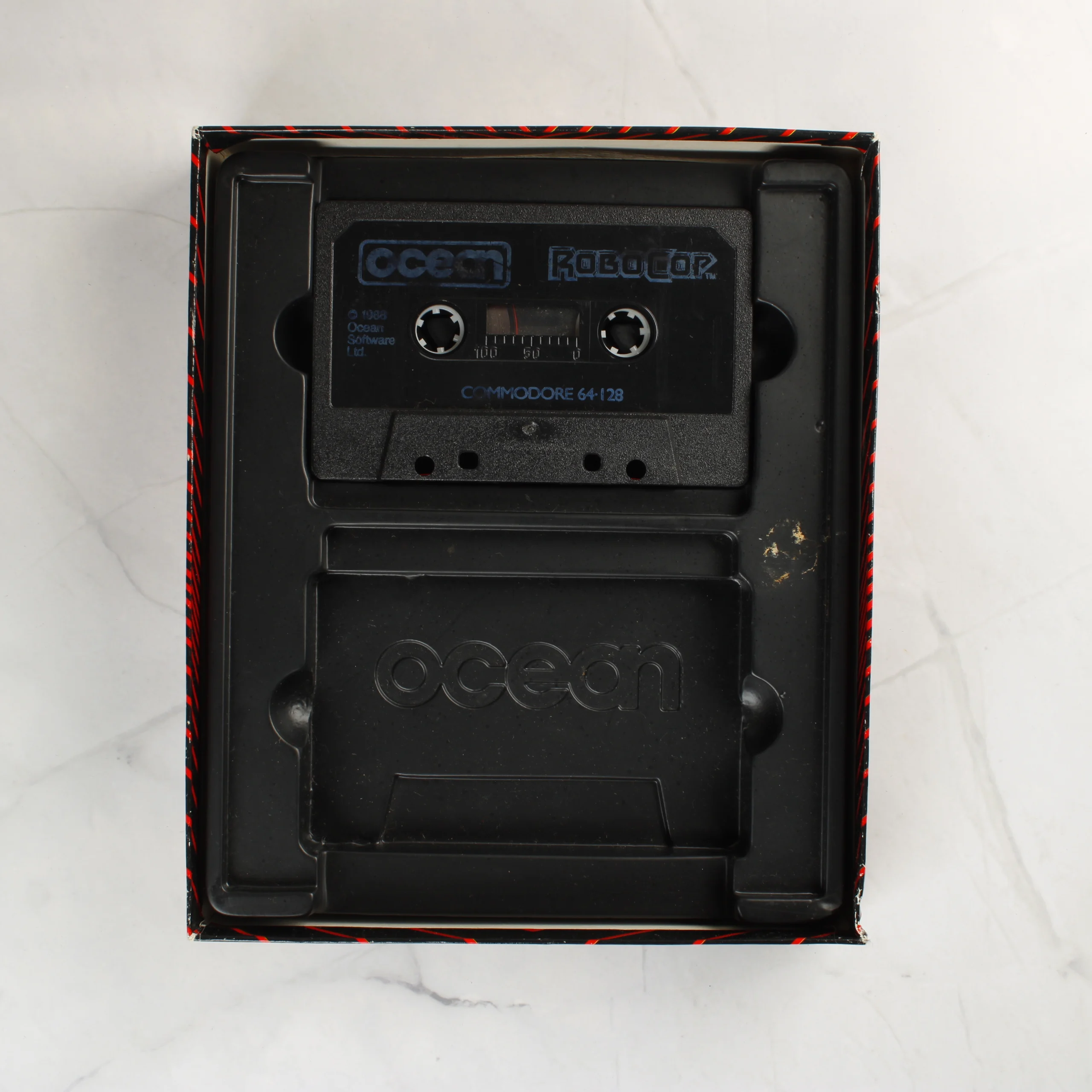 A RoboCop című videójáték Commodore 64/128 platformra kiadott változata, eredeti kartondobozos csomagolásban. A doboz elején a film ikonikus jelenete látható a rendőrautóból kiszálló főhőssel, az Ocean Software logójával. A csomag tartalmaz egy fekete színű magnókazettát, amely egyedi műanyag tálcában helyezkedik el. A doboz hátoldalán színes képernyőmentések és a játék angol, illetve francia nyelvű leírása olvasható. A grafika a klasszikus 80-as évekbeli stílust idézi, piros és fekete átlós csíkozással a széleken.