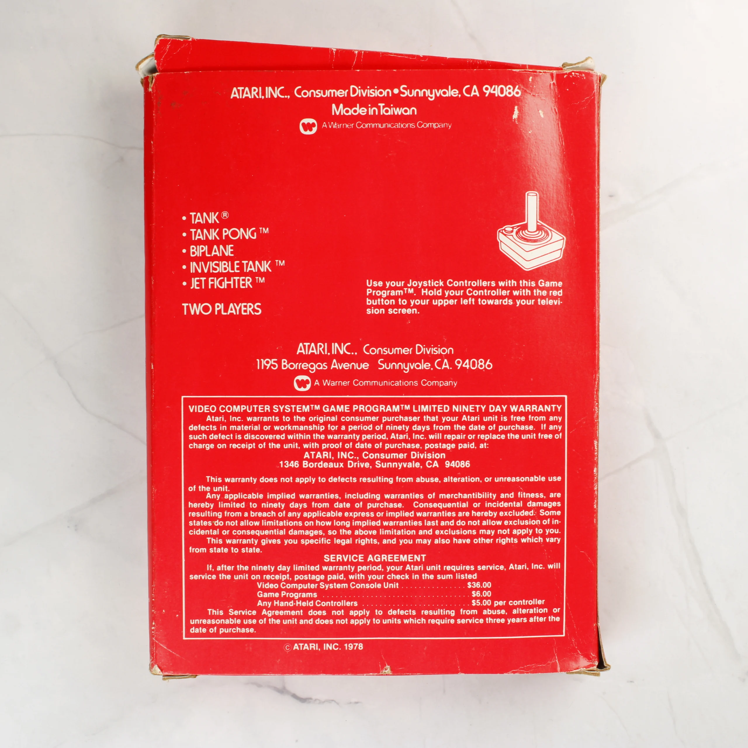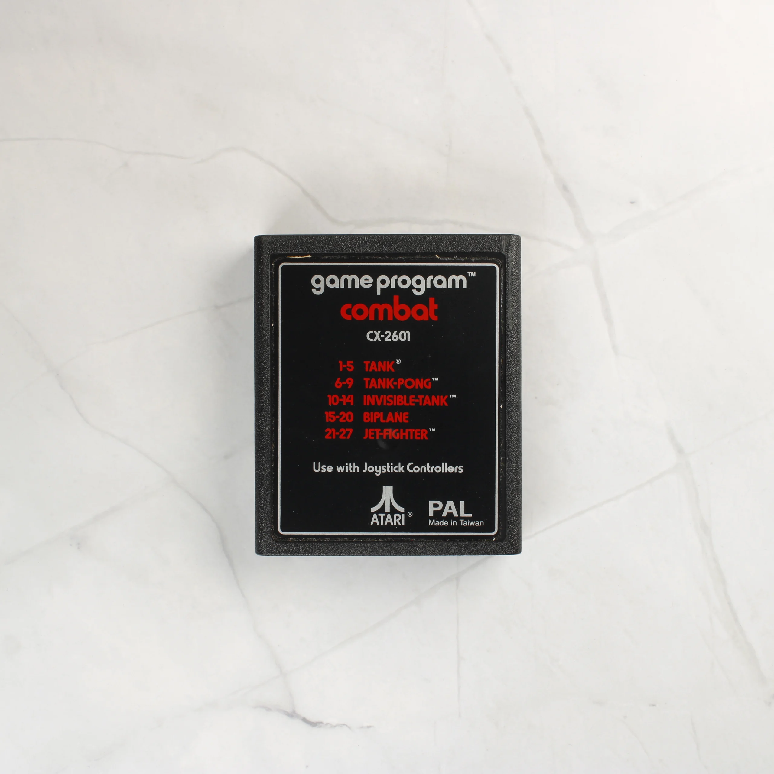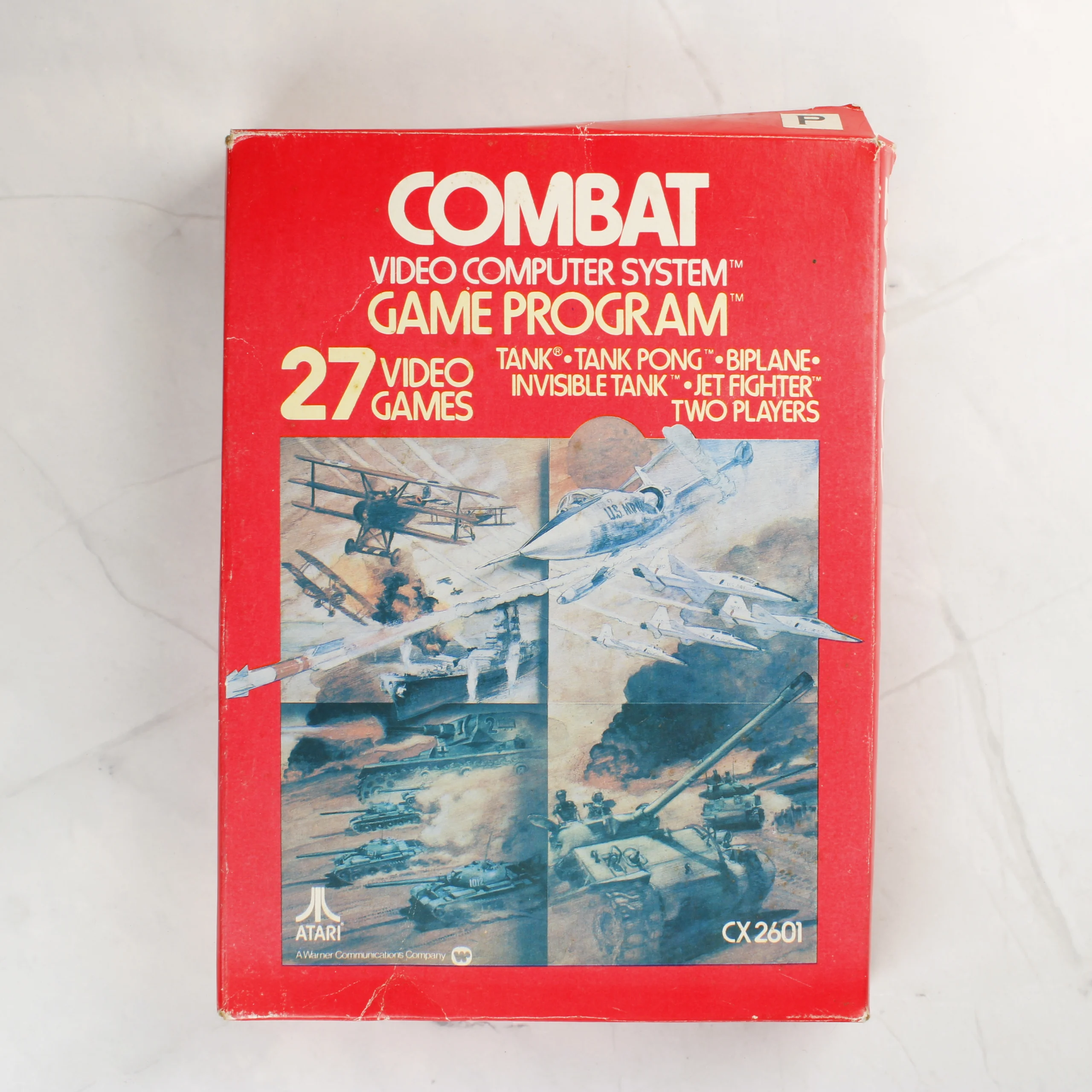 Egy eredeti Atari 2600 videójáték, a Combat című program dobozos kiadása. A csomag tartalmazza a piros alapszínű papírdobozt és a fekete műanyag házas cartridge-et. A doboz elején látványos illusztrációk láthatók repülőgépekről és tankokról, valamint a CX 2601-es modellszám. A hátoldalon a játékvariációk listája és a garanciális információk olvashatók. A cartridge fekete címkéjén piros és fehér feliratok jelzik a játéktípusokat, és jól látható rajta az Atari logó, valamint a PAL régiókód. A termék a Warner Communications korszakából származik, Tajvanon készült.