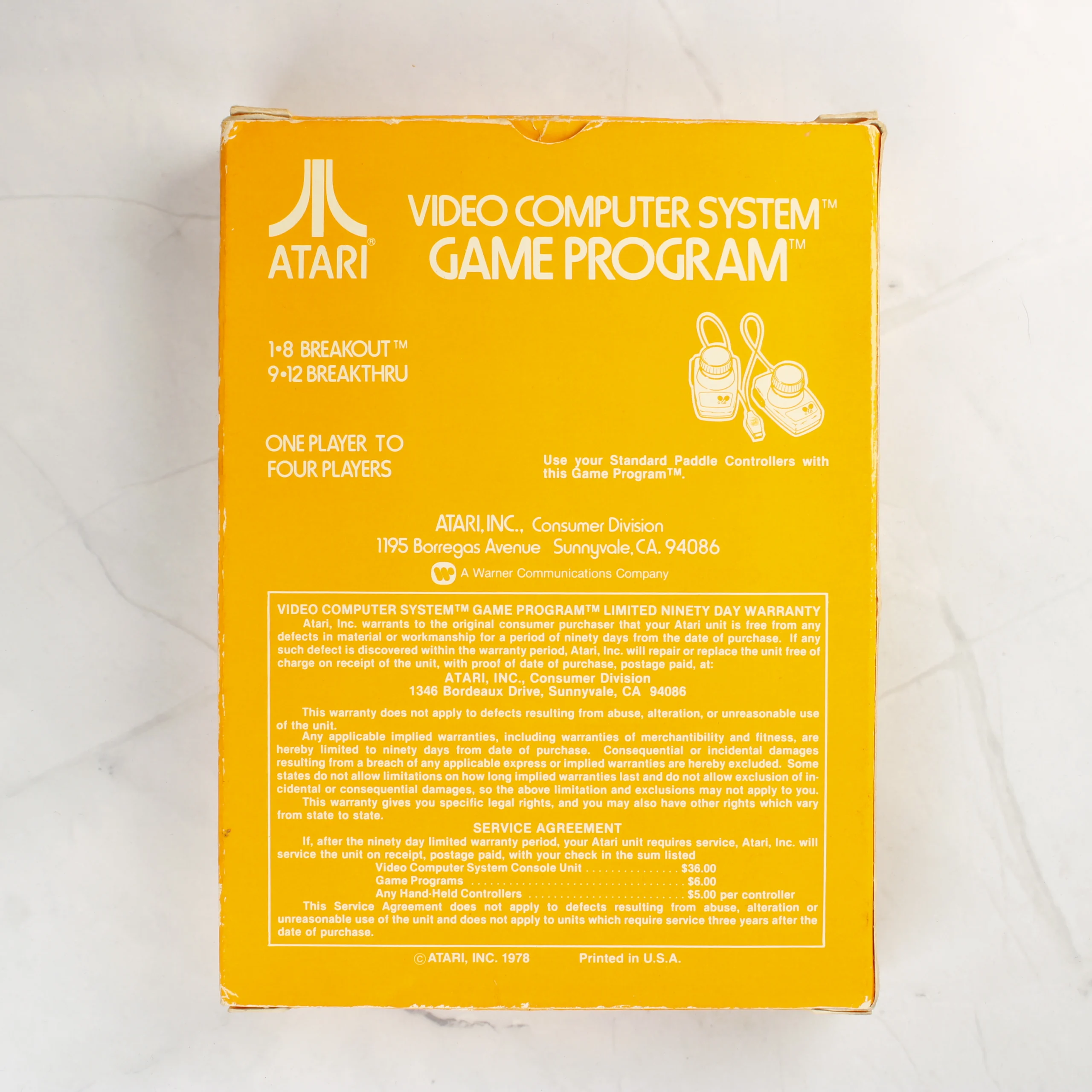 Az Atari 2600 konzolhoz készült Breakout videójáték eredeti sárga kartondobozos kiadása. A csomag tartalmazza a fekete műanyag házas cartridge-et is, amelyen a játék címe és a CX-2622-P modellszám látható. A doboz elején színes illusztráció látható, amely sportolókat ábrázol, felette fehér és piros feliratokkal. A hátoldalon a használati utasítások, a garanciális feltételek és az 1978-as szerzői jogi évszám olvasható. A doboz élei mentén kopások és kisebb benyomódások láthatóak, különösen a sarkoknál és a nyitófül környékén. A cartridge címkéje tiszta, a feliratok jól olvashatóak. A termék az eredeti amerikai kiadás, amit a doboz alján található Printed in U.S.A. felirat is igazol.