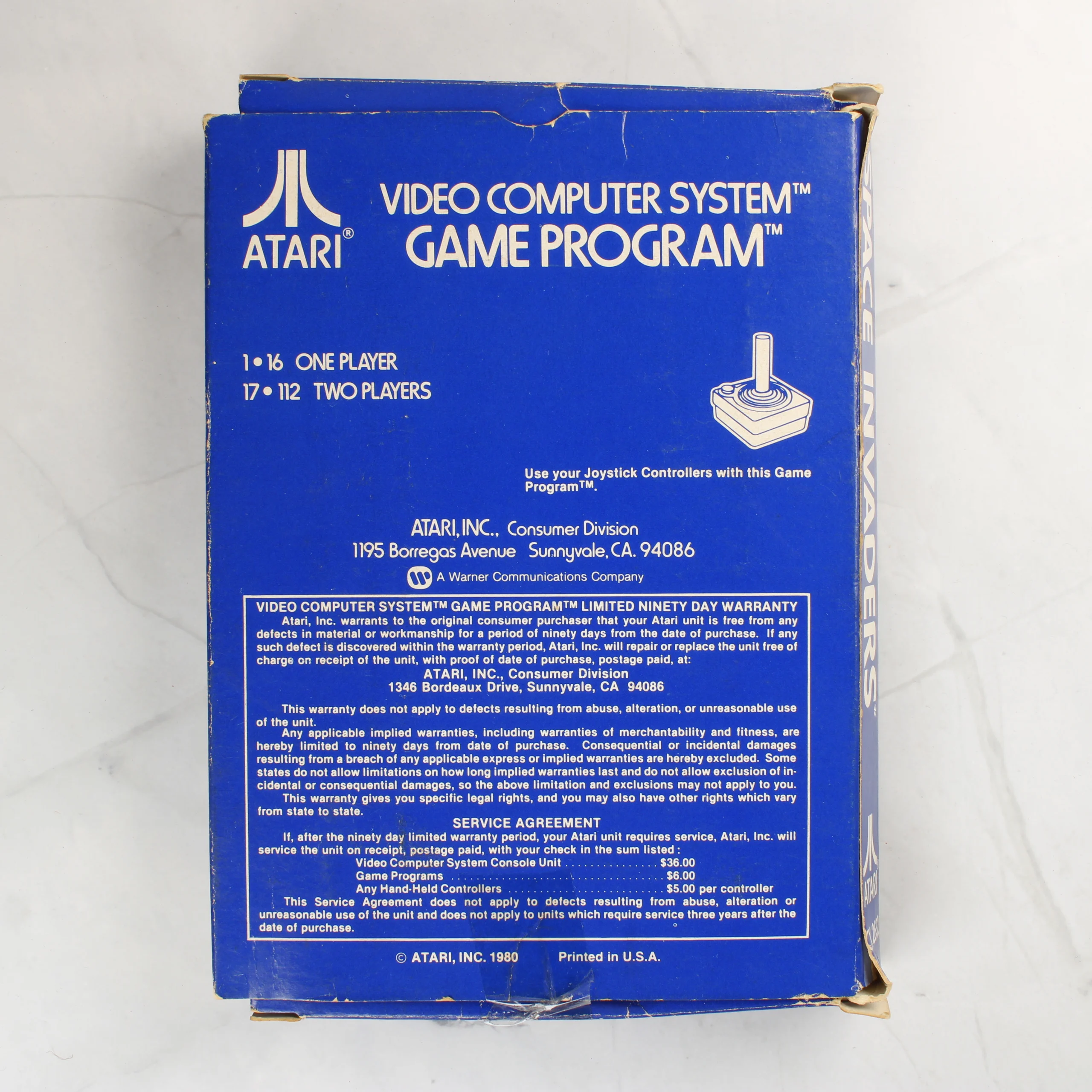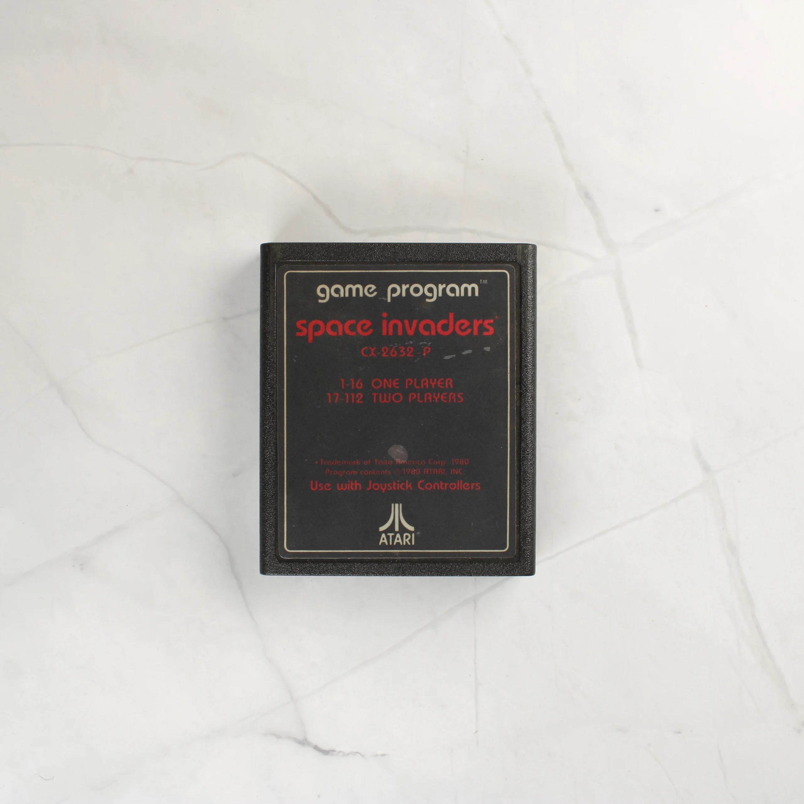 Az Atari 2600 konzolhoz készült Space Invaders videójáték eredeti dobozos kiadása. A kék színű kartondoboz elején színes illusztráció látható, amely egy idegen űrhajót ábrázol. A csomagolás tartalmazza a fekete műanyag házas játék cartridge-et is, amelyen piros felirattal szerepel a játék címe és a CX-2632-P modellszám. A doboz élei és sarkai láthatóan kopottak, a karton több helyen megtört, különösen a nyitófüleknél és a széleken. A hátoldalon a garanciális információk és a használati utasítás rövidített változata olvasható angol nyelven. A cartridge címkéje viszonylag ép, de apróbb felületi karcok és használati nyomok felfedezhetők rajta.