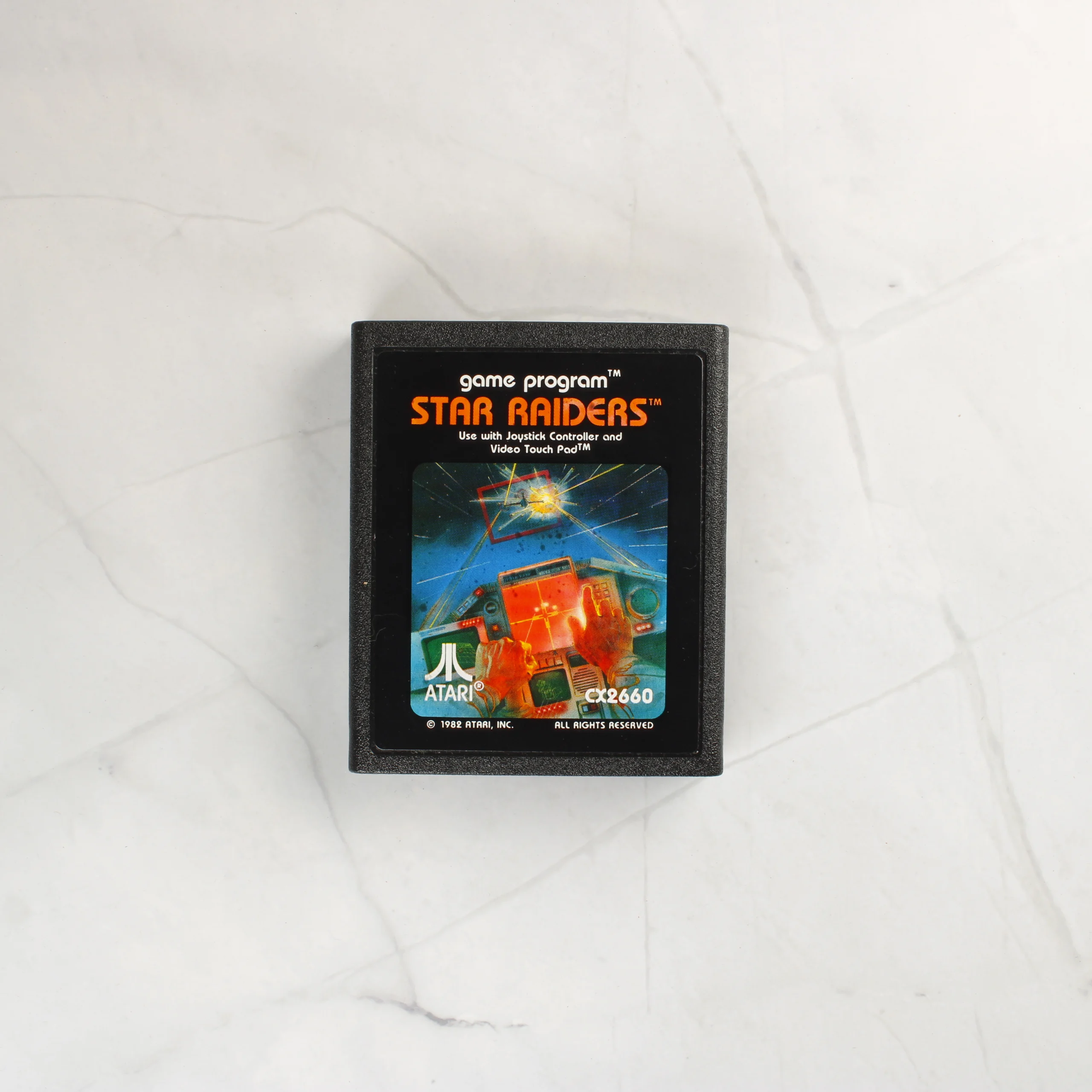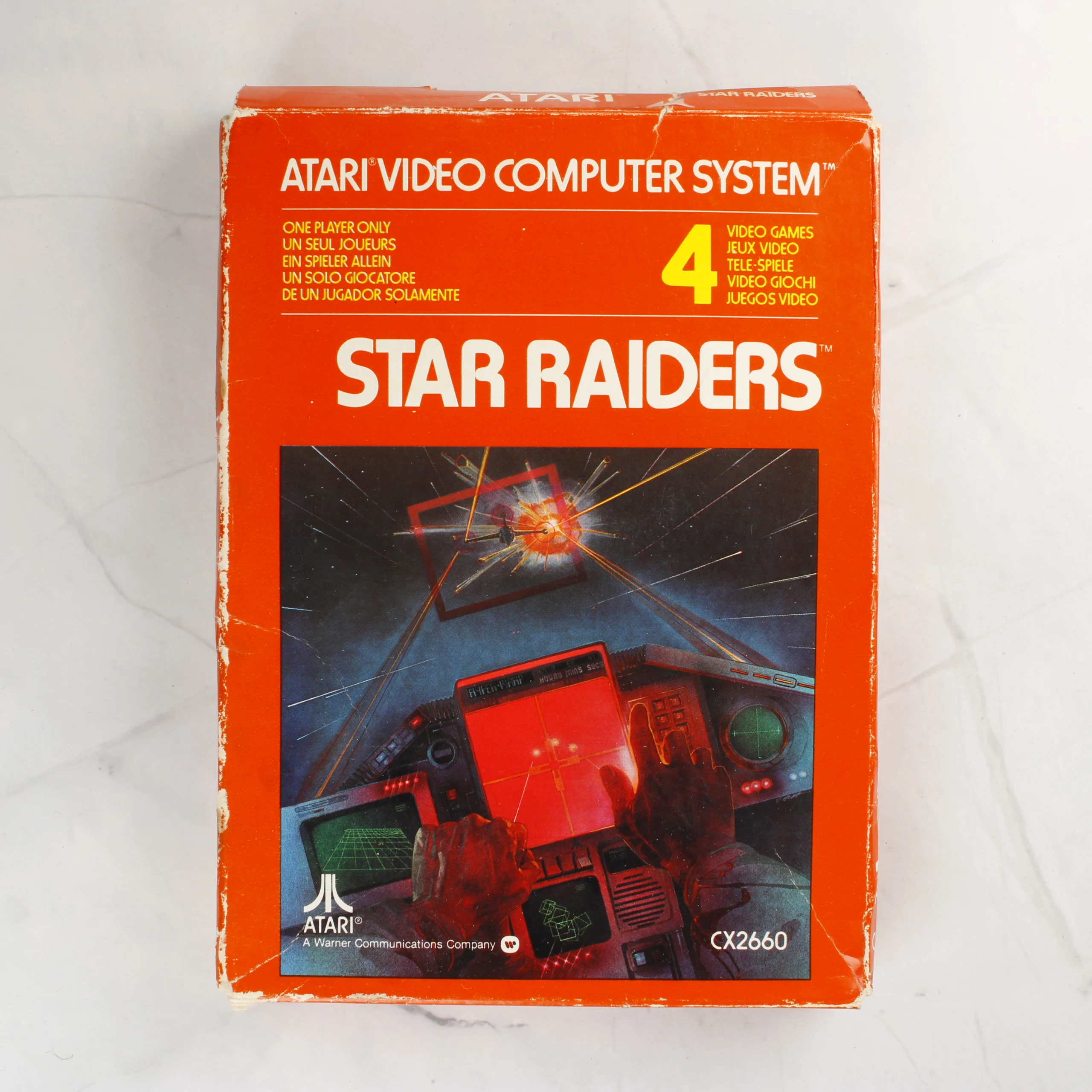 Az Atari 2600 konzolhoz készült Star Raiders videójáték eredeti kartondobozos kiadása. A csomag tartalmazza a fekete műanyag házas játék cartridge-et, amelyen színes illusztráció és a CX2660-as modellszám látható. A narancssárga alapszínű papírdoboz elején egy űrhajó pilótafülkéjéből látható jelenet szerepel, hátoldalán pedig többnyelvű (angol, német, francia, olasz, spanyol) játékleírás és egy képernyőkép található. A doboz élei mentén látható kopások, kisebb benyomódások és fehér színű festékhiányok utalnak a használatra és az életkorra. A cartridge címkéje ép, a grafika jól kivehető. A termék az 1982-es kiadásból származik.